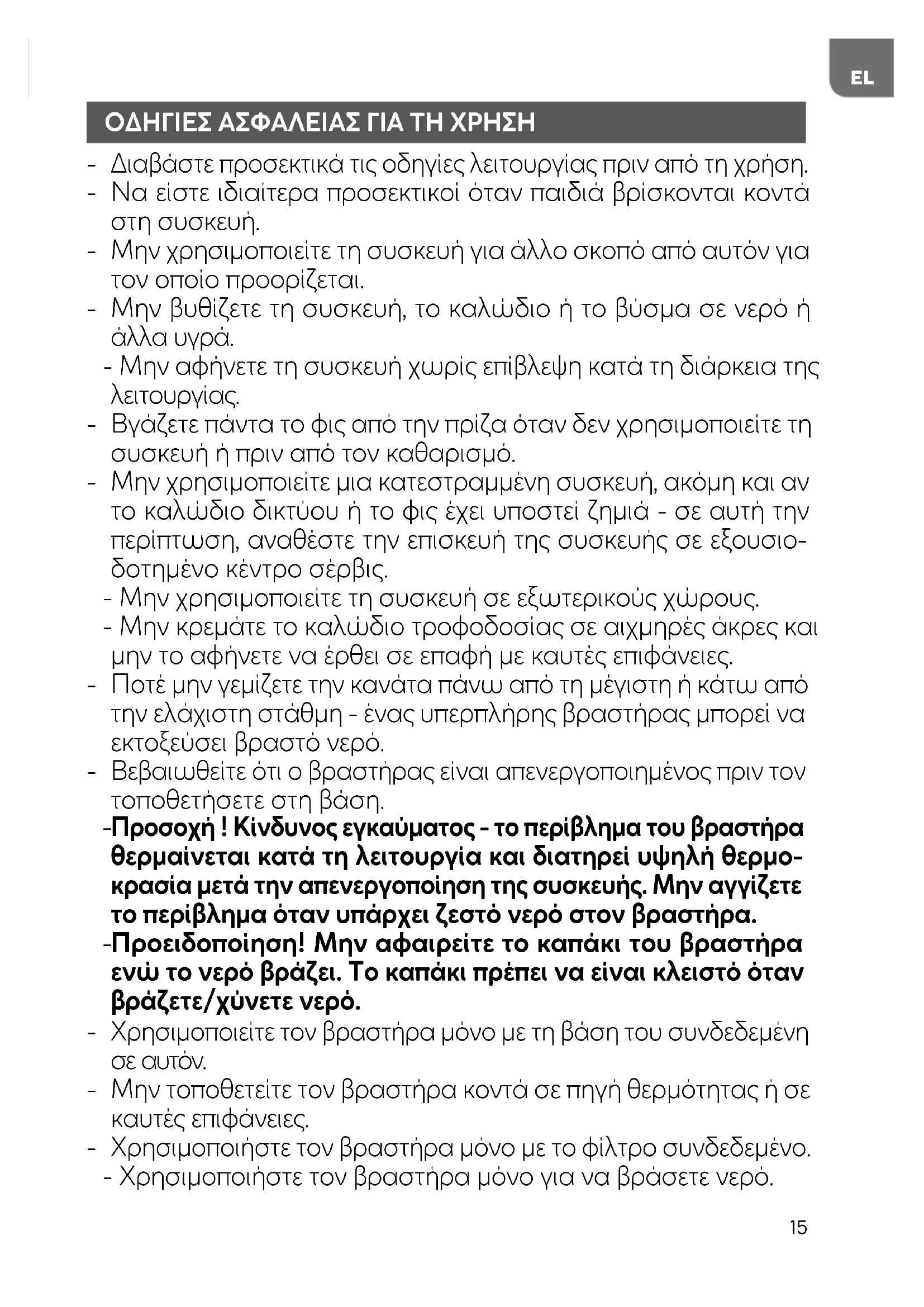 Χρησιμοποιήστε τον βραστήρα μόνο με το φίλτρο συνδεδεμένο. - Χρησιμοποιήστε τον βραστήρα μόνο για να βράσετε νερό.16