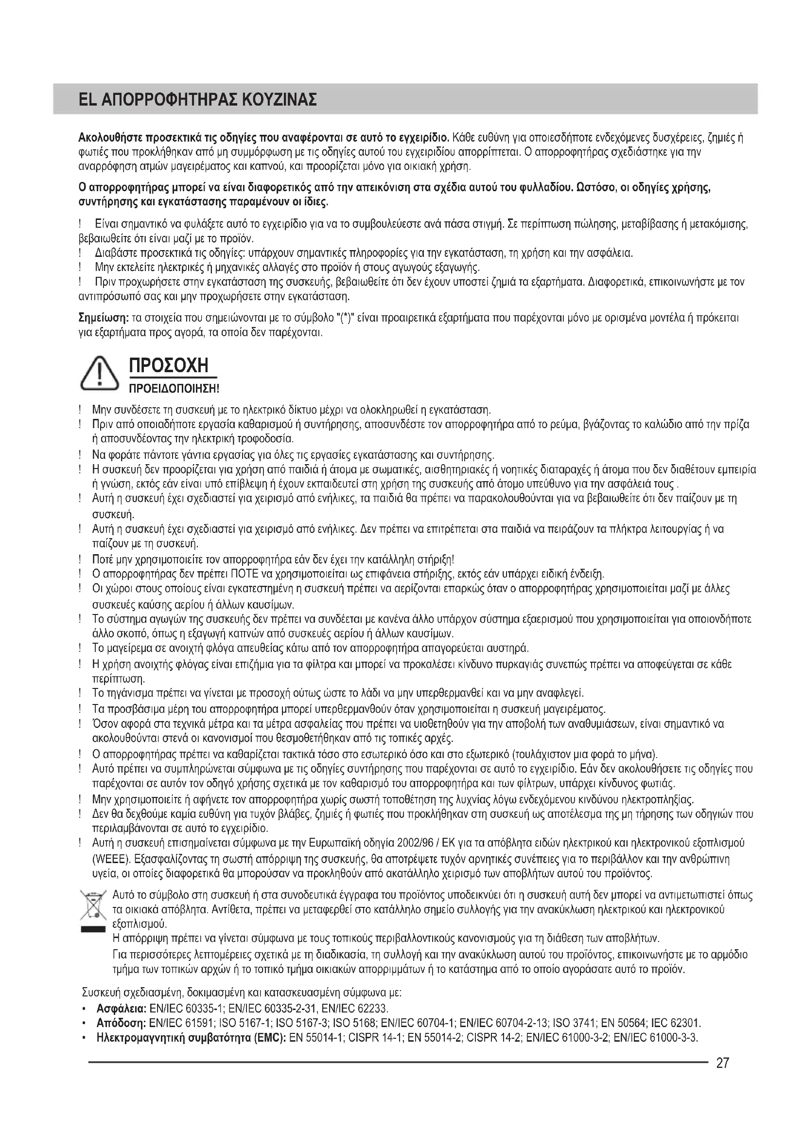! Το τηγάνισμα πρέπει να γίνεται με προσοχή ούτως ώστε το λάδι να μην υπερθερμανθεί και να μην αναφλεγεί. ! Τα προσβάσιμα μέρη του απορροφητήρα μπορεί υπερθερμανθούν όταν χρησιμοποιείται η συσκευή μαγειρέματος. ! Όσον αφορά στα τεχνικά μέτρα και τα μέτρα ασφαλείας που πρέπει να υιοθετηθούν για την αποβολή των αναθυμιάσεων, είναι σημαντικό να ακολουθούνται στενά οι κανονισμοί που θεσμοθετήθηκαν από τις τοπικές αρχές. ! Ο απορροφητήρας πρέπει να καθαρίζεται τακτικά τόσο στο εσωτερικό όσο και στο εξωτερικό (τουλάχιστον μια φορά το μήνα). ! Αυτό πρέπει να συμπληρώνεται σύμφωνα με τις οδηγίες συντήρησης που παρέχονται σε αυτό το εγχειρίδιο. Εάν δεν ακολουθήσετε τις οδηγίες που παρέχονται σε αυτόν τον οδηγό χρήσης σχετικά με τον καθαρισμό του απορροφητήρα και των φίλτρων, υπάρχει κίνδυνος φωτιάς. ! Μην χρησιμοποιείτε ή αφήνετε τον απορροφητήρα χωρίς σωστή τοποθέτηση της λυχνίας λόγω ενδεχόμενου κινδύνου ηλεκτροπληξίας. ! Δεν θα δεχθούμε καμία ευθύνη για τυχόν βλάβες, ζημιές ή φωτιές που προκλήθηκαν στη συσκευή ως αποτέλεσμα της μη τήρησης των οδηγιών που περιλαμβάνονται σε αυτό το εγχειρίδιο. ! Αυτή η συσκευή επισημαίνεται σύμφωνα με την Ευρωπαϊκή οδηγία 2002/96 / ΕΚ για τα απόβλητα ειδών ηλεκτρικού και ηλεκτρονικού εξοπλισμού (WEEE). Εξασφαλίζοντας τη σωστή απόρριψη της συσκευής, θα αποτρέψετε τυχόν αρνητικές συνέπειες για το περιβάλλον και την ανθρώπινη υγεία, οι οποίες διαφορετικά θα μπορούσαν να προκληθούν από ακατάλληλο χειρισμό των αποβλήτων αυτού του προϊόντος. Ο απορροφητήρας μπορεί να είναι διαφορετικός από την απεικόνιση στα σχέδια αυτού του φυλλαδίου. Ωστόσο, οι οδηγίες χρήσης, συντήρησης και εγκατάστασης παραμένουν οι ίδιες.