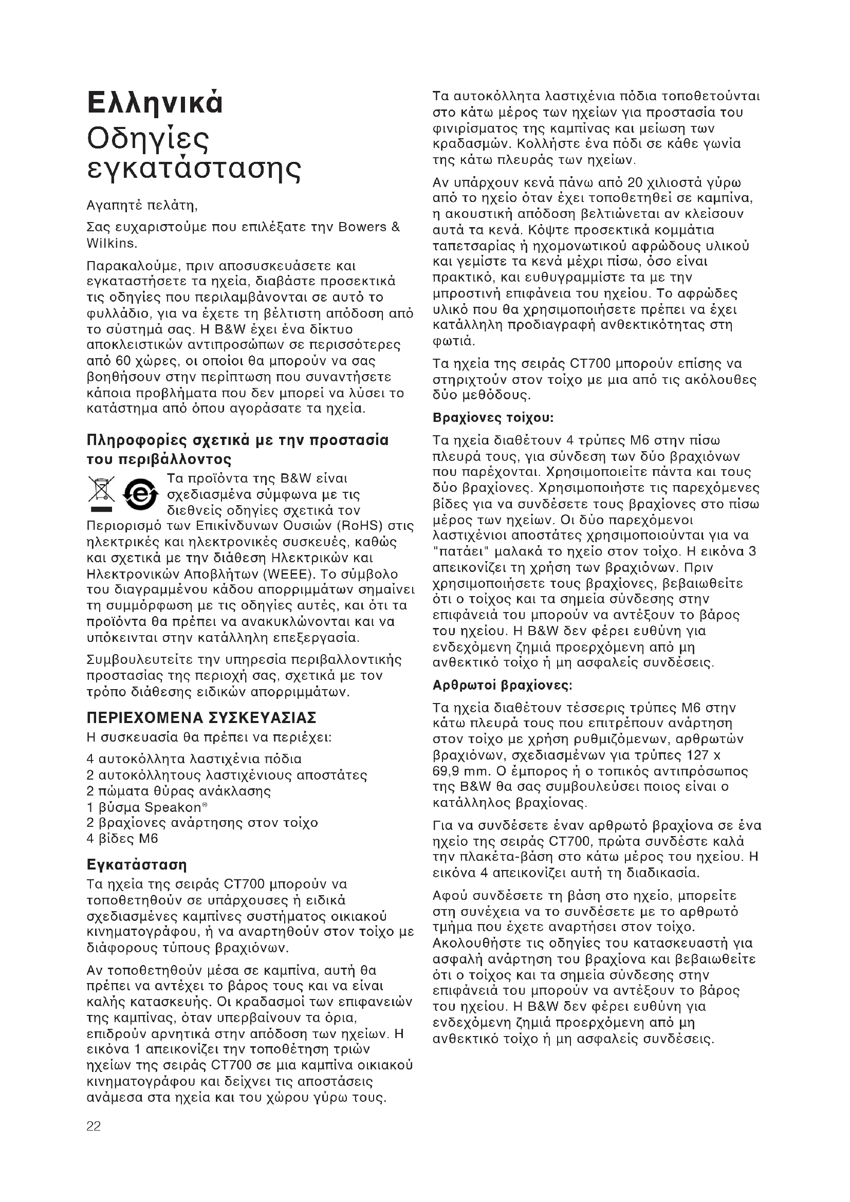 εγκατάστασης Αγαπητέ πελάτη, Σας ευχαριστούμε που επιλέξατε την Bowers & Wilkins. Παρακαλούμε, πριν αποσυσκευάσετε και εγκαταστήσετε τα ηχεία, διαβάστε προσεκτικά τις οδηγίες που περιλαμβάνονται σε αυτ το φυλλάδιο, για να έχετε τη βέλτιστη απδοση απ το σύστημά σας. Η B&W έχει ένα δίκτυο αποκλειστικών αντιπροσώπων σε περισστερες απ 60 χώρες, οι οποίοι θα μπορούν να σας βοηθήσουν στην περίπτωση που συναντήσετε κάποια προβλήματα που δεν μπορεί να λύσει το κατάστημα απ που αγοράσατε τα ηχεία. Πληροφορίες σχετικά με την προστασία του περιβάλλοντος Τα προϊντα της B&W είναι σχεδιασμένα σύμφωνα με τις διεθνείς οδηγίες σχετικά τον Περιορισμ των Επικίνδυνων Ουσιών (RoHS) στις ηλεκτρικές και ηλεκτρονικές συσκευές, καθώς και σχετικά με την διάθεση Ηλεκτρικών και Ηλεκτρονικών Αποβλήτων (WEEE). Το σύμβολο του διαγραμμένου κάδου απορριμμάτων σημαίνει τη συμμρφωση με τις οδηγίες αυτές, και τι τα προϊντα θα πρέπει να ανακυκλώνονται και να υπκεινται στην κατάλληλη επεξεργασία. Συμβουλευτείτε την υπηρεσία περιβαλλοντικής προστασίας της περιοχή σας, σχετικά με τον τρπο διάθεσης ειδικών απορριμμάτων. ΠΕΡΙΕΧΟΜΕΝΑ ΣΥΣΚΕΥΑΣΙΑΣ Η συσκευασία θα πρέπει να περιέχει: 4 αυτοκλλητα λαστιχένια πδια 2 αυτοκλλητους λαστιχένιους αποστάτες 2 πώματα θύρας ανάκλασης 1 βύσμα Speakon
