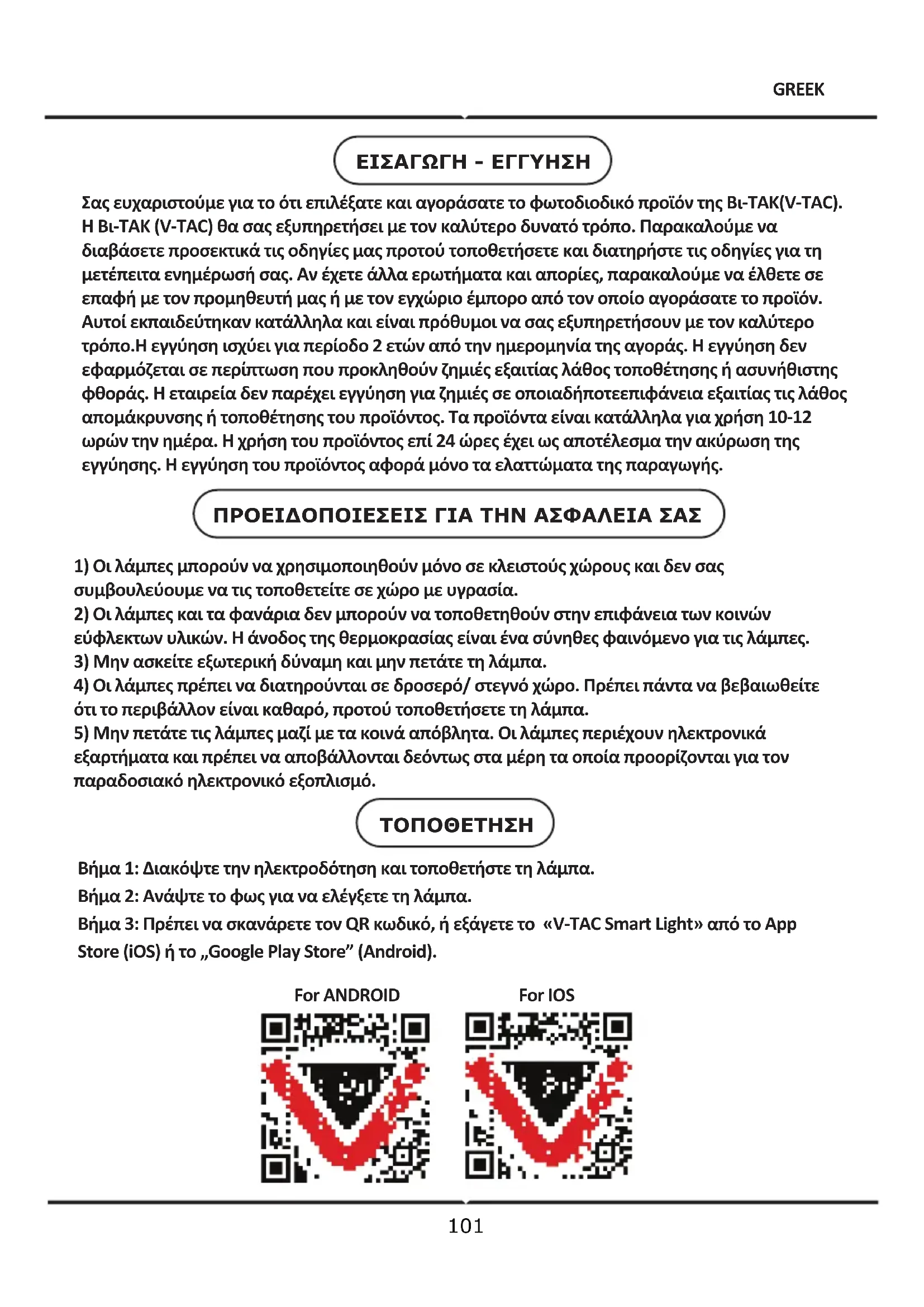 εξαρτήματα και πρέπει να αποβάλλονται δεόντως στα μέρη τα οποία προορίζονται για τον παραδοσιακό ηλεκτρονικό εξοπλισμό. ΕΙΣΑΓΩΓΗ - ΕΓΓΥΗΣΗ Σας ευχαριστούμε για το ότι επιλέξατε και αγοράσατε το φωτοδιοδικό προϊόν της Βι-ΤΑΚ(V-TAC). Η Βι-ΤΑΚ (V-TAC) θα σας εξυπηρετήσει με τον καλύτερο δυνατό τρόπο. Παρακαλούμε να διαβάσετε προσεκτικά τις οδηγίες μας προτού τοποθετήσετε και διατηρήστε τις οδηγίες για τη μετέπειτα ενημέρωσή σας. Αν έχετε άλλα ερωτήματα και απορίες, παρακαλούμε να έλθετε σε επαφή με τον προμηθευτή μας ή με τον εγχώριο έμπορο από τον οποίο αγοράσατε το προϊόν. Αυτοί εκπαιδεύτηκαν κατάλληλα και είναι πρόθυμοι να σας εξυπηρετήσουν με τον καλύτερο τρόπο.Η εγγύηση ισχύει για περίοδο 2 ετών από την ημερομηνία της αγοράς. Η εγγύηση δεν εφαρμόζεται σε περίπτωση που προκληθούν ζημιές εξαιτίας λάθος τοποθέτησης ή ασυνήθιστης φθοράς. Η εταιρεία δεν παρέχει εγγύηση για ζημιές σε οποιαδήποτεεπιφάνεια εξαιτίας τις λάθος απομάκρυνσης ή τοποθέτησης του προϊόντος. Τα προϊόντα είναι κατάλληλα για χρήση 10-12 ωρών την ημέρα. Η χρήση του προϊόντος επί 24 ώρες έχει ως αποτέλεσμα την ακύρωση της εγγύησης. Η εγγύηση του προϊόντος αφορά μόνο τα ελαττώματα της παραγωγής.