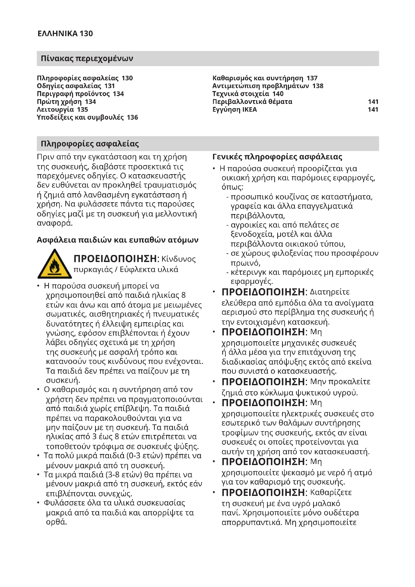 - να ζητήσετε διευκρινίσεις σχετικά με τις λειτουργίες των συσκευών IKEA. Για να διασφαλιστεί η παροχή βέλτιστης υποστήριξης, διαβάστε προσεκτικά τις Οδηγίες συναρμολόγησης ή/και το Εγχειρίδιο χρήσης πριν επικοινωνήσετε μαζί μας.ΕΛΛΗΝΙΚΑ 143 Πώς να επικοινωνήσετε μαζί μας αν χρειαστείτε τις υπηρεσίες μας Στο τέλος αυτού του εγχειριδίου μπορείτε να βρείτε τους αριθμούς τηλεφώνου των παρόχων τεχνικής εξυπηρέτησης της IKEA. Προκειμένου να σας προσφέρουμε ταχύτερη εξυπηρέτηση, συνιστούμε να χρησιμοποιείτε τους αριθμούς τηλεφώνου που αναγράφονται στο παρόν εγχειρίδιο. Πάντα να χρησιμοποιείτε τους αριθμούς κλήσης που αναγράφονται στο εγχειρίδιο χρήστη της εκάστοτε συσκευής για την οποία χρειάζεστε βοήθεια. Μην ξεχάσετε να αναφέρετε τον 8ψήφιο κωδικό προϊόντος και τον 22ψήφιο σειριακό αριθμό που αναγράφονται στην πινακίδα τύπου της συσκευής σας. ΦΥΛΑΞΤΕ ΤΗΝ ΑΠΟΔΕΙΞΗ ΑΓΟΡΑΣ! Αποτελεί αποδεικτικό αγοράς και είναι απαραίτητη ώστε να ισχύει η εγγύηση. Η απόδειξη αγοράς αναγράφει, επίσης, την ονομασία IKEA και τον αριθμό προϊόντος (8ψήφιος κωδικός) για κάθε μία από τις συσκευές που αγοράσατε. Χρειάζεστε περισσότερη βοήθεια; Για οποιαδήποτε περαιτέρω απορία που δεν σχετίζεται με την Υποστήριξη των συσκευών σας, επικοινωνήστε με το τηλεφωνικό κέντρο του πλησιέστερου καταστήματος IKEA. Συνιστάται να διαβάσετε προσεκτικά το εγχειρίδιο της συσκευής πριν επικοινωνήσετε μαζί μας. Πληροφορίες ανταλλακτικών - Τα ακόλουθα ανταλλακτικά: θερμοστάτες, αισθητήρες θερμοκρασίας, πλακέτες τυπωμένων κυκλωμάτων και πηγές φωτός, θα είναι διαθέσιμα σε επαγγελματίες τεχνικούς για ελάχιστη περίοδο επτά ετών, μετά τη διάθεση της τελευταίας μονάδας του μοντέλου στην αγορά. - Τα ακόλουθα ανταλλακτικά: λαβές πόρτας, μεντεσέδες πόρτας, δίσκοι και καλάθια θα είναι διαθέσιμα σε επαγγελματίες τεχνικούς και τελικούς χρήστες για ελάχιστη περίοδο επτά ετών, ενώ τα λάστιχα πόρτας για ελάχιστη περίοδο 10 ετών, μετά τη διάθεση της τελευταίας μονάδας του μοντέλου στην αγορά. Τα ανταλλακτικά μπορείτε να τα βρείτε: www.ikea.comNEDERLANDS 144 Inhoudsopgave Veiligheidsinformatie Lees voor de installatie en het gebruik van het apparaat de meegeleverde instructies zorgvuldig door. De fabrikant is niet verantwoordelijk als onjuiste installatie of verkeerd gebruik verwondingen en schade veroorzaken. Bewaar de instructies altijd bij het apparaat om ze in de toekomst te kunnen raadplegen. Veiligheid van kinderen en kwetsbare mensen WAARSCHUWING : Risico op brand / Ontvlambare materialen