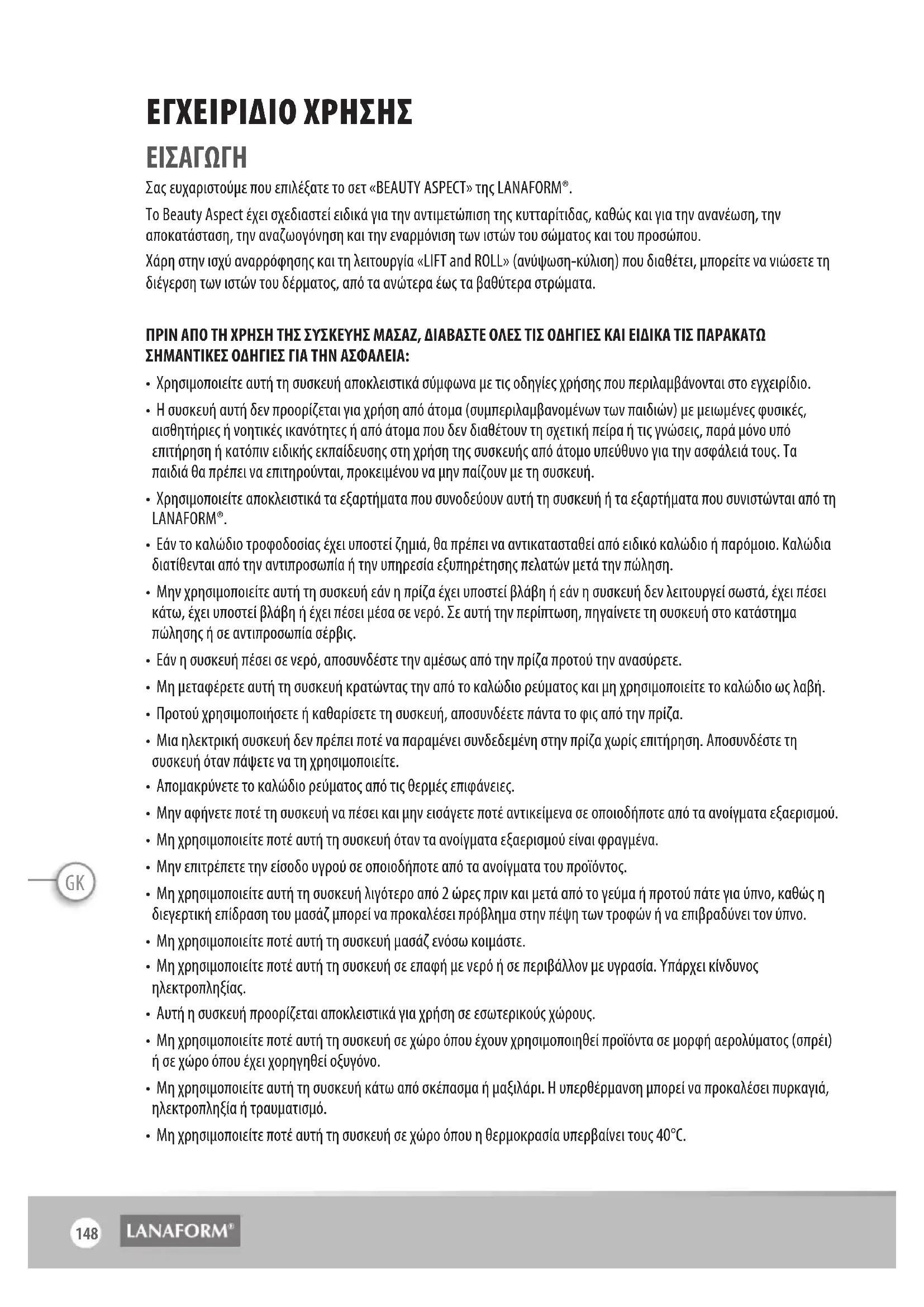 Σας ευχαριστούμε που επιλέξατε το σετ «BEAUTY ASPECT» της LANAFORM®. Το Beauty Aspect έχει σχεδιαστεί ειδικά για την αντιμετώπιση της κυτταρίτιδας, καθώς και για την ανανέωση, την αποκατάσταση, την αναζωογόνηση και την εναρμόνιση των ιστών του σώματος και του προσώπου. Χάρη στην ισχύ αναρρόφησης και τη λειτουργία «LIFT and ROLL» (ανύψωση-κύλιση) που διαθέτει, μπορείτε να νιώσετε τη διέγερση των ιστών του δέρματος, από τα ανώτερα έως τα βαθύτερα στρώματα. ΠΡΙΝ ΑΠΟ ΤΗ ΧΡΗΣΗ ΤΗΣ ΣΥΣΚΕΥΗΣ ΜΑΣΑΖ, ΔΙΑΒΑΣΤΕ ΟΛΕΣ ΤΙΣ ΟΔΗΓΙΕΣ ΚΑΙ ΕΙΔΙΚΑ ΤΙΣ ΠΑΡΑΚΑΤΩ ΣΗΜΑΝΤΙΚΕΣ ΟΔΗΓΙΕΣ ΓΙΑ ΤΗΝ ΑΣΦΑΛΕΙΑ: