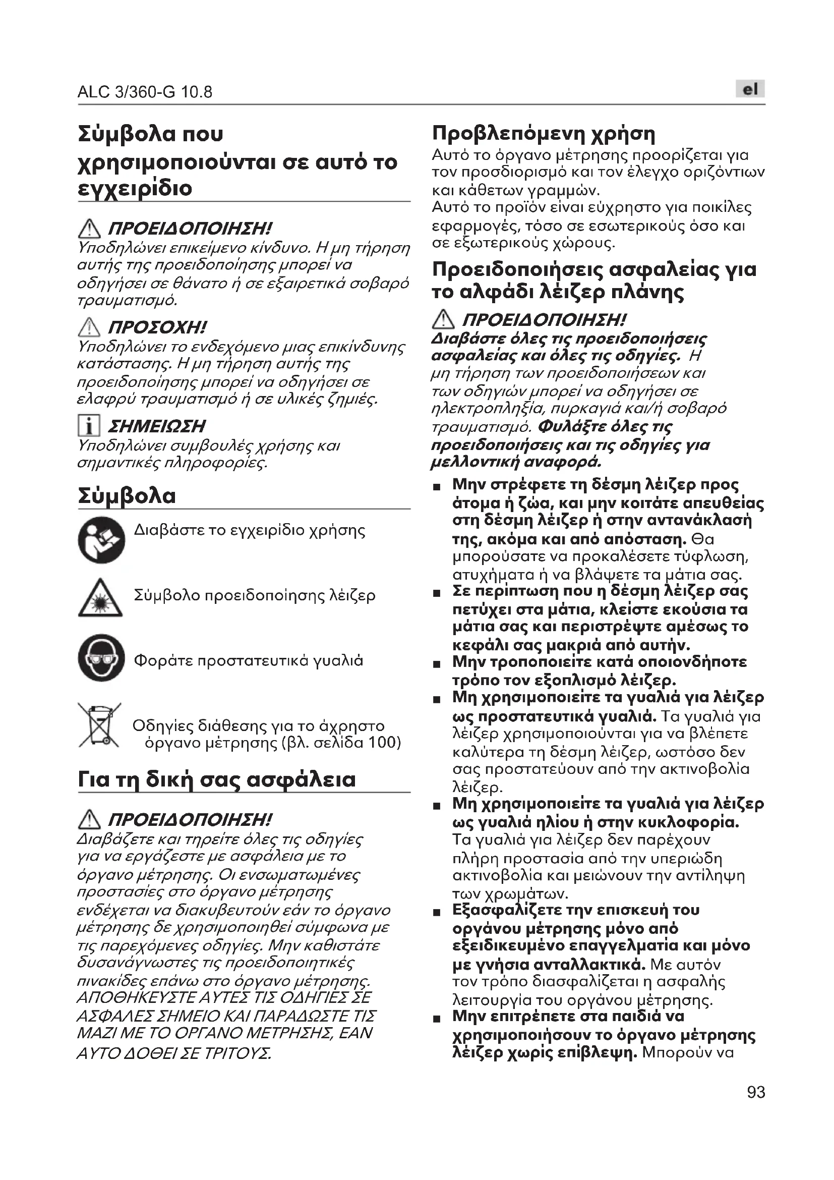 Διαβάστε το εγχειρίδιο χρήσης Σύμβολο προειδοποίησης λέιζερ Φοράτε προστατευτικά γυαλιά Οδηγίες διάθεσης για το άχρηστο όργανο μέτρησης (βλ. σελίδα 100) Για τη δική σας ασφάλεια ΠΡΟΕΙΔΟΠΟΙΗΣΗ! Διαβάζετε και τηρείτε όλες τις οδηγίες για να εργάζεστε με ασφάλεια με το όργανο μέτρησης. Οι ενσωματωμένες προστασίες στο όργανο μέτρησης ενδέχεται να διακυβευτούν εάν το όργανο μέτρησης δε χρησιμοποιηθεί σύμφωνα με τις παρεχόμενες οδηγίες. Μην καθιστάτε δυσανάγνωστες τις προειδοποιητικές πινακίδες επάνω στο όργανο μέτρησης. ΑΠΟΘΗΚΕΥΣΤΕ ΑΥΤΕΣ ΤΙΣ ΟΔΗΓΙΕΣ ΣΕ ΑΣΦΑΛΕΣ ΣΗΜΕΙΟ ΚΑΙ ΠΑΡΑΔΩΣΤΕ ΤΙΣ ΜΑΖΙ ΜΕ ΤΟ ΟΡΓΑΝΟ ΜΕΤΡΗΣΗΣ, ΕΑΝ ΑΥΤΟ ΔΟΘΕΙ ΣΕ ΤΡΙΤΟΥΣ. Προβλεπόμενη χρήση Αυτό το όργανο μέτρησης προορίζεται για τον προσδιορισμό και τον έλεγχο οριζόντιων και κάθετων γραμμών.Αυτό το προϊόν είναι εύχρηστο για ποικίλες εφαρμογές, τόσο σε εσωτερικούς όσο και σε εξωτερικούς χώρους. Προειδοποιήσεις ασφαλείας για το αλφάδι λέιζερ πλάνης ΠΡΟΕΙΔΟΠΟΙΗΣΗ! Διαβάστε όλες τις προειδοποιήσεις ασφαλείας και όλες τις οδηγίες.