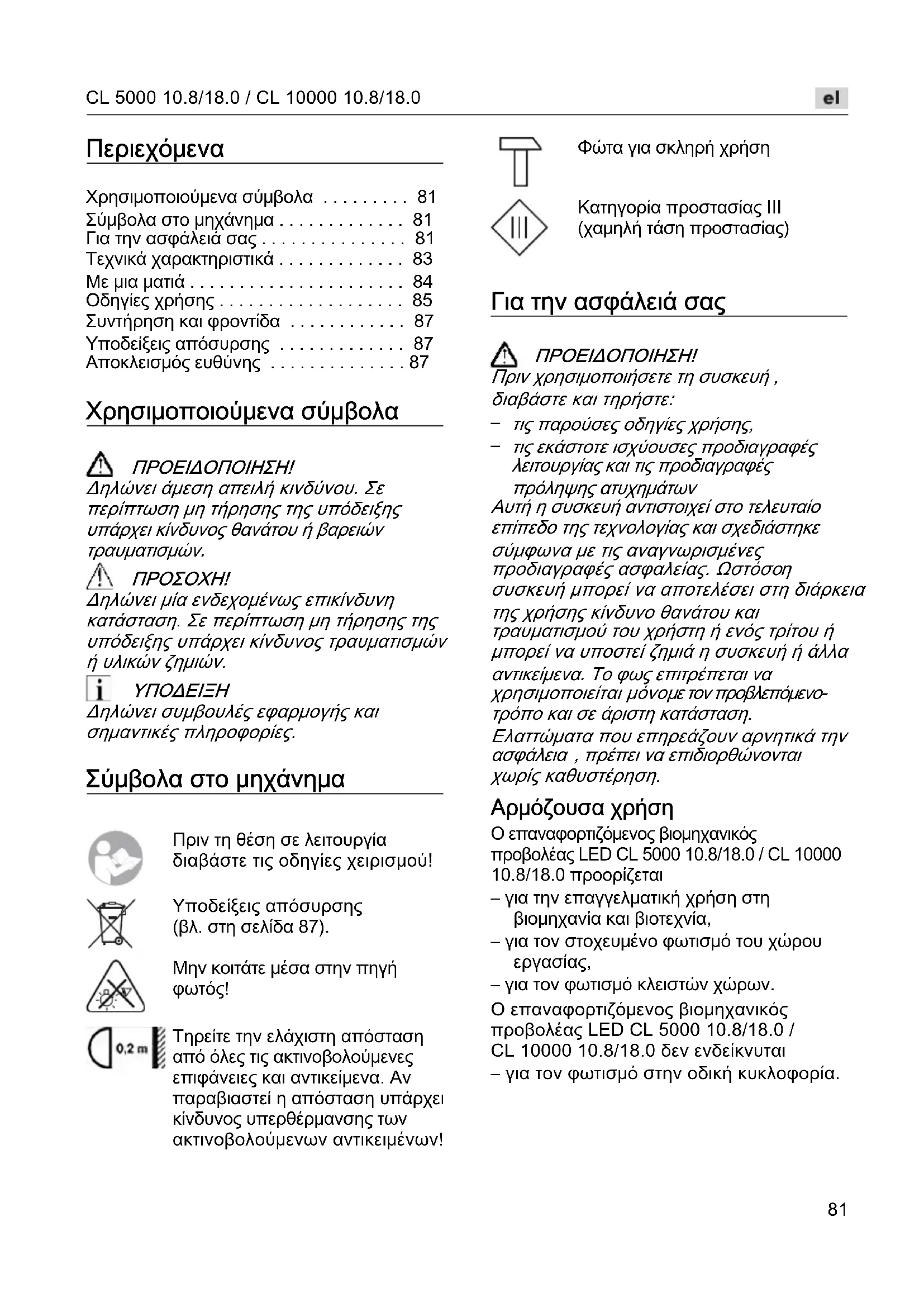 – για τον φωτισμό κλειστών χώρων. Ο επαναφορτιζόμενος βιομηχανικός προβολέας LED CL 5000 10.8/18.0 / CL 10000 10.8/18.0 δεν ενδείκνυται – για τον φωτισμό στην οδική κυκλοφορία. Πριν τη θέση σε λειτουργία διαβάστε τις οδηγίες χειρισμού! Υποδείξεις απόσυρσης (βλ. στη σελίδα 87). Μην κοιτάτε μέσα στην πηγή