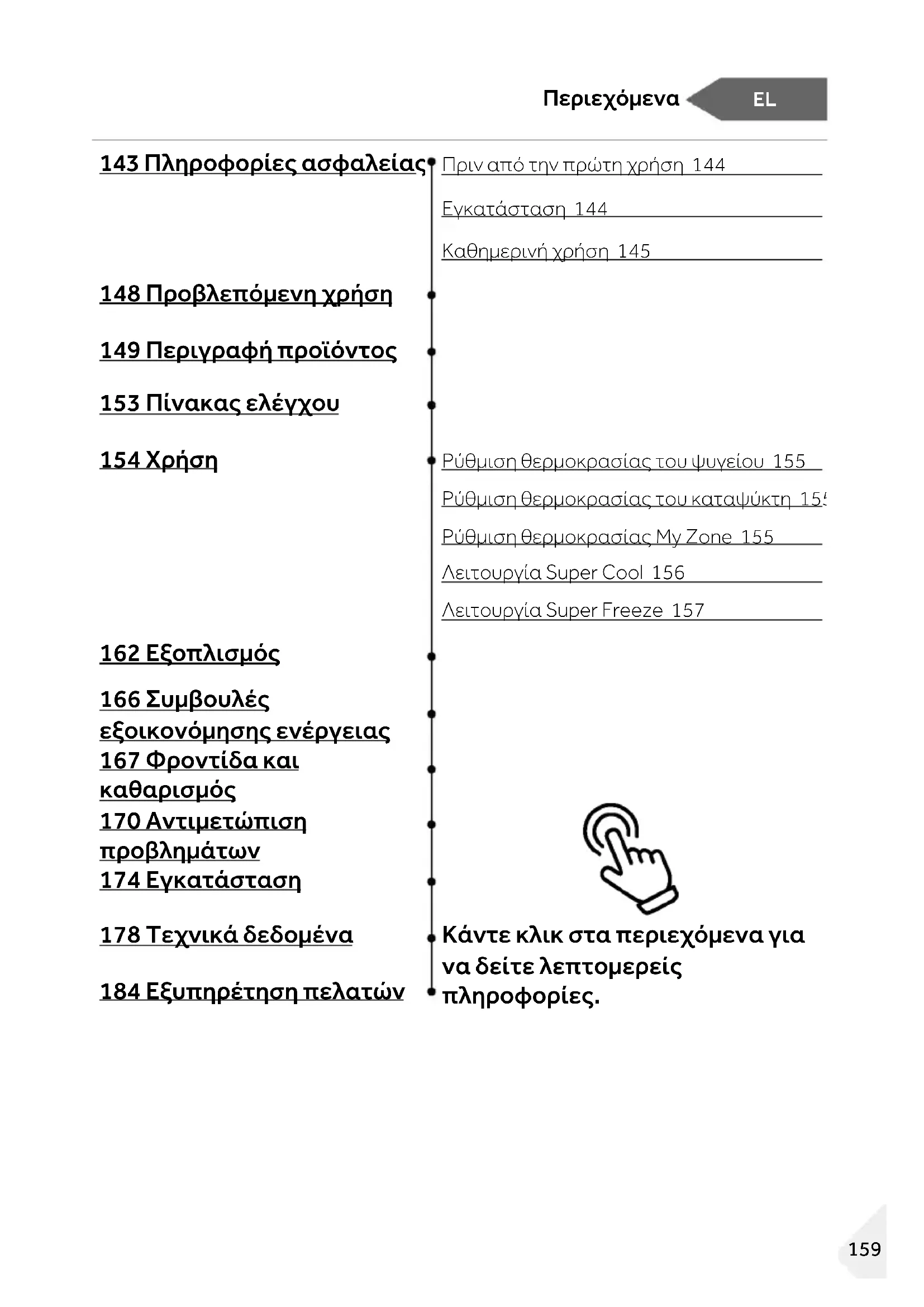 Πριν από την πρώτη χρήση 144 Εγκατάσταση 144 Καθημερινή χρήση 145 148 Προβλεπόμενη χρήση 149 Περιγραφή προϊόντος 153 Πίνακας ελέγχου 154 Χρήση Ρύθμιση θερμοκρασίας του ψυγείου 155 Ρύθμιση θερμοκρασίας του καταψύκτη 155 Ρύθμιση θερμοκρασίας My Zone 155 Λειτουργία Super Cool 156 Λειτουργία Super Freeze 157 162 Εξοπλισμός 166 Συμβουλές εξοικονόμησης ενέργειας 167 Φροντίδα και