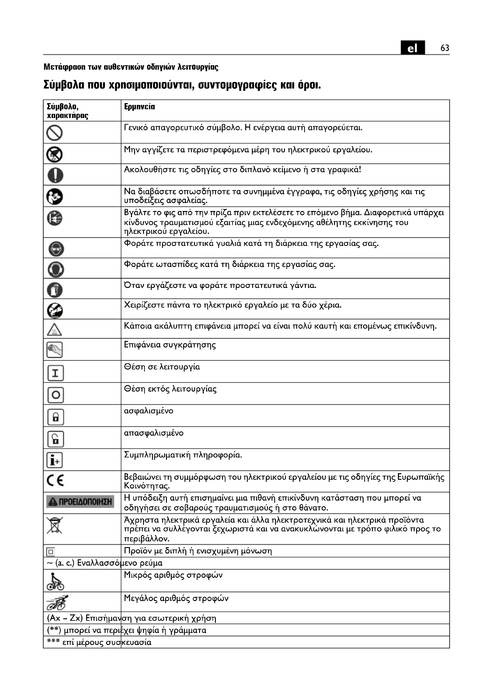 Γενικό απαγορευτικό σύμβολο. Η ενέργεια αυτή απαγορεύεται. Μην αγγίζετε τα περιστρεφόμενα μέρη του ηλεκτρικού εργαλείου. Ακολουθήστε τις οδηγίες στο διπλανό κείμενο ή στα γραφικά! Να διαβάσετε οπωσδήποτε τα συνημμένα έγγραφα, τις οδηγίες χρήσης και τις υποδείξεις ασφαλείας. Βγάλτε το φις από την πρίζα πριν εκτελέσετε το επόμενο βήμα. Διαφορετικά υπάρχει κίνδυνος τραυματισμού εξαιτίας μιας ενδεχόμενης αθέλητης εκκίνησης του ηλεκτρικού εργαλείου. Φοράτε προστατευτικά γυαλιά κατά τη διάρκεια της εργασίας σας. Φοράτε ωτασπίδες κατά τη διάρκεια της εργασίας σας. Όταν εργάζεστε να φοράτε προστατευτικά γάντια. Χειρίζεστε πάντα το ηλεκτρικό εργαλείο με τα δύο χέρια. Κάποια ακάλυπτη επιφάνεια μπορεί να είναι πολύ καυτή και επομένως επικίνδυνη. Επιφάνεια συγκράτησης Θέση σε λειτουργία Θέση εκτός λειτουργίας ασφαλισμένο απασφαλισμένο Συμπληρωματική πληροφορία. Βεβαιώνει τη συμμόρφωση του ηλεκτρικού εργαλείου με τις οδηγίες της Ευρωπαϊκής Κοινότητας. Η υπόδειξη αυτή επισημαίνει μια πιθανή επικίνδυνη κατάσταση που μπορεί να οδηγήσει σε σοβαρούς τραυματισμούς ή στο θάνατο. Άχρηστα ηλεκτρικά εργαλεία και άλλα ηλεκτροτεχνικά και ηλεκτρικά προϊόντα πρέπει να συλλέγονται ξεχωριστά και να ανακυκλώνονται με τρόπο φιλικό προς το περιβάλλον. Προϊόν με διπλή ή ενισχυμένη μόνωση ~ (a. c.) Εναλλασσόμενο ρεύμα Μικρός αριθμός στροφών Μεγάλος αριθμός στροφών (Ax – Zx) Επισήμανση για εσωτερική χρήση (**) μπορεί να περιέχει ψηφία ή γράμματα *** επί μέρους συσκευασία64