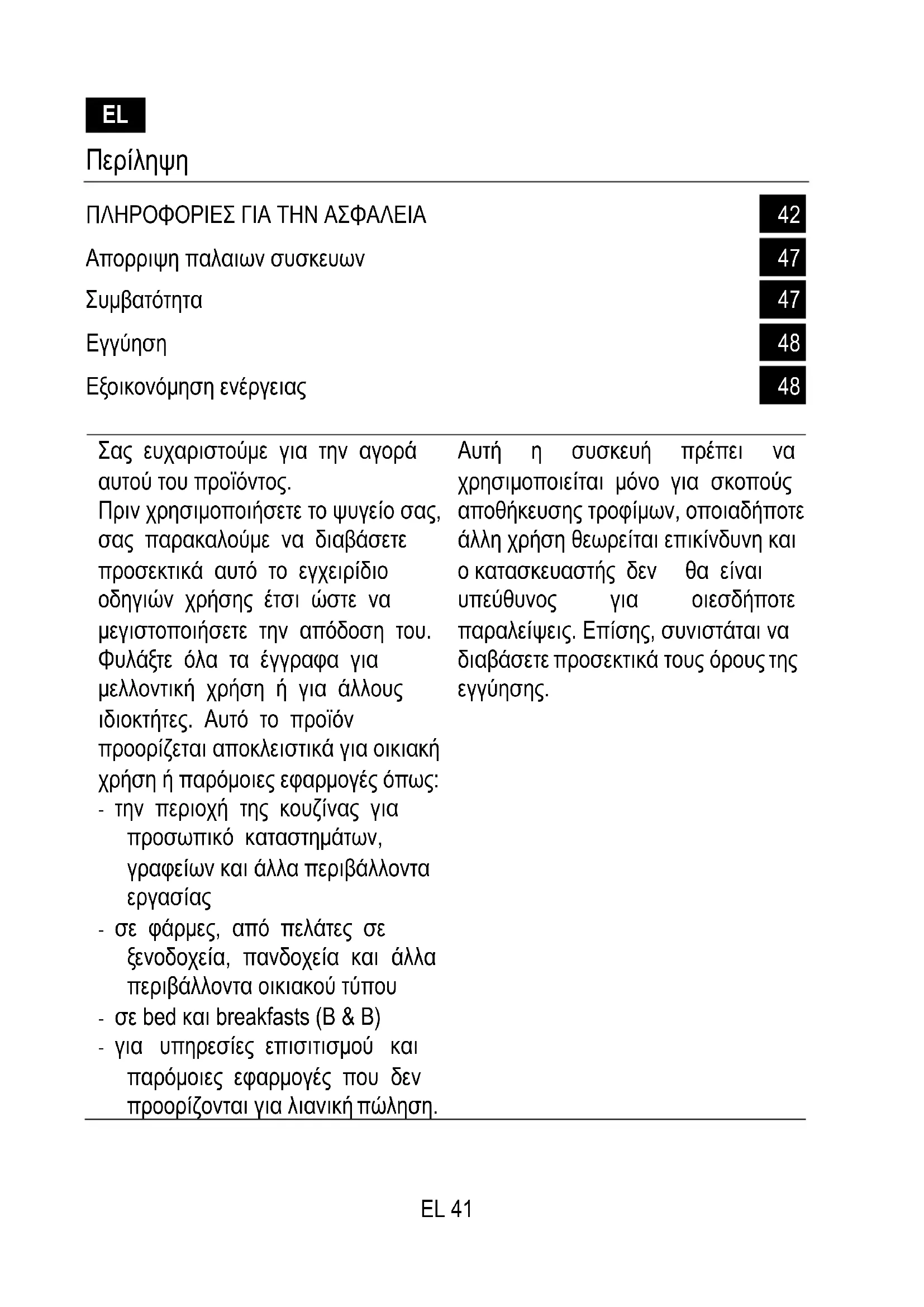 - σε φάρμες, από πελάτες σε ξενοδοχεία, πανδοχεία και άλλα περιβάλλοντα οικιακού τύπου - σε bed και breakfasts (B & B) - για υπηρεσίες επισιτισμού και παρόμοιες εφαρμογές που δεν προορίζονται για λιανική πώληση. Αυτή η συσκευή πρέπει να χρησιμοποιείται μόνο για σκοπούς αποθήκευσης τροφίμων, οποιαδήποτε άλλη χρήση θεωρείται επικίνδυνη και ο κατασκευαστής δεν θα είναι υπεύθυνος για οιεσδήποτε παραλείψεις. Επίσης, συνιστάται να διαβάσετε προσεκτικά τους όρους της εγγύησης.EL 42 ΠΛΗΡΟΦΟΡΙΕΣ ΓΙΑ ΤΗΝ ΑΣΦΑΛΕΙΑ Διαβάστε προσεκτικά τις οδηγίες λειτουργίας και εγκατάστασης! Περιέχουν σημαντικές πληροφορίες σχετικά με τον τρόπο εγκατάστασης, χρήσης και συντήρησης της συσκευής. Ο κατασκευαστής δεν ευθύνεται εάν δεν συμμορφωθείτε με τις οδηγίες και τις προειδοποιήσεις. Διατηρήστε όλα τα έγγραφα για μελλοντική χρήση ή για τον επόμενο κάτοχο.