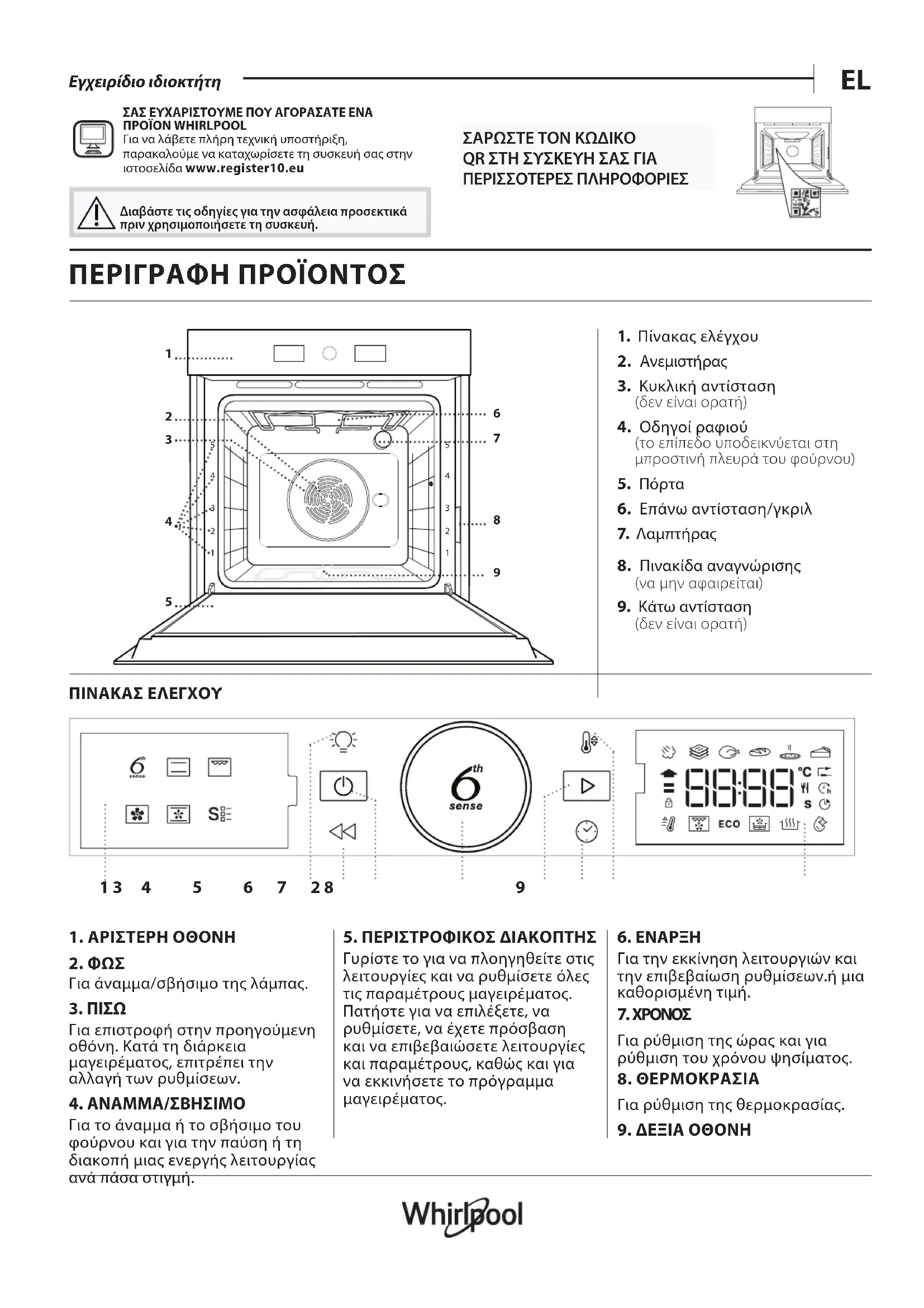- Alternativ können Sie unseren Kundendienst kontaktieren (siehe Telefonnummer im Garantieheft). Wird unser Kundendienst kontaktiert, bitte die Codes auf dem Typenschild des Produkts angeben.®/TM/© 2025 Whirlpool. In Lizenz hergestellt.EL Εγχειρίδιο ιδιοκτήτη ΣΑΣ ΕΥΧΑΡΙΣΤΟΥΜΕ ΠΟΥ ΑΓΟΡΑΣΑΤΕ ΕΝΑ ΠΡΟΪΟΝ WHIRLPOOL Για να λάβετε πλήρη τεχνική υποστήριξη, παρακαλούμε να καταχωρίσετε τη συσκευή σας στην ιστοσελίδα www .register10. eu Διαβάστε τις οδηγίες για την ασφάλεια προσεκτικά πριν χρησιμοποιήσετε τη συσκευή. ΠΕΡΙΓΡΑΦΗ ΠΡΟΪΟΝΤΟΣ ΠΙΝΑΚΑΣ ΕΛΕΓΧΟΥ