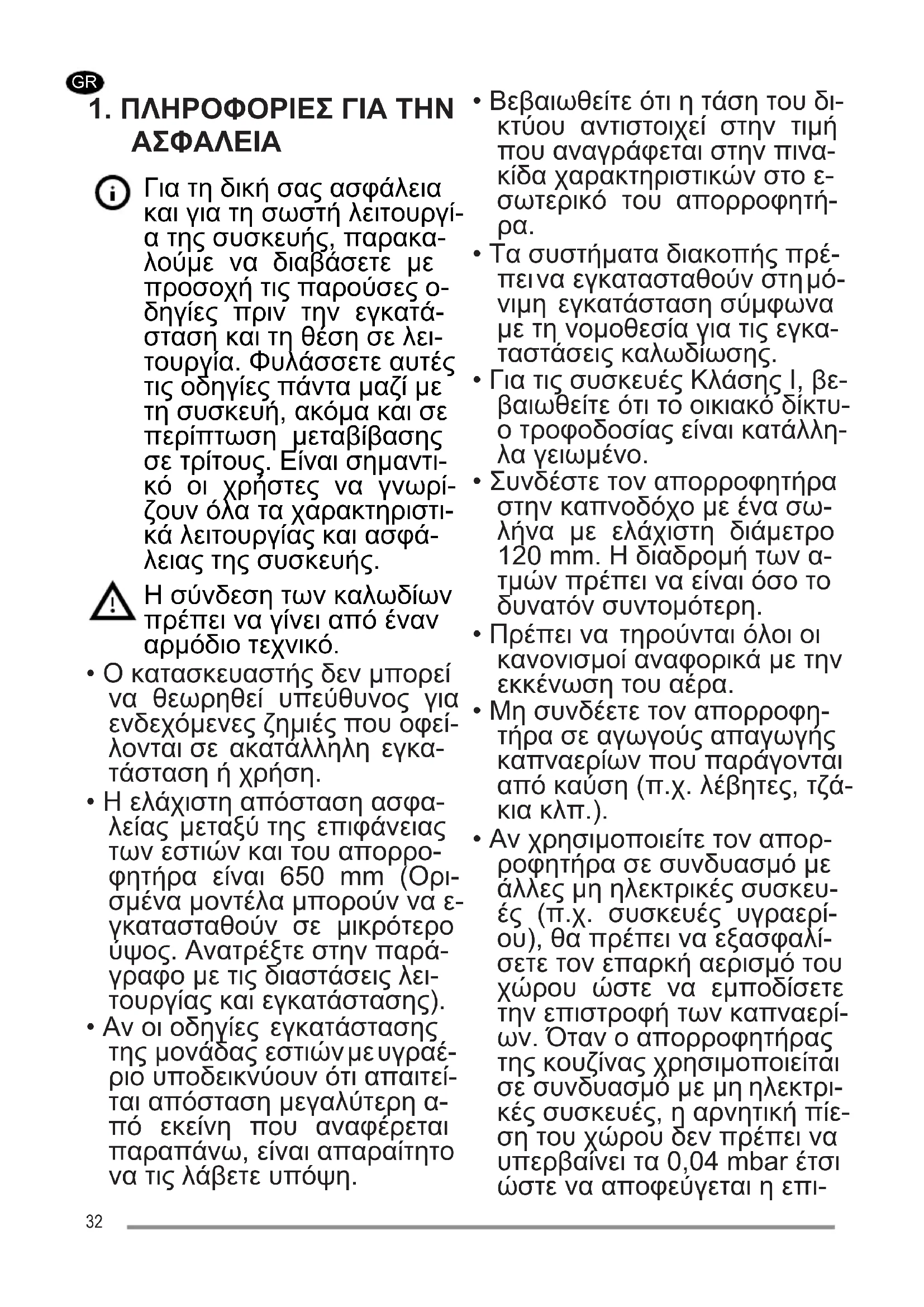 - Αν χρησιμοποιείτε τον απορ- ροφητήρα σε συνδυασμό με άλλες μη ηλεκτρικές συσκευ- ές (π.χ. συσκευές υγραερί- ου), θα πρέπει να εξασφαλί- σετε τον επαρκή αερισμό του χώρου ώστε να εμποδίσετε την επιστροφή των καπναερί- ων. Όταν ο απορροφητήρας της κουζίνας χρησιμοποιείται σε συνδυασμό με μη ηλεκτρι- κές συσκευές, η αρνητική πίε- ση του χώρου δεν πρέπει να υπερβαίνει τα 0,04 mbar έτσι ώστε να αποφεύγεται η επι- 32στροφή των καπναερίων στο χώρο και η αναρρόφησή τους από τον απορροφητήρα.