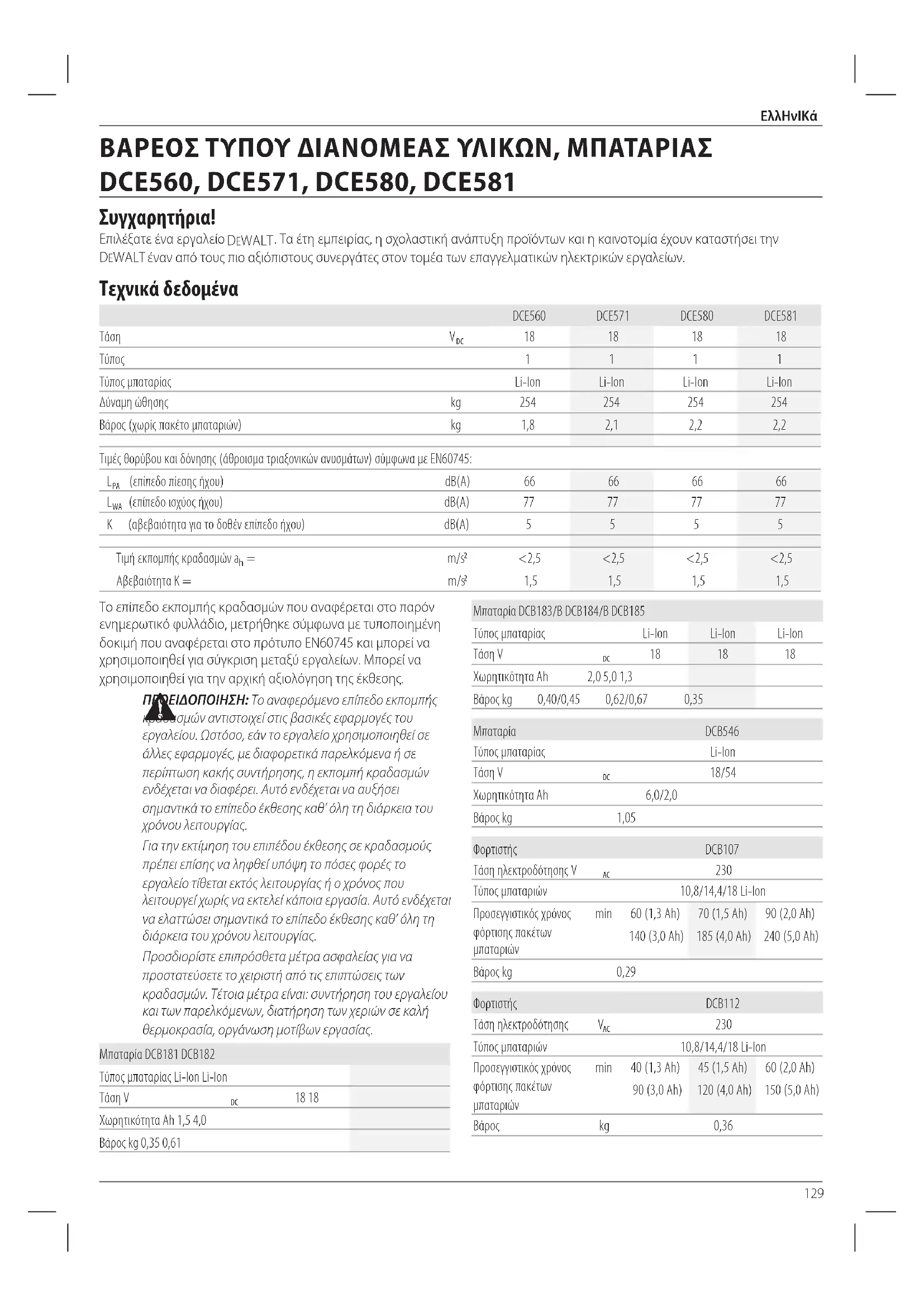 ΠΡΟΕΙΔΟΠΟΙΗΣΗ: Το αναφερόμενο επίπεδο εκπομπής κραδασμών αντιστοιχεί στις βασικές εφαρμογές του εργαλείου. Ωστόσο, εάν το εργαλείο χρησιμοποιηθεί σε άλλες εφαρμογές, με διαφορετικά παρελκόμενα ή σε περίπτωση κακής συντήρησης, η εκπομπή κραδασμών ενδέχεται να διαφέρει. Αυτό ενδέχεται να αυξήσει σημαντικά το επίπεδο έκθεσης καθ’ όλη τη διάρκεια του χρόνουλειτουργίας. Για την εκτίμηση του επιπέδου έκθεσης σε κραδασμούς πρέπει επίσης να ληφθεί υπόψη το πόσες φορές το εργαλείο τίθεται εκτός λειτουργίας ή ο χρόνος που λειτουργεί χωρίς να εκτελεί κάποια εργασία. Αυτό ενδέχεται να ελαττώσει σημαντικά το επίπεδο έκθεσης καθ’ όλη τη διάρκεια του χρόνουλειτουργίας. Προσδιορίστε επιπρόσθετα μέτρα ασφαλείας για να προστατεύσετε το χειριστή από τις επιπτώσεις των κραδασμών. Τέτοια μέτρα είναι: συντήρηση του εργαλείου και των παρελκόμενων, διατήρηση των χεριών σε καλή θερμοκρασία, οργάνωση μοτίβωνεργασίας. Μπαταρία DCB181 DCB182 Τύπος μπαταρίας Li-Ion Li-Ion Τάση V