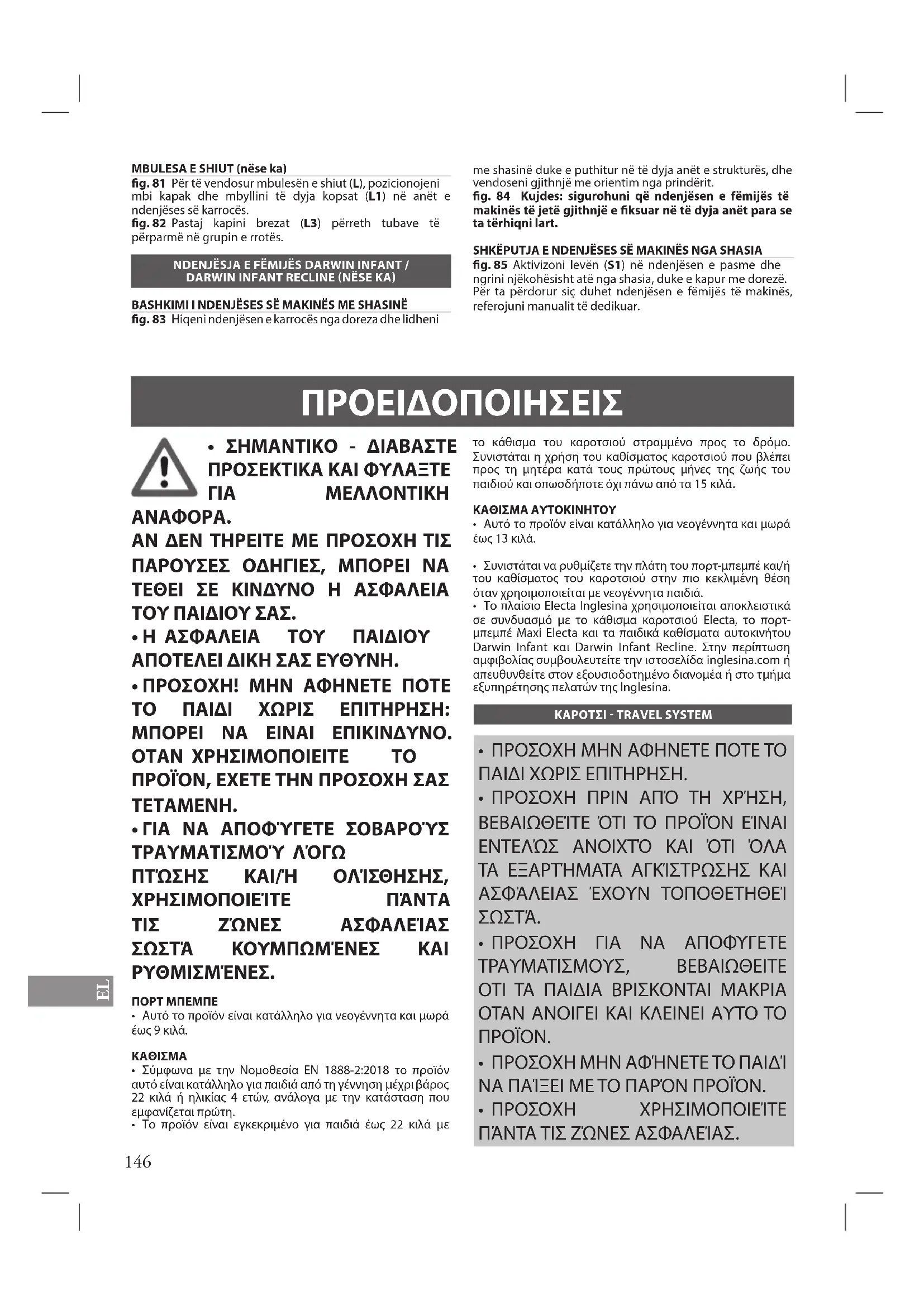 Εικ. 77 Προσοχή! Βεβαιωθείτε ότι όλες οι ζώνες είναι σωστά στερεωμένες στο κάθισμα του καροτσιού, τραβώντας τες ξεχωριστά. ΚΑΛΥΜΜΑ ΠΟΙΩΝ (αν διατίθεται) Εικ. 78 Τοποθετήστε το κάλυμμα των ποδιών (K) περνώντας το κάτω από την μπάρα προστασίας και στερεώστε τα αυτόματα κουμπιά που υπάρχουν (K1). Εικ. 79 Το ρεβέρ του ποδόσακου μπορεί να επεκταθεί και να στερεωθεί στην κατάλληλη θέση ώστε να προστατεύει το παιδί από το κρύο, κουμπώνοντάς το με τις σούστες πλευρικά (K2) στην κουκούλα. Εικ. 80 Ο ποδόσακος μπορεί να χρησιμοποιηθεί τόσο με φορά προς τον γονέα όσο και προς τον κόσμο. ΚΑΛΥΜΜΑ ΓΙΑ ΤΗ ΒΡΟΧΗ (αν διατίθεται) Εικ. 81 Για να τοποθετήσετε το κάλυμμα για τη βροχή (L), τοποθετήστε το επάνω στην κουκούλα και κουμπώστε τις δύο σούστες (L1) πλευρικά στο κάθισμα του καροτσιού. Εικ. 82 Στη συνέχεια στερεώστε τα λάστιχα (L3) γύρ ω από τους μπροστινούς σωλήνες, στο σύνολο των τροχών. ΚΑΘΙΣΜΑ ΑΥΤΟΚΙΝΗΤΟΥ DARWIN INFANT /
