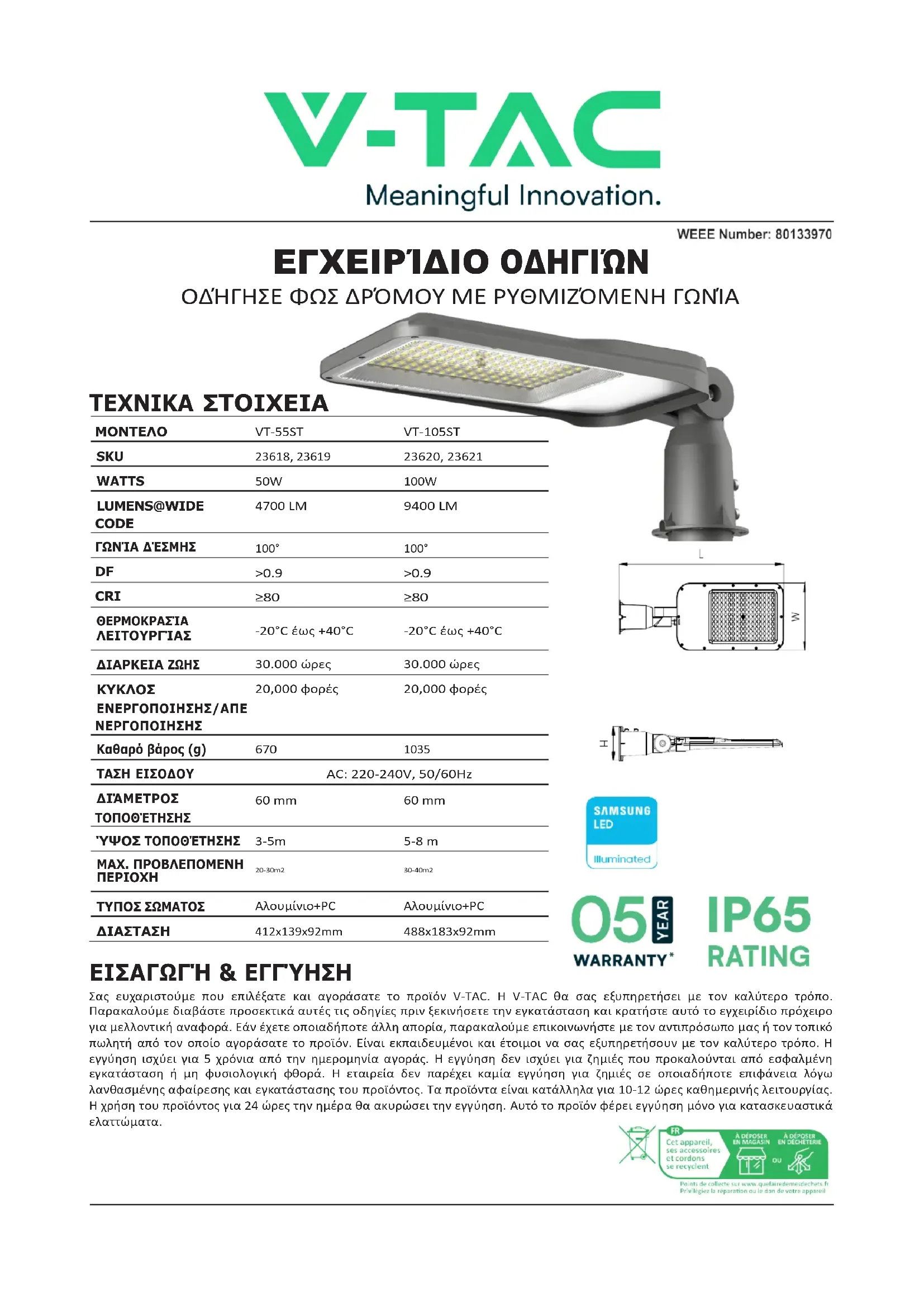 412x139x92mm 488x183x92mm ΕΙΣΑΓΩΓΉ & ΕΓΓΎΗΣΗ Σας ευχαριστούμε που επιλέξατε και αγοράσατε το προϊόν V-TAC. Η V-TAC θα σας εξυπηρετήσει με τον καλύτερο τρόπο. Παρακαλούμε διαβάστε προσεκτικά αυτές τις οδηγίες πριν ξεκινήσετε την εγκατάσταση και κρατήστε αυτό το εγχειρίδιο πρόχειρο για μελλοντική αναφορά. Εάν έχετε οποιαδήποτε άλλη απορία, παρακαλούμε επικοινωνήστε με τον αντιπρόσωπο μας ή τον τοπικό πωλητή από τον οποίο αγοράσατε το προϊόν. Είναι εκπαιδευμένοι και έτοιμοι να σας εξυπηρετήσουν με τον καλύτερο τρόπο. Η εγγύηση ισχύει για 5 χρόνια από την ημερομηνία αγοράς. Η εγγύηση δεν ισχύει για ζημιές που προκαλούνται από εσφαλμένη εγκατάσταση ή μη φυσιολογική φθορά. Η εταιρεία δεν παρέχει καμία εγγύηση για ζημιές σε οποιαδήποτε επιφάνεια λόγω λανθασμένης αφαίρεσης και εγκατάστασης του προϊόντος. Τα προϊόντα είναι κατάλληλα για 10-12 ώρες καθημερινής λειτουργίας. Η χρήση του προϊόντος για 24 ώρες την ημέρα θα ακυρώσει την εγγύηση. Αυτό το προϊόν φέρει εγγύηση μόνο για κατασκευαστικά ελαττώματα.3
