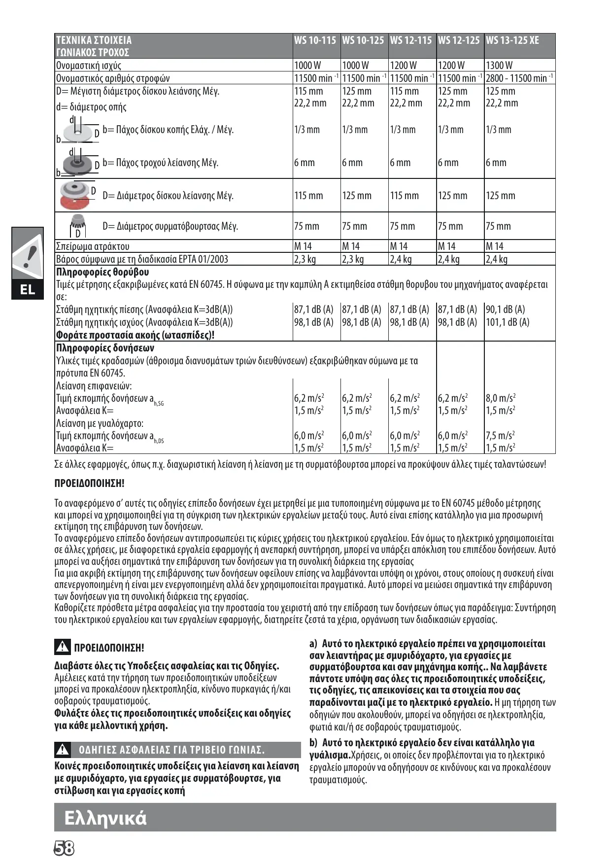 WS 10-115 WS 10-125 WS 12-115 WS 12-125 WS 13-125 XE 1000 W 1000 W 1200 W 1200 W 1300 W 11500 min -1 11500 min -1 11500 min -1 11500 min -1 2800 - 11500 min -1 115 mm 125 mm 115 mm 125 mm 125 mm 22,2 mm 22,2 mm 22,2 mm 22,2 mm 22,2 mm b= Πάχος δίσκου κοπής Ελάχ. / Μέγ. 1/3 mm 1/3 mm 1/3 mm 1/3 mm 1/3 mm b= Πάχος τροχού λείανσης Μέγ. 6 mm 6 mm 6 mm 6 mm 6 mm D= Διάμετρος δίσκου λείανσης Μέγ. 115 mm 125 mm 115 mm 125 mm 125 mm D= Διάμετρος συρματόβουρτσας Μέγ. 75 mm 75 mm 75 mm 75 mm 75 mm Σπείρωμα ατράκτου M 14 M 14 M 14 M 14 M 14 Βάρος σύμφωνα με τη διαδικασία EPTA 01/2003 2,3 kg 2,3 kg 2,4 kg 2,4 kg 2,4 kg Πληροφορίες θορύβου Τιμές μέτρησης εξακριβωμένες κατά EN 60745. Η σύφωνα με την καμπύλη Α εκτιμηθείσα στάθμη θορυβου τoυ μηχανήματος αναφέρεται Στάθμη ηχητικής πίεσης (Ανασφάλεια K=3dB(A)) 87,1 dB (A) 87,1 dB (A) 87,1 dB (A) 87,1 dB (A) 90,1 dB (A) Στάθμη ηχητικής ισχύος (Ανασφάλεια K=3dB(A)) 98,1 dB (A) 98,1 dB (A) 98,1 dB (A) 98,1 dB (A) 101,1 dB (A) Φοράτε προστασία ακοής (ωτασπίδες)! Πληροφορίες δονήσεων Υλικές τιμές κραδασμών (άθροισμα διανυσμάτων τριών διευθύνσεων) εξακριβώθηκαν σύμωνα με τα πρότυπα EN 60745. Λείανση επιφανειών: Τιμή εκπομπής δονήσεων ah,SG 6,2 m/s2 6,2 m/s2 6,2 m/s2 6,2 m/s2 8,0 m/s2