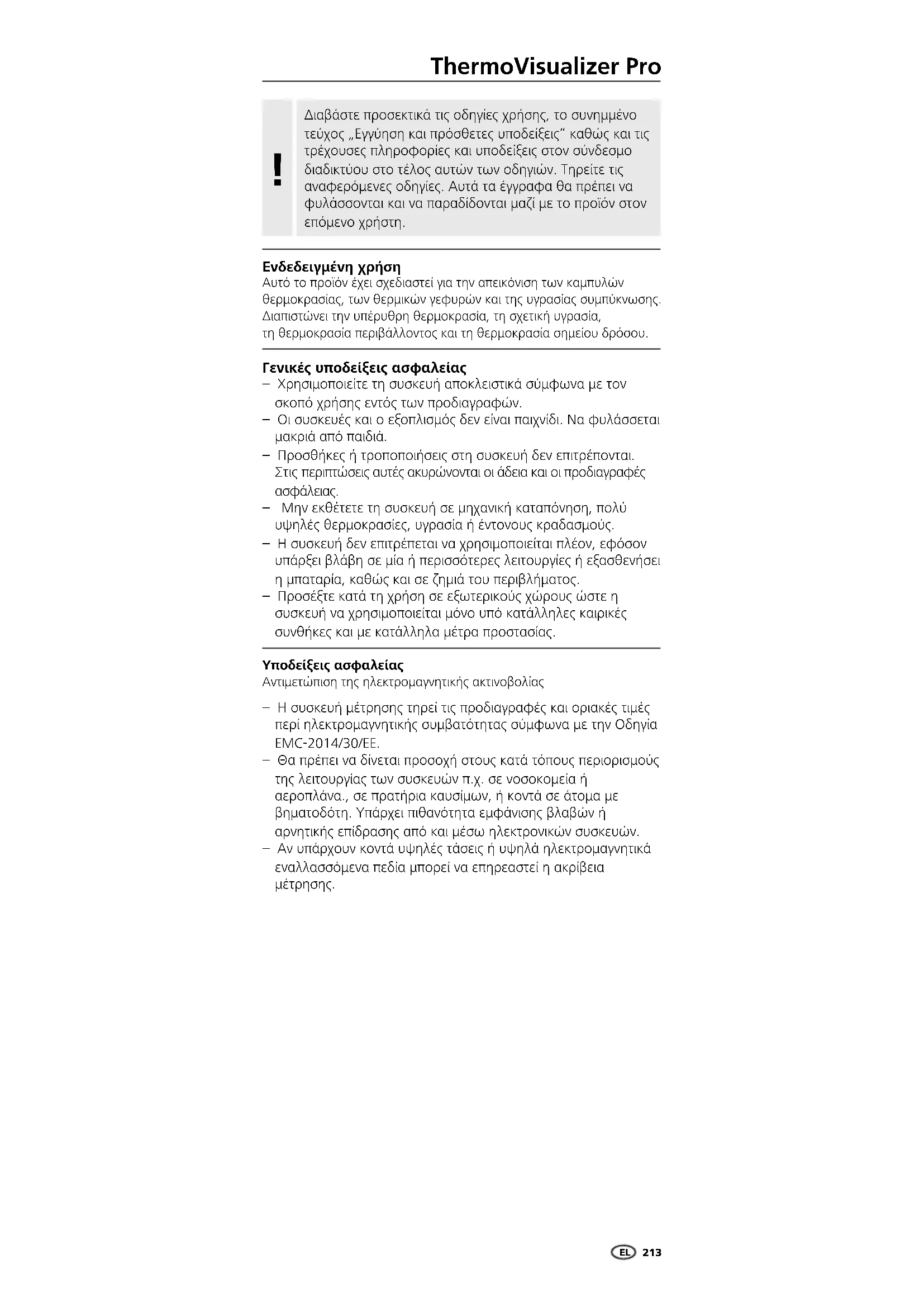 Υποδείξεις ασφαλείας Αντιμετώπιση της ηλεκτρομαγνητικής ακτινοβολίας – Η συσκευή μέτρησης τηρεί τις προδιαγραφές και οριακές τιμές περί ηλεκτρομαγνητικής συμβατότητας σύμφωνα με την Οδηγία EMC-2014/30/EΕ. – Θα πρέπει να δίνεται προσοχή στους κατά τόπους περιορισμούς της λειτουργίας των συσκευών π.χ. σε νοσοκομεία ή αεροπλάνα., σε πρατήρια καυσίμων, ή κοντά σε άτομα με βηματοδότη. Υπάρχει πιθανότητα εμφάνισης βλαβών ή αρνητικής επίδρασης από και μέσω ηλεκτρονικών συσκευών. – Αν υπάρχουν κοντά υψηλές τάσεις ή υψηλά ηλεκτρομαγνητικά εναλλασσόμενα πεδία μπορεί να επηρεαστεί η ακρίβεια μέτρησης.214