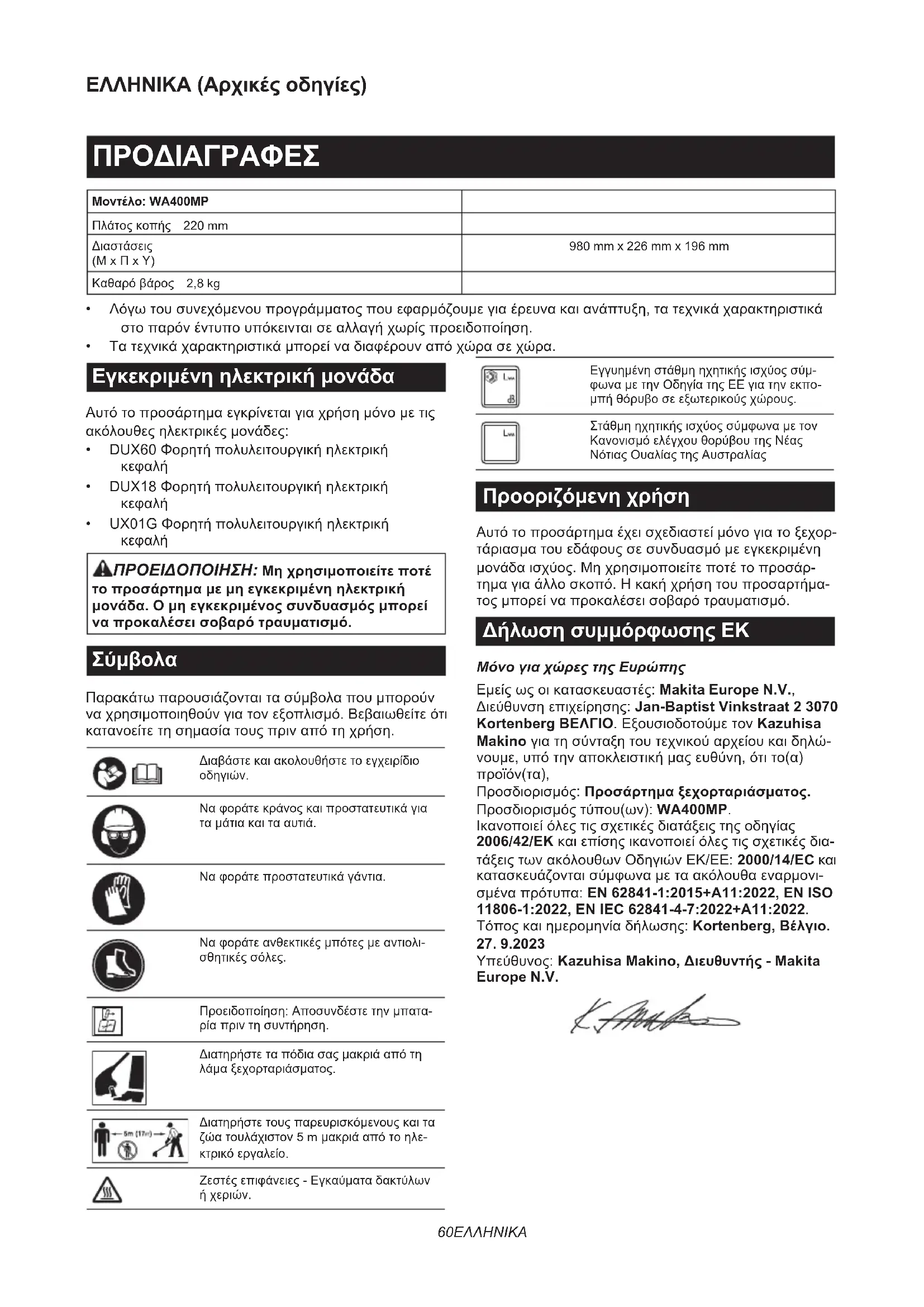 Εγγυημένηστάθμηηχητικήςισχύοςσύμ- φωναμετηνΟδηγίατηςΕΕγιατηνεκπο- μπήθόρυβοσεεξωτερικούςχώρους. Στάθμηηχητικήςισχύοςσύμφωναμετον ΚανονισμόελέγχουθορύβουτηςΝέας ΝότιαςΟυαλίαςτηςΑυστραλίας Προοριζόμενη χρήση Αυτότοπροσάρτημαέχεισχεδιαστείμόνογιατοξεχορ- τάριασματουεδάφουςσεσυνδυασμόμεεγκεκριμένη μονάδαισχύος.Μηχρησιμοποιείτεποτέτοπροσάρ- τημαγιαάλλοσκοπό.Ηκακήχρήσητουπροσαρτήμα- τοςμπορείναπροκαλέσεισοβαρότραυματισμό. Δήλωση συμμόρφωσης ΕΚ Μόνο για χώρες της Ευρώπης Εμείςωςοικατασκευαστές:Makita Europe N.V., Διεύθυνσηεπιχείρησης:Jan-Baptist Vinkstraat 2 3070 Kortenberg ΒΕΛΓΙΟ.ΕξουσιοδοτούμετονKazuhisa Makinoγιατησύνταξητουτεχνικούαρχείουκαιδηλώ- νουμε,υπότηναποκλειστικήμαςευθύνη,ότιτο(α) προϊόν(τα), Προσδιορισμός:Προσάρτημα ξεχορταριάσματος. Προσδιορισμόςτύπου(ων):WA400MP. Ικανοποιείόλεςτιςσχετικέςδιατάξειςτηςοδηγίας 2006/42/ΕΚκαιεπίσηςικανοποιείόλεςτιςσχετικέςδια- τάξειςτωνακόλουθωνΟδηγιώνΕΚ/ΕΕ:2000/14/ECκαι κατασκευάζονταισύμφωναμεταακόλουθαεναρμονι- σμέναπρότυπα:EN 62841-1:2015+A11:2022, EN ISO 11806-1:2022, EN IEC 62841-4-7:2022+A11:2022. Τόποςκαιημερομηνίαδήλωσης:Kortenberg, Βέλγιο.