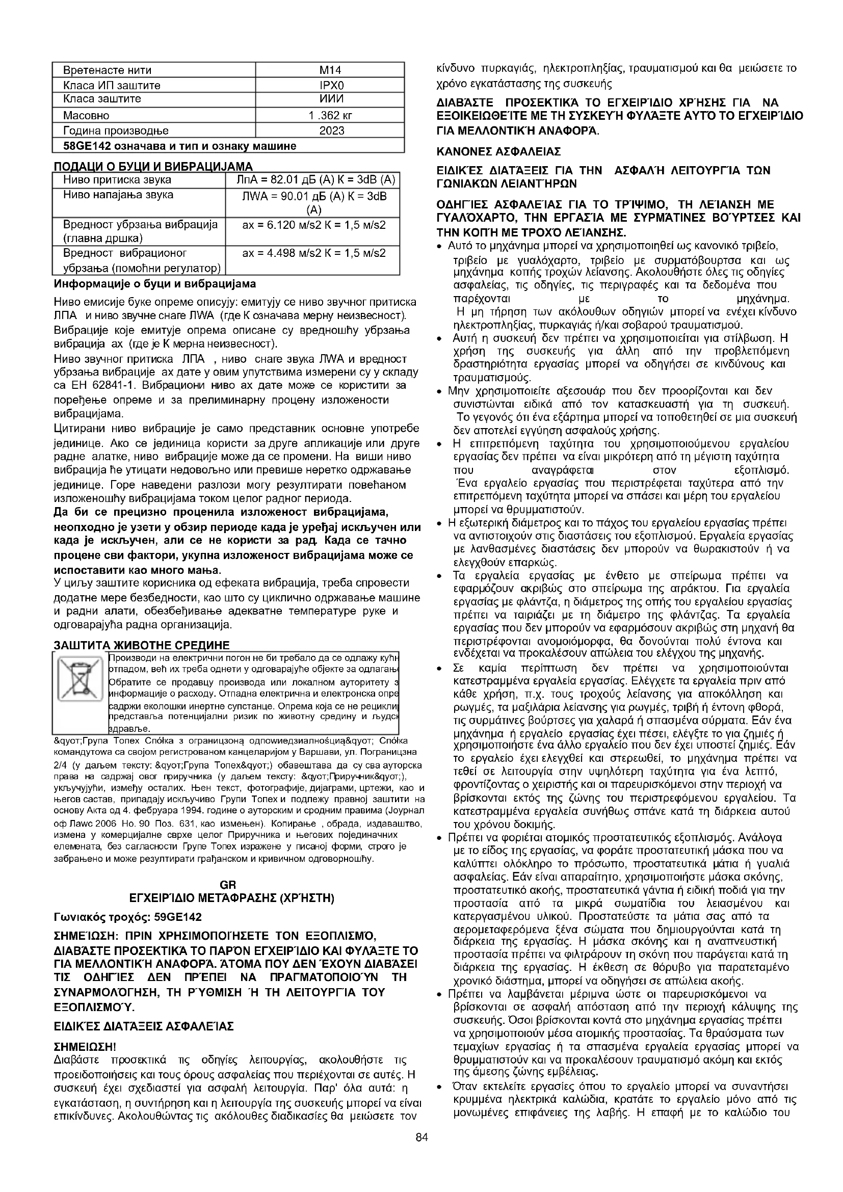 Το 58GE142 δηλώνει τόσο τον τύπο όσο και την ονομασία του μηχανήματος. ΔΕΔΟΜΈΝΑ ΘΟΡΎΒΟΥ ΚΑΙ ΔΟΝΉΣΕΩΝ Επίπεδο ηχητικής πίεσης LpA = 82,01 dB (A) K=3dB (A) Επίπεδο ηχητικής ισχύος LWA = 90,01 dB (A) K=3dB (A) Τιμή επιτάχυνσης κραδασμών (κύρια λαβή) ah = 6,120 m/s