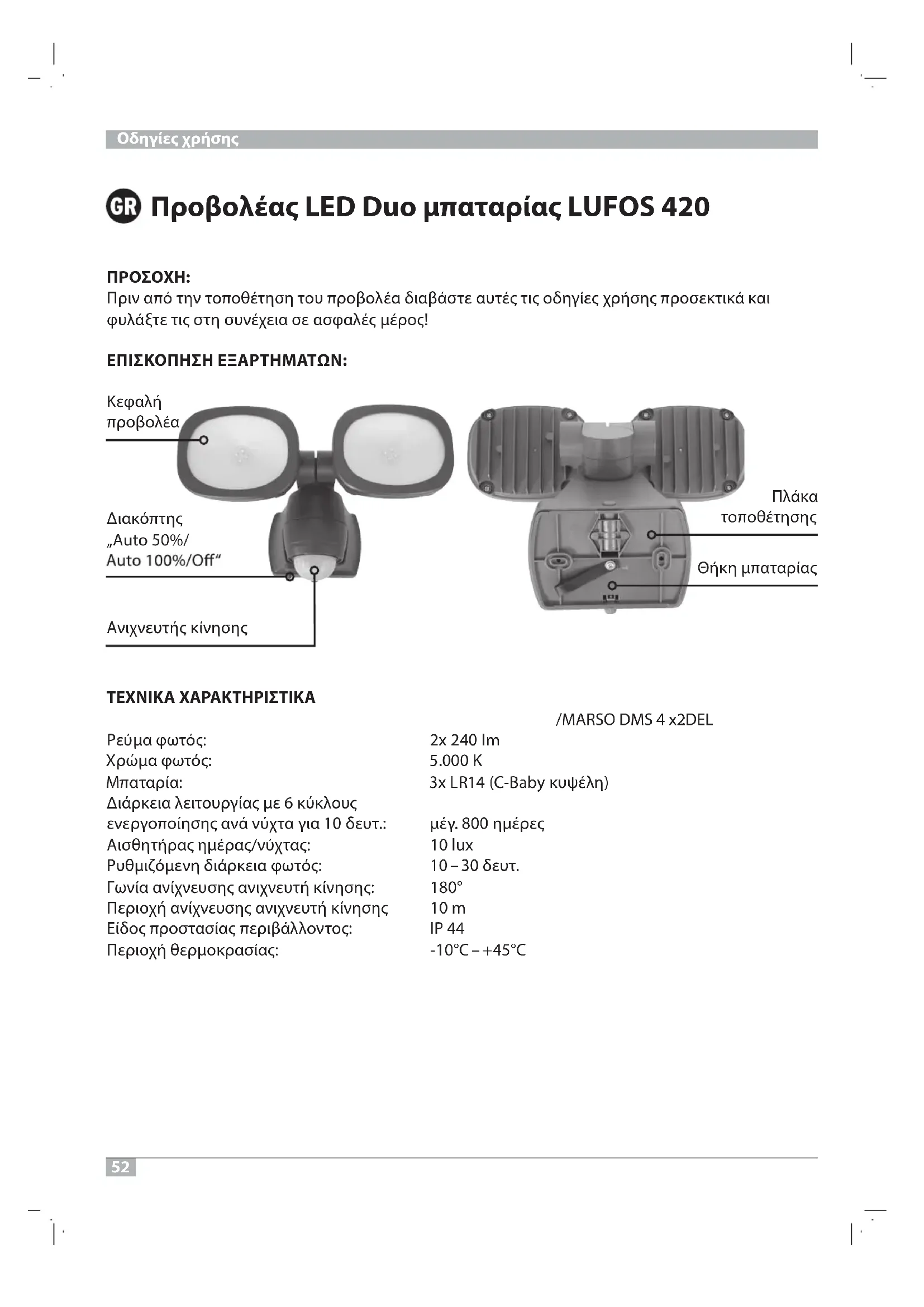 Πριν από την τοποθέτηση του προβολέα διαβάστε αυτές τις οδηγίες χρήσης προσεκτικά και φυλάξτε τις στη συνέχεια σε ασφαλές μέρος! ΕΠΙΣΚΟΠΗΣΗ ΕΞΑΡΤΗΜΑΤΩΝ: ΤΕΧΝΙΚΑ ΧΑΡΑΚΤΗΡΙΣΤΙΚΑ /MARSO DMS 4x2 :DEL mI 042 x2 :ςότωφ αμύεΡ K 000.5 :ςότωφ αμώρΧ )ηλέψυκ ybaB-C( 41RLx3 :αίραταπΜ Διάρκεια λειτουργίας με 6 κύκλους ενεργοποίησης ανά νύχτα για 10 δευτ.: μέγ. 800 ημέρες Αισθητήρας ημέρας/νύχτας: 10 lux Ρυθμιζόμενη διάρκεια φωτός: 10 – 30 δευτ. Γωνία ανίχνευσης ανιχνευτή κίνησης: 180° Περιοχή ανίχνευσης ανιχνευτή κίνησης 10 m Είδος προστασίας περιβάλλοντος: IP 44 Περιοχή θερμοκρασίας: -10°C – +45°C Οδηγίες χρήσης