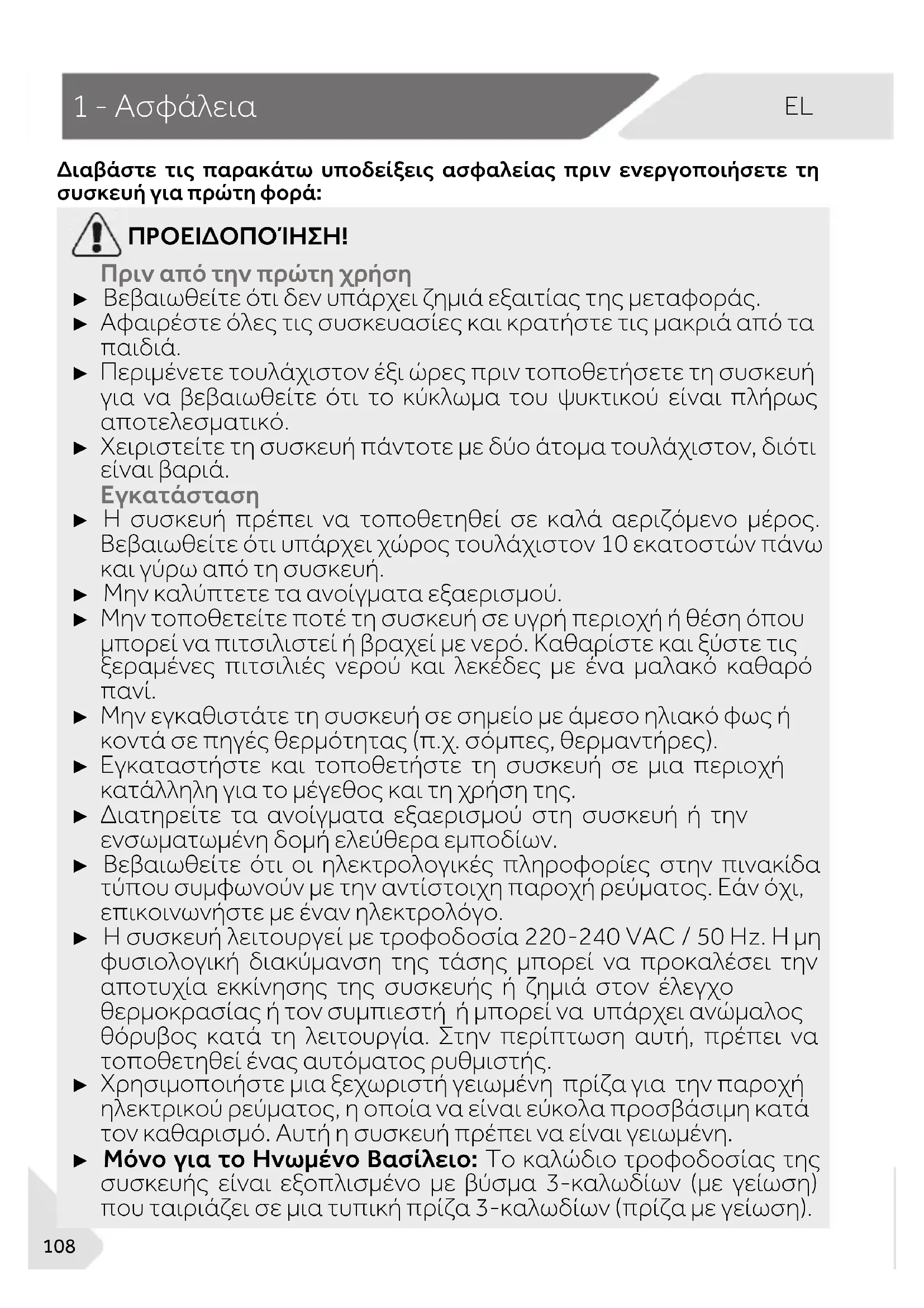 10.8. Ηλεκτρική σύνδεση Πριν από κάθε σύνδεση ελέγξτε αν: ► η τροφοδοσία ρεύματος, η πρίζα και η ασφάλεια είναι κατάλληλα σύμφωνα με την πινακίδα ονομαστικών στοιχείων. ► η πρίζα είναι γειωμένη και δεν υπάρχει πολλαπλή πρίζα ή επέκταση. ► το βύσμα τροφοδοσίας και η πρίζα είναι σύμφωνα με. Συνδέστε το βύσμα σε μια σωστά εγκατεστημένη οικιακή πρίζα. ΠΡΟΕΙΔΟΠΟΙΗΣΗ! Για να αποφύγετε τους κινδύνους, ένα κατεστραμμένο καλώδιο τροφοδοσίας πρέπει να αντικατασταθεί από την εξυπηρέτηση πελατών (βλ. κάρτα εγγύησης).EL