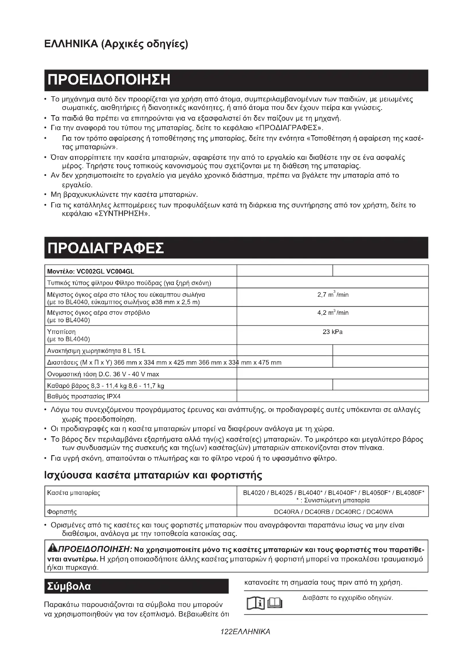- Για τις κατάλληλες λεπτομέρειες των προφυλάξεων κατά τη διάρκεια της συντήρησης από τον χρήστη, δείτε το κεφάλαιο «ΣΥΝΤΗΡΗΣΗ». ΠΡΟΔΙΑΓΡΑΦΕΣ Μοντέλο: VC002GL VC004GL Τυπικός τύπος φίλτρου Φίλτρο πούδρας (για ξηρή σκόνη) Μέγιστος όγκος αέρα στο τέλος του εύκαμπτου σωλήνα (με το BL4040, εύκαμπτος σωλήνας ø38 mm x 2,5 m) 2,7 m