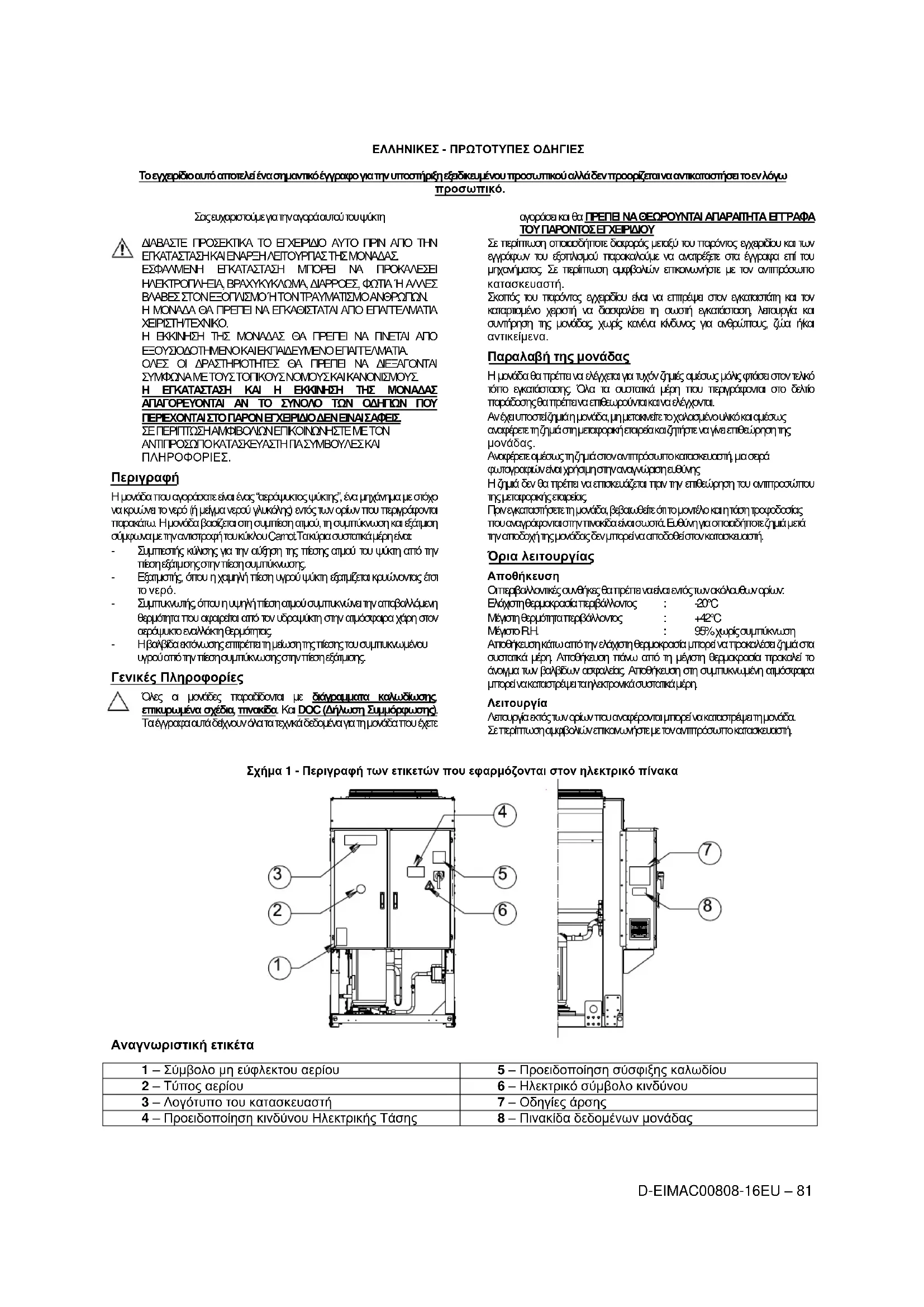 Σχήμα 1 - Περιγραφή των ετικετών που εφαρμόζονται στον ηλεκτρικό πίνακα Αναγνωριστική ετικέτα 1 – Σύμβολο μη εύφλεκτου αερίου 5 – Προειδοποίηση σύσφιξης καλωδίου 2 – Τύπος αερίου 6 – Ηλεκτρικό σύμβολο κινδύνου 3 – Λογότυπο του κατασκευαστή 7 – Οδηγίες άρσης 4 – Προειδοποίηση κινδύνου Ηλεκτρικής Τάσης 8 – Πινακίδα δεδομένων μονάδαςD-EIMAC00808-16EU – 82