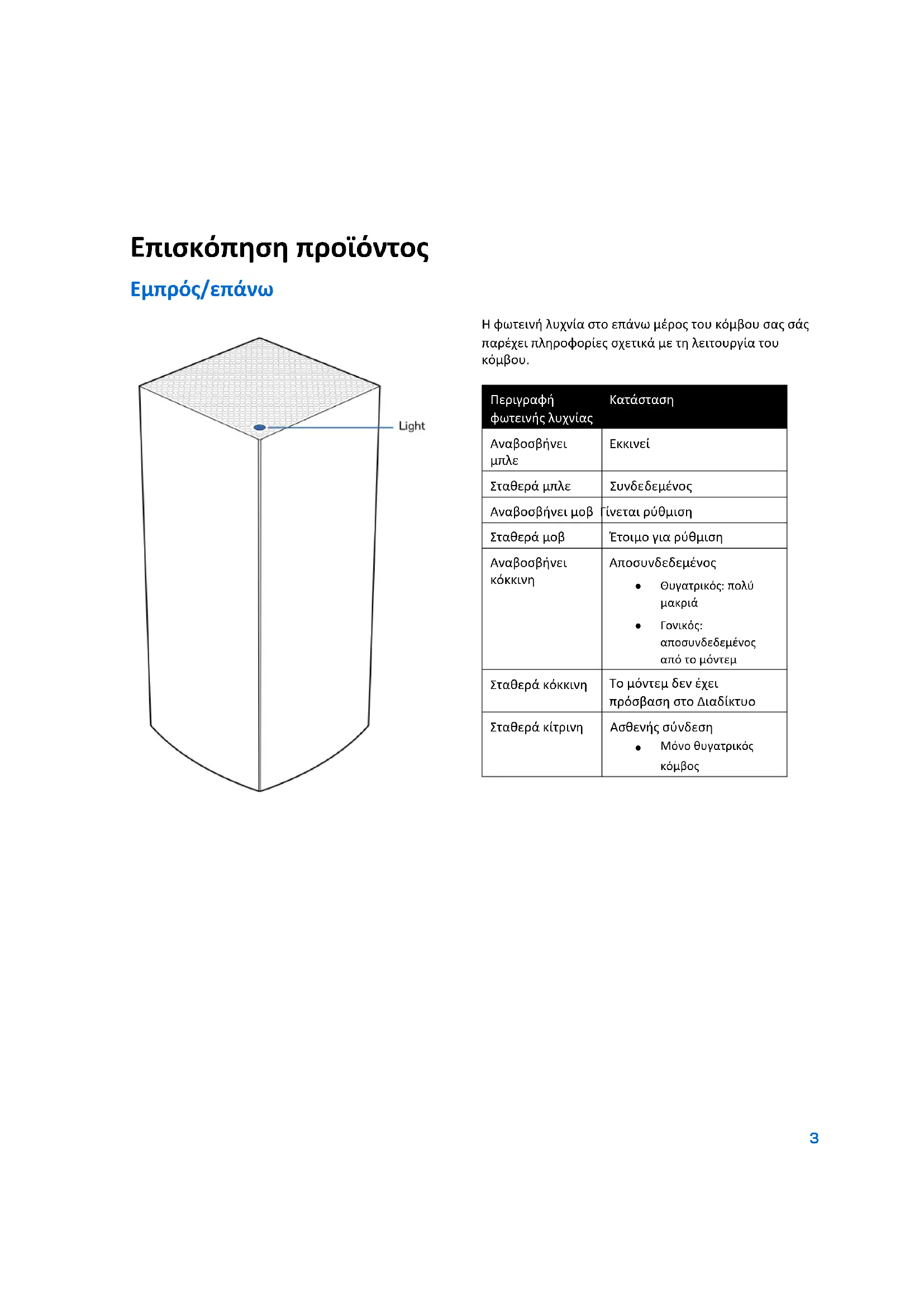 Με τον κόμβο σας συνδεδεμένο σε πηγή τροφοδοσίας και ενεργοποιημένο, πιέστε παρατεταμένα το κουμπί επαναφοράς (Reset) στο κάτω μέρος. Η λυχνία στο επάνω μέρος του κόμβου θα γίνει κόκκινη και θα εξασθενίσει σε ένταση αναβοσβήνοντας. Μην αφήσετε το κουμπί μέχρι η λυχνία να σβήσει και να γίνει έντονα κόκκινη.32 Προδιαγραφές Linksys Velop Όνομα μοντέλου Velop AX5400 WiFi 6 System Κωδικός μοντέλου MX5500 series Ταχύτητα θύρας