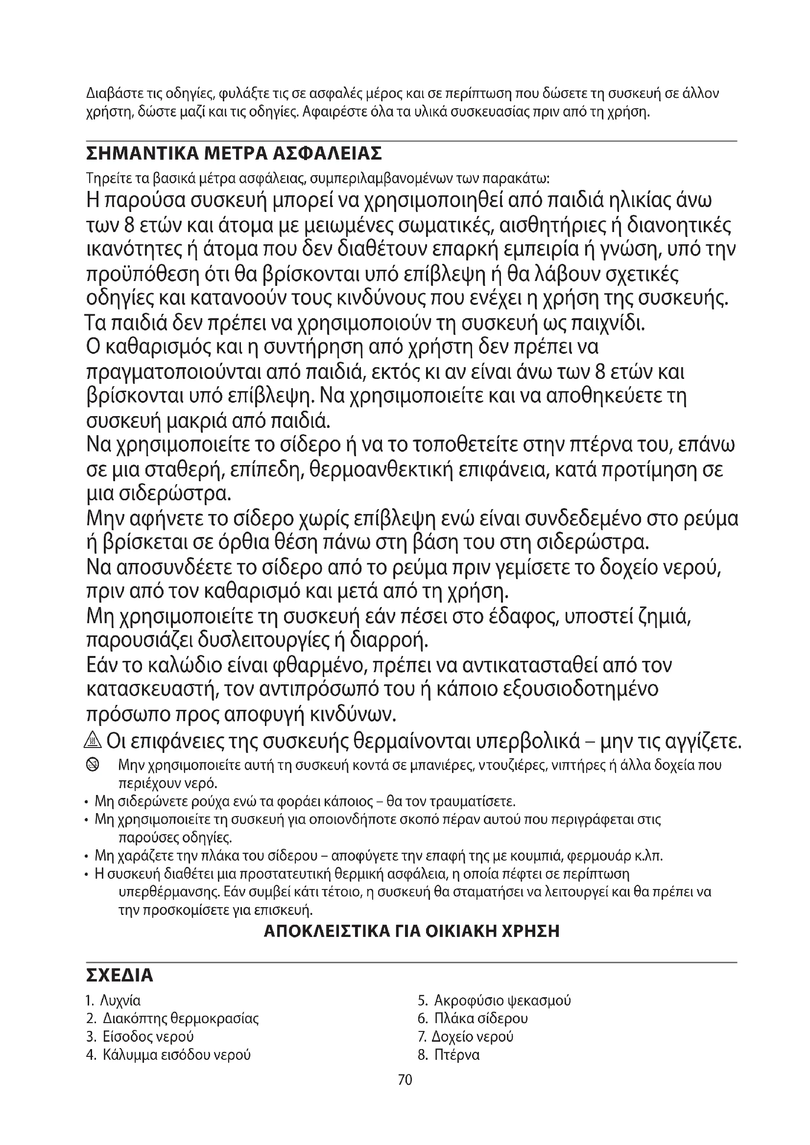 Τηρείτε τα βασικά μέτρα ασφάλειας, συμπεριλαμβανομένων των παρακάτω: Η παρούσα συσκευή μπορεί να χρησιμοποιηθεί από παιδιά ηλικίας άνω των 8 ετών και άτομα με μειωμένες σωματικές, αισθητήριες ή διανοητικές ικανότητες ή άτομα που δεν διαθέτουν επαρκή εμπειρία ή γνώση, υπό την προϋπόθεση ότι θα βρίσκονται υπό επίβλεψη ή θα λάβουν σχετικές οδηγίες και κατανοούν τους κινδύνους που ενέχει η χρήση της συσκευής. Τα παιδιά δεν πρέπει να χρησιμοποιούν τη συσκευή ως παιχνίδι. Ο καθαρισμός και η συντήρηση από χρήστη δεν πρέπει να πραγματοποιούνται από παιδιά, εκτός κι αν είναι άνω των 8 ετών και βρίσκονται υπό επίβλεψη. Να χρησιμοποιείτε και να αποθηκεύετε τη συσκευή μακριά από παιδιά. Να χρησιμοποιείτε το σίδερο ή να το τοποθετείτε στην πτέρνα του, επάνω σε μια σταθερή, επίπεδη, θερμοανθεκτική επιφάνεια, κατά προτίμηση σε μια σιδερώστρα. Μην αφήνετε το σίδερο χωρίς επίβλεψη ενώ είναι συνδεδεμένο στο ρεύμα ή βρίσκεται σε όρθια θέση πάνω στη βάση του στη σιδερώστρα. Να αποσυνδέετε το σίδερο από το ρεύμα πριν γεμίσετε το δοχείο νερού, πριν από τον καθαρισμό και μετά από τη χρήση. Μη χρησιμοποιείτε τη συσκευή εάν πέσει στο έδαφος, υποστεί ζημιά, παρουσιάζει δυσλειτουργίες ή διαρροή. Εάν το καλώδιο είναι φθαρμένο, πρέπει να αντικατασταθεί από τον κατασκευαστή, τον αντιπρόσωπό του ή κάποιο εξουσιοδοτημένο πρόσωπο προς αποφυγή κινδύνων. h Οι επιφάνειες της συσκευής θερμαίνονται υπερβολικά – μην τις αγγίζετε. b Μην χρησιμοποιείτε αυτή τη συσκευή κοντά σε μπανιέρες, ντουζιέρες, νιπτήρες ή άλλα δοχεία που περιέχουν νερό.
