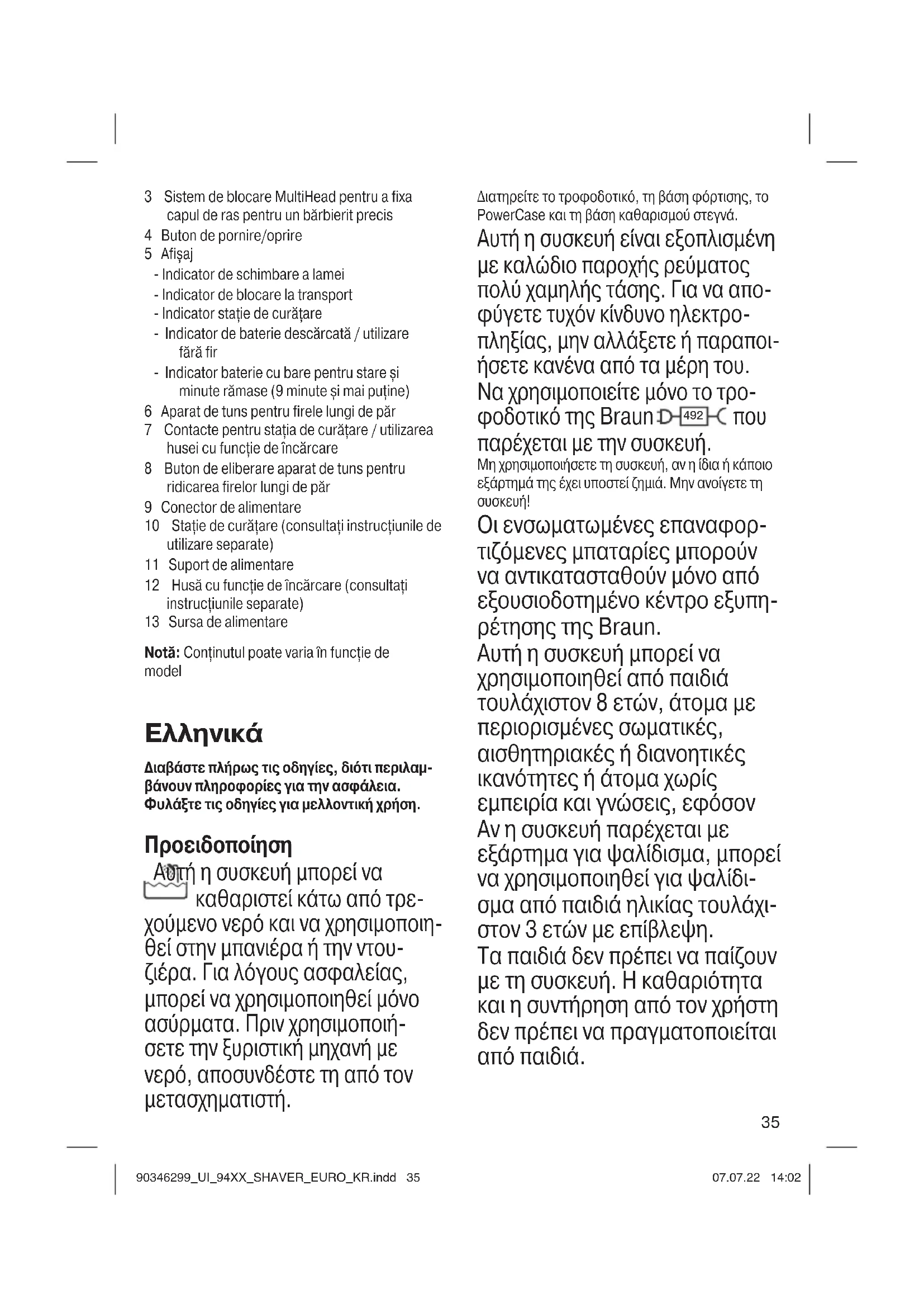 Οι ενσωματωμένες επαναφορ- τιζόμενες μπαταρίες μπορούν να αντικατασταθούν μόνο από εξουσιοδοτημένο κέντρο εξυπη- ρέτησης της Braun. Αυτή η συσκευή μπορεί να χρησιμοποιηθεί από παιδιά τουλάχιστον 8 ετών, άτομα με περιορισμένες σωματικές, αισθητηριακές ή διανοητικές ικανότητες ή άτομα χωρίς εμπειρία και γνώσεις, εφόσον Αν η συσκευή παρέχεται με εξάρτημα για ψαλίδισμα, μπορεί να χρησιμοποιηθεί για ψαλίδι- σμα από παιδιά ηλικίας τουλάχι- στον 3 ετών με επίβλεψη. Τα παιδιά δεν πρέπει να παίζουν με τη συσκευή. Η καθαριότητα και η συντήρηση από τον χρήστη δεν πρέπει να πραγματοποιείται από παιδιά. 90346299_UI_94XX_SHAVER_EURO_KR.indd 3590346299_UI_94XX_SHAVER_EURO_KR.indd 35 07.07.22 14:0207.07.22 14:0236