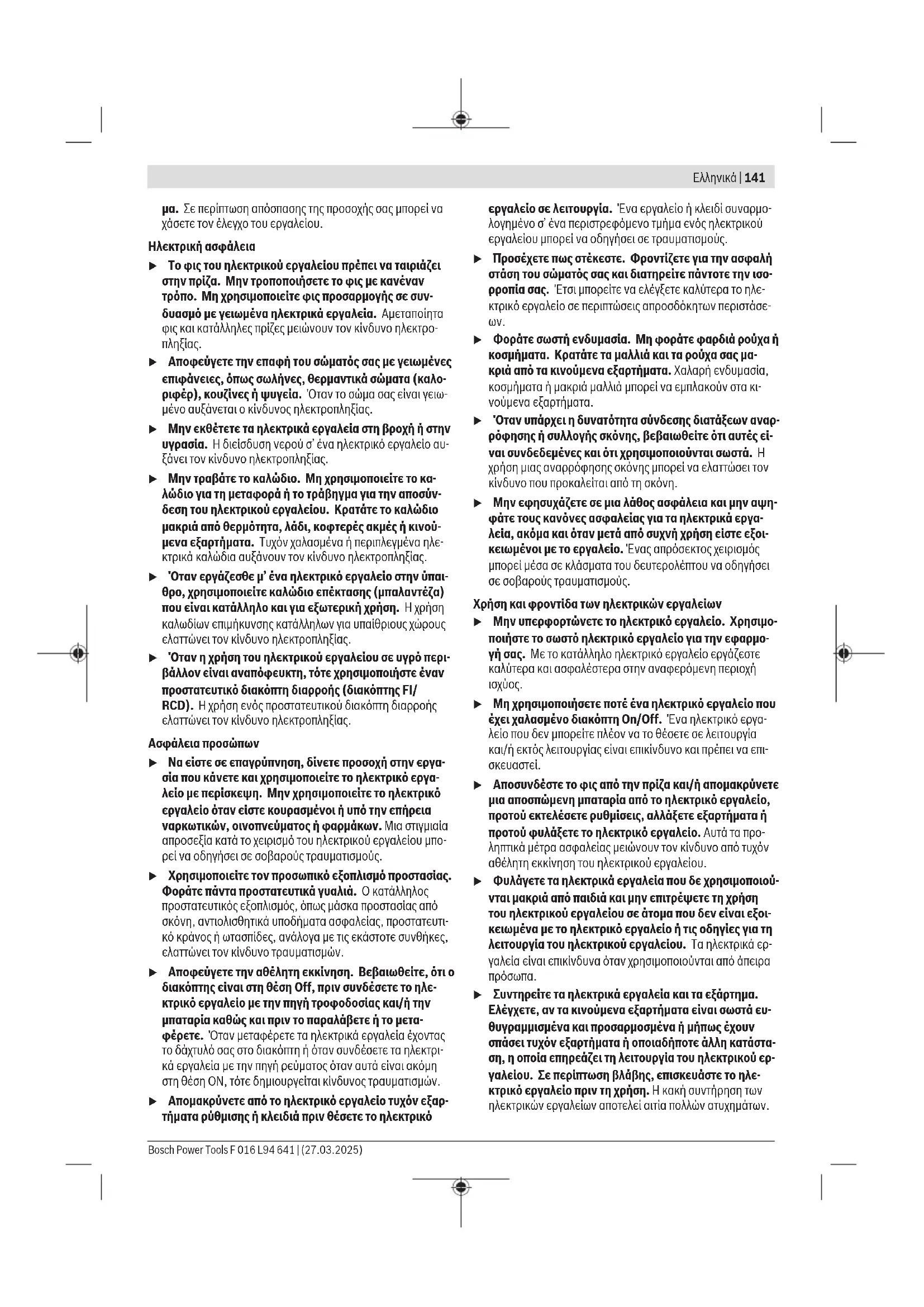u Μην εργάζεσθε με το ηλεκτρικό εργαλείο σε περιβάλ- λον, όπου υπάρχει κίνδυνος έκρηξης, όπως με την πα- ρουσία εύφλεκτων υγρών, αερίων ή σκόνης. Τα ηλε- κτρικά εργαλεία δημιουργούν σπινθηρισμό ο οποίος μπορεί να αναφλέξει τη σκόνη ή τις αναθυμιάσεις. u Όταν χρησιμοποιείτε το ηλεκτρικό εργαλείο, κρατάτε μακριά τα παιδιά και άλλα τυχόν παρευρισκόμενα άτο- F 016 L94 641 | (27.03.2025) Bosch Power ToolsΕλληνικά | 141 μα. Σε περίπτωση απόσπασης της προσοχής σας μπορεί να χάσετε τον έλεγχο του εργαλείου. Ηλεκτρική ασφάλεια u Το φις του ηλεκτρικού εργαλείου πρέπει να ταιριάζει στην πρίζα. Μην τροποποιήσετε το φις με κανέναν τρόπο. Μη χρησιμοποιείτε φις προσαρμογής σε συν- δυασμό με γειωμένα ηλεκτρικά εργαλεία. Αμεταποίητα φις και κατάλληλες πρίζες μειώνουν τον κίνδυνο ηλεκτρο-