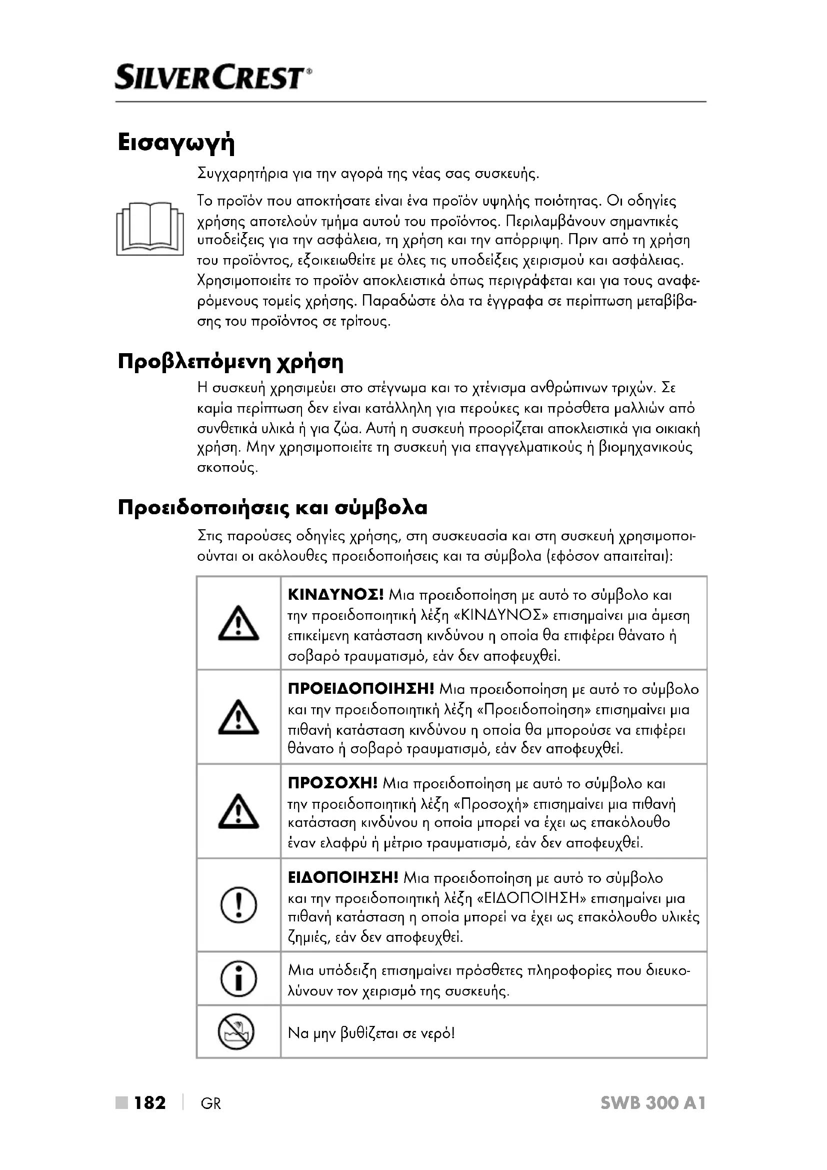 GR SWB 300 A1 ► Μην χρησιμοποιείτε ποτέ τη συσκευή κοντά σε νερό, ιδιαίτερα κοντά σε νεροχύτες, μπανιέρες ή παρόμοια σημεία. Λόγω της ύπαρξης νερού, παρατηρείται κίνδυ- νος, ακόμα και όταν η συσκευή είναι απενεργοποιημένη. Για τον λόγο αυτό, αποσυνδέετε το βύσμα από την πρίζα μετά από κάθε χρήση. Για συμπληρωματική προστασία, προτείνεται η εγκατάσταση στο ηλεκτρικό κύκλωμα του μπάνιου μιας διάταξης προστασίας ρεύματος διαρροής με ονομαστικό ρεύμα απεμπλοκής που δεν υπερβαίνει τα 30 mA. Ρωτήστε σχετικά τον ηλεκτρολόγο σας. ΠΡΟΕΙΔΟΠΟΙΗΣΗ! ► Αυτή η συσκευή επιτρέπεται να χρησιμοποιείται από παιδιά άνω των 8 ετών και από άτομα με περιορισμένες φυσικές, αισθητηριακές ή νοητικές ικανότητες ή με έλλειψη εμπειρίας ή/και γνώσεων, εφόσον επιτηρούνται ή εάν έχουν ενημερωθεί αναφορικά με την ασφαλή χρήση της συσκευής και έχουν κατανοήσει τους κινδύνους. ► Απαγορεύεται η χρήση της συσκευής από παιδιά ως παιχνίδι. ► Ο καθαρισμός και η συντήρηση από τον χρήστη δεν επιτρέπε- ται να διεξάγονται από παιδιά, εκτός εάν επιτηρούνται. ► Μην αποθέτετε ποτέ τη συσκευή σε ενεργοποιημένη κατάστα- ση και μην αφήνετε ποτέ την ενεργοποιημένη συσκευή χωρίς