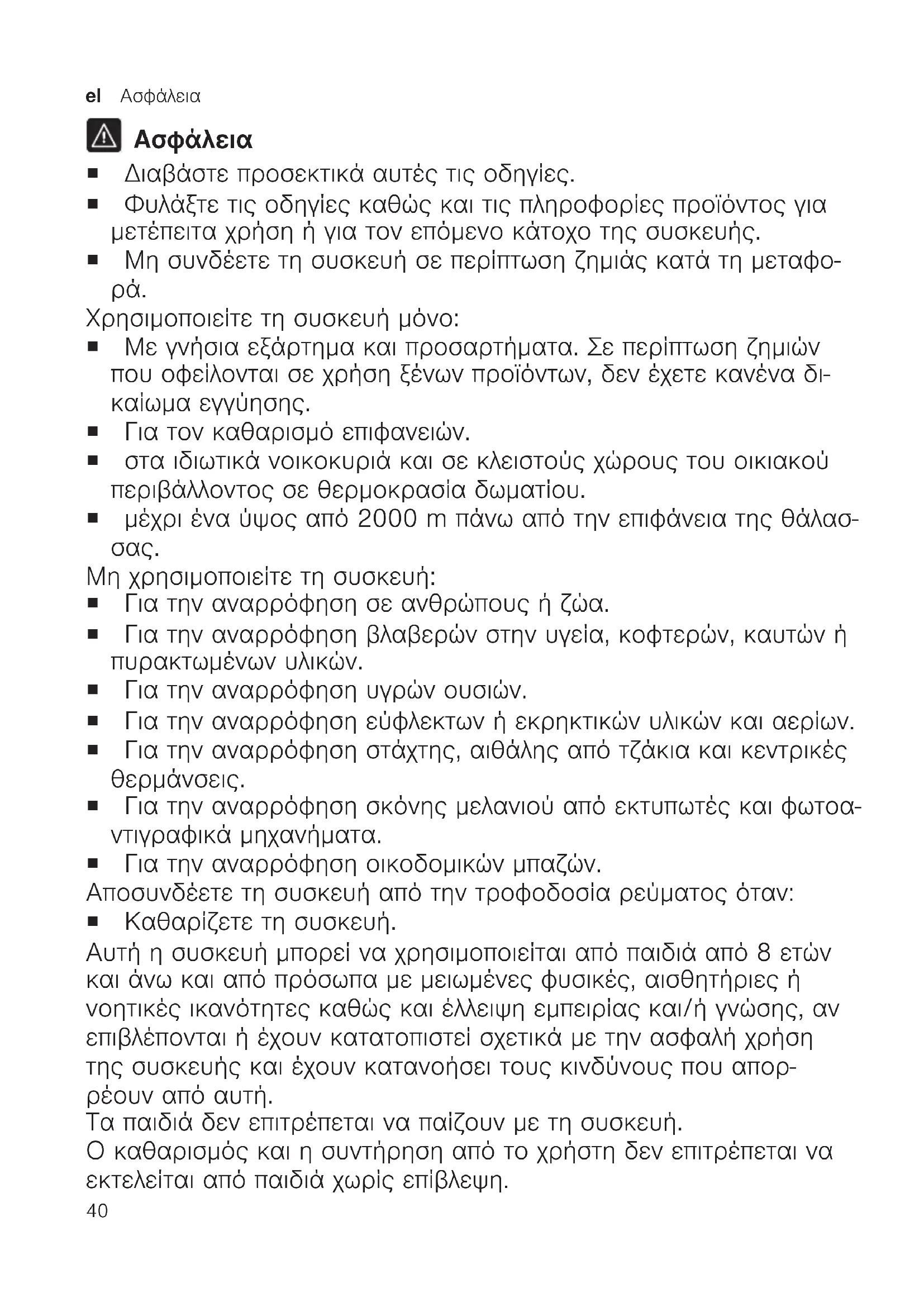 Μη χρησιμοποιείτε τη συσκευή: ¡ Για την αναρρόφηση σε ανθρώπους ή ζώα. ¡ Για την αναρρόφηση βλαβερών στην υγεία, κοφτερών, καυτών ή πυρακτωμένων υλικών. ¡ Για την αναρρόφηση υγρών ουσιών. ¡ Για την αναρρόφηση εύφλεκτων ή εκρηκτικών υλικών και αερίων. ¡ Για την αναρρόφηση στάχτης, αιθάλης από τζάκια και κεντρικές θερμάνσεις. ¡ Για την αναρρόφηση σκόνης μελανιού από εκτυπωτές και φωτοα- ντιγραφικά μηχανήματα. ¡ Για την αναρρόφηση οικοδομικών μπαζών. Αποσυνδέετε τη συσκευή από την τροφοδοσία ρεύματος όταν: ¡ Καθαρίζετε τη συσκευή. Αυτή η συσκευή μπορεί να χρησιμοποιείται από παιδιά από 8 ετών και άνω και από πρόσωπα με μειωμένες φυσικές, αισθητήριες ή νοητικές ικανότητες καθώς και έλλειψη εμπειρίας και/ή γνώσης, αν επιβλέπονται ή έχουν κατατοπιστεί σχετικά με την ασφαλή χρήση της συσκευής και έχουν κατανοήσει τους κινδύνους που απορ- ρέουν από αυτή. Τα παιδιά δεν επιτρέπεται να παίζουν με τη συσκευή. Ο καθαρισμός και η συντήρηση από το χρήστη δεν επιτρέπεται να εκτελείται από παιδιά χωρίς επίβλεψη.Ασφάλεια el