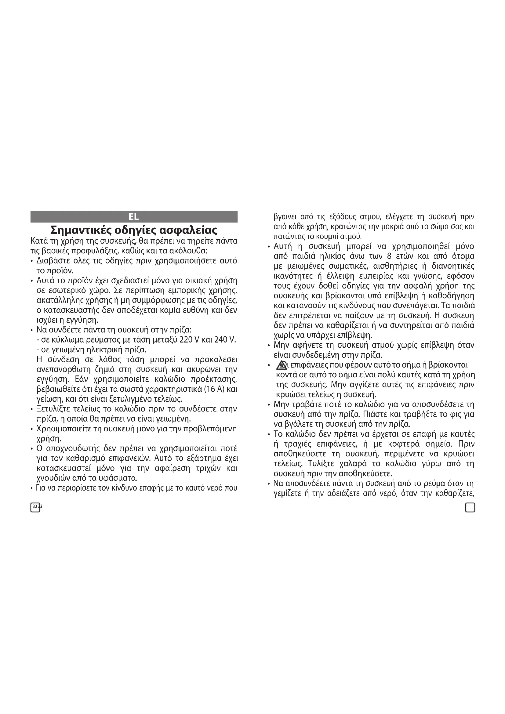 Επειδή ο ατμός είναι πολύ καυτός: μην επιχειρήσετε ποτέ να ξεζαρώσετε ρούχα ενώ τα φοράτε. Να κρεμάτε πάντα τα ρούχα σε κρεμάστρα. EL86 87