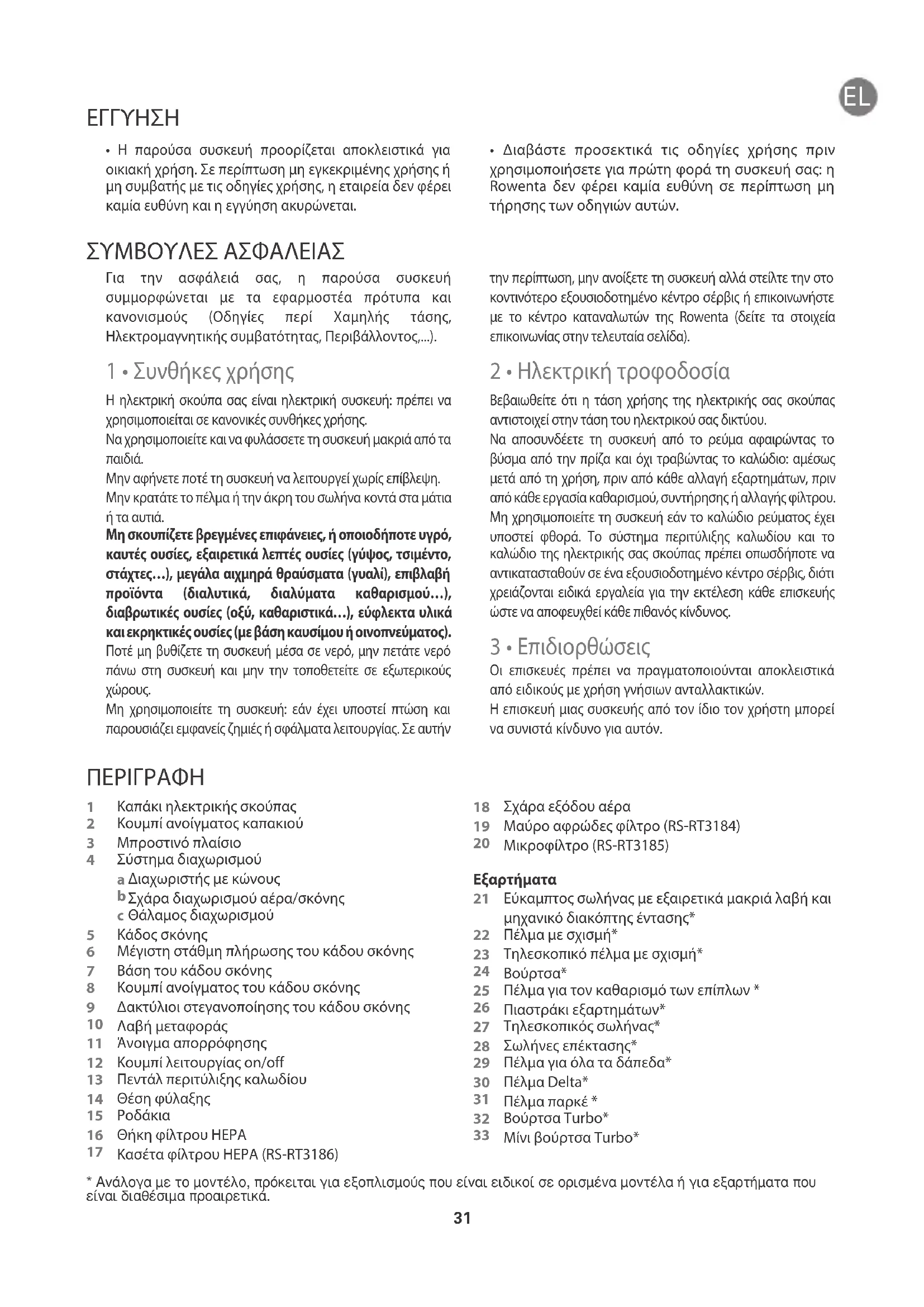 - Διαβάστε προσεκτικά τις οδηγίες χρήσης πριν χρησιμοποιήσετε για πρώτη φορά τη συσκευή σας: η Rowenta δεν φέρει καμία ευθύνη σε περίπτωση μη τήρησης των οδηγιών αυτών.32