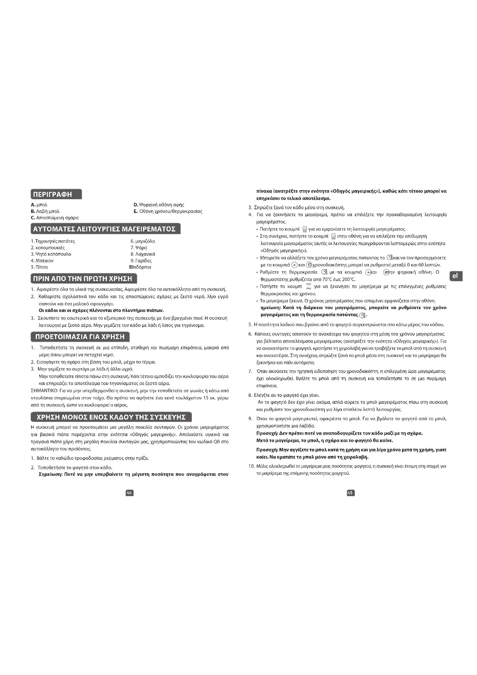 A. μπολ B. Λαβή μπολ C. Αποσπώμενη σχάρα D. Ψηφιακή οθόνη αφής E. Οθόνη χρόνου/θερμοκρασίας ΑΥΤΟΜΑΤΕΣ ΛΕΙΤΟΥΡΓΙΕΣ ΜΑΓΕΙΡΕΜΑΤΟΣ