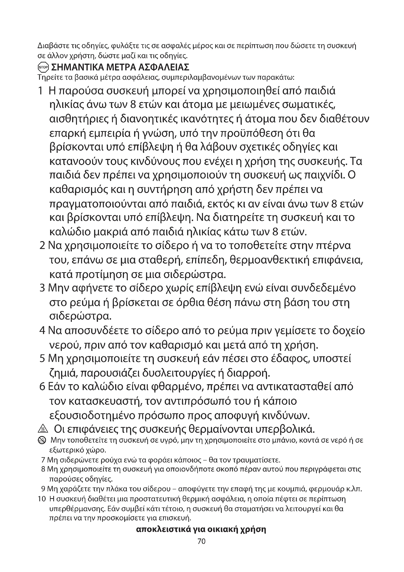 Τηρείτε τα βασικά μέτρα ασφάλειας, συμπεριλαμβανομένων των παρακάτω: 1 Η παρούσα συσκευή μπορεί να χρησιμοποιηθεί από παιδιά ηλικίας άνω των 8 ετών και άτομα με μειωμένες σωματικές, αισθητήριες ή διανοητικές ικανότητες ή άτομα που δεν διαθέτουν επαρκή εμπειρία ή γνώση, υπό την προϋπόθεση ότι θα βρίσκονται υπό επίβλεψη ή θα λάβουν σχετικές οδηγίες και κατανοούν τους κινδύνους που ενέχει η χρήση της συσκευής. Τα παιδιά δεν πρέπει να χρησιμοποιούν τη συσκευή ως παιχνίδι. Ο καθαρισμός και η συντήρηση από χρήστη δεν πρέπει να πραγματοποιούνται από παιδιά, εκτός κι αν είναι άνω των 8 ετών και βρίσκονται υπό επίβλεψη. Να διατηρείτε τη συσκευή και το καλώδιο μακριά από παιδιά ηλικίας κάτω των 8 ετών. 2 Να χρησιμοποιείτε το σίδερο ή να το τοποθετείτε στην πτέρνα του, επάνω σε μια σταθερή, επίπεδη, θερμοανθεκτική επιφάνεια, κατά προτίμηση σε μια σιδερώστρα. 3 Μην αφήνετε το σίδερο χωρίς επίβλεψη ενώ είναι συνδεδεμένο στο ρεύμα ή βρίσκεται σε όρθια θέση πάνω στη βάση του στη σιδερώστρα. 4 Να αποσυνδέετε το σίδερο από το ρεύμα πριν γεμίσετε το δοχείο νερού, πριν από τον καθαρισμό και μετά από τη χρήση. 5 Μη χρησιμοποιείτε τη συσκευή εάν πέσει στο έδαφος, υποστεί ζημιά, παρουσιάζει δυσλειτουργίες ή διαρροή. 6 Εάν το καλώδιο είναι φθαρμένο, πρέπει να αντικατασταθεί από τον κατασκευαστή, τον αντιπρόσωπό του ή κάποιο εξουσιοδοτημένο πρόσωπο προς αποφυγή κινδύνων. ¬ Οι επιφάνειες της συσκευής θερμαίνονται υπερβολικά. H Μην τοποθετείτε τη συσκευή σε υγρό, μην τη χρησιμοποιείτε στο μπάνιο, κοντά σε νερό ή σε εξωτερικό χώρο. 7 Μη σιδερώνετε ρούχα ενώ τα φοράει κάποιος – θα τον τραυματίσετε. 8 Μη χρησιμοποιείτε τη συσκευή για οποιονδήποτε σκοπό πέραν αυτού που περιγράφεται στις παρούσες οδηγίες. 9 Μη χαράζετε την πλάκα του σίδερου – αποφύγετε την επαφή της με κουμπιά, φερμουάρ κ.λπ. 10 Η συσκευή διαθέτει μια προστατευτική θερμική ασφάλεια, η οποία πέφτει σε περίπτωση υπερθέρμανσης. Εάν συμβεί κάτι τέτοιο, η συσκευή θα σταματήσει να λειτουργεί και θα πρέπει να την προσκομίσετε για επισκευή. αποκλειστικά για οικιακή χρήση71