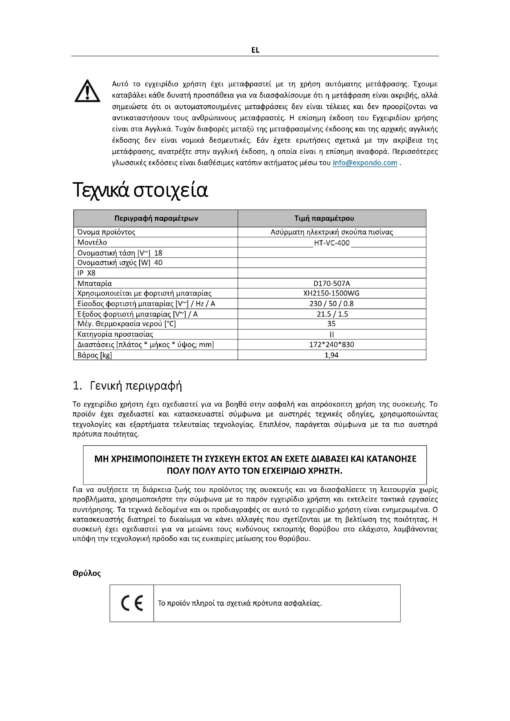 Το εγχειρίδιο χρήστη έχει σχεδιαστεί για να βοηθά στην ασφαλή και απρόσκοπτη χρήση της συσκευής. Το προϊόν έχει σχεδιαστεί και κατασκευαστεί σύμφωνα με αυστηρές τεχνικές οδηγίες, χρησιμοποιώντας τεχνολογίες και εξαρτήματα τελευταίας τεχνολογίας. Επιπλέον, παράγεται σύμφωνα με τα πιο αυστηρά πρότυπα ποιότητας. ΜΗ ΧΡΗΣΙΜΟΠΟΙΗΣΕΤΕ ΤΗ ΣΥΣΚΕΥΗ ΕΚΤΟΣ ΑΝ ΕΧΕΤΕ ΔΙΑΒΑΣΕΙ ΚΑΙ ΚΑΤΑΝΟΗΣΕ ΠΟΛΥ ΠΟΛΥ ΑΥΤΟ ΤΟΝ ΕΓΧΕΙΡΙΔΙΟ ΧΡΗΣΤΗ. Για να αυξήσετε τη διάρκεια ζωής του προϊόντος της συσκευής και να διασφαλίσετε τη λειτουργία χωρίς προβλήματα, χρησιμοποιήστε την σύμφωνα με το παρόν εγχειρίδιο χρήστη και εκτελείτε τακτικά εργασίες συντήρησης. Τα τεχνικά δεδομένα και οι προδιαγραφές σε αυτό το εγχειρίδιο χρήστη είναι ενημερωμένα. Ο κατασκευαστής διατηρεί το δικαίωμα να κάνει αλλαγές που σχετίζονται με τη βελτίωση της ποιότητας. Η συσκευή έχει σχεδιαστεί για να μειώνει τους κινδύνους εκπομπής θορύβου στο ελάχιστο, λαμβάνοντας υπόψη την τεχνολογική πρόοδο και τις ευκαιρίες μείωσης του θορύβου.