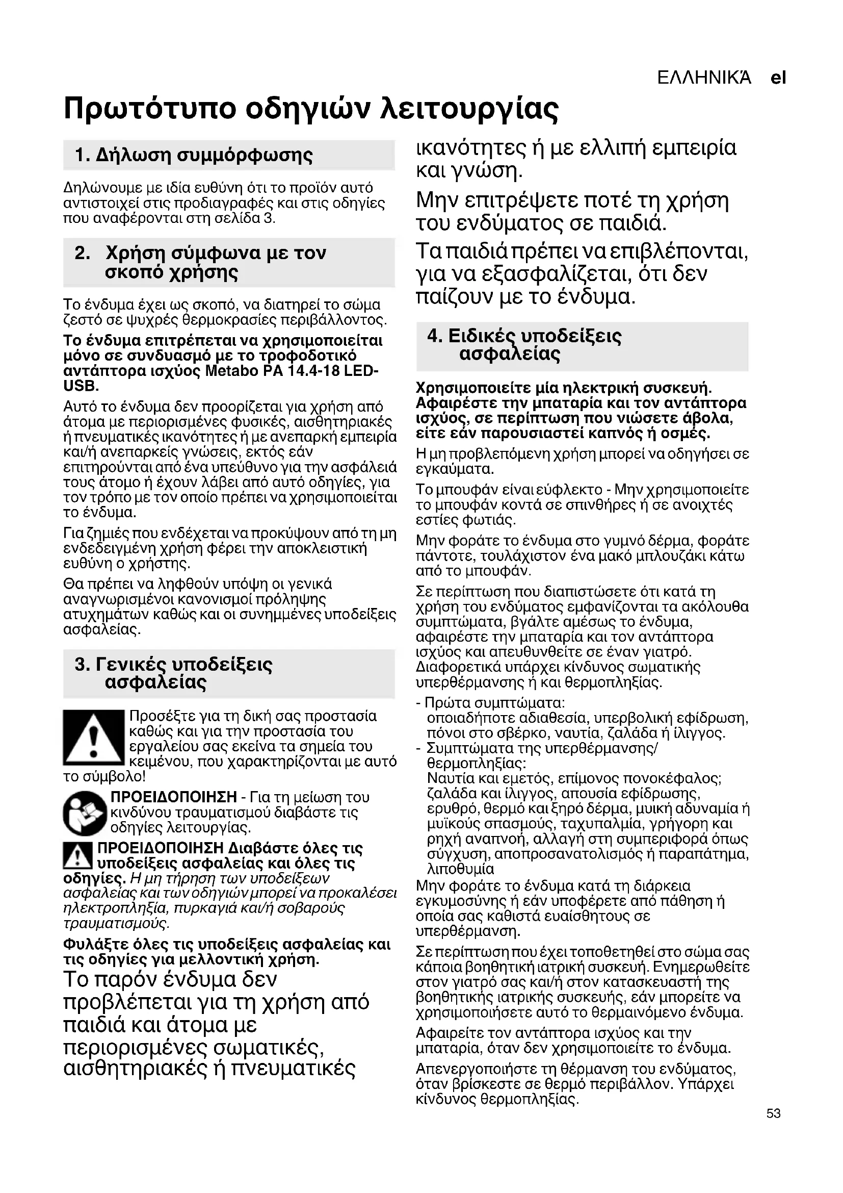 Πρωτότυπο οδηγιών λειτουργίας Δηλώνουμε με ιδία ευθύνη ότι το προϊόν αυτό αντιστοιχεί στις προδιαγραφές και στις οδηγίες που αναφέρονται στη σελίδα 3. Το ένδυμα έχει ως σκοπό, να διατηρεί το σώμα ζεστό σε ψυχρές θερμοκρασίες περιβάλλοντος. Το ένδυμα επιτρέπεται να χρησιμοποιείται μόνο σε συνδυασμό με το τροφοδοτικό αντάπτορα ισχύος Metabo PA 14.4-18 LED- USB. Αυτό το ένδυμα δεν προορίζεται για χρήση από άτομα με περιορισμένες φυσικές, αισθητηριακές ή πνευματικές ικανότητες ή με ανεπαρκή εμπειρία και/ή ανεπαρκείς γνώσεις, εκτός εάν επιτηρούνται από ένα υπεύθυνο για την ασφάλειά τους άτομο ή έχουν λάβει από αυτό οδηγίες, για τον τρόπο με τον οποίο πρέπει να χρησιμοποιείται