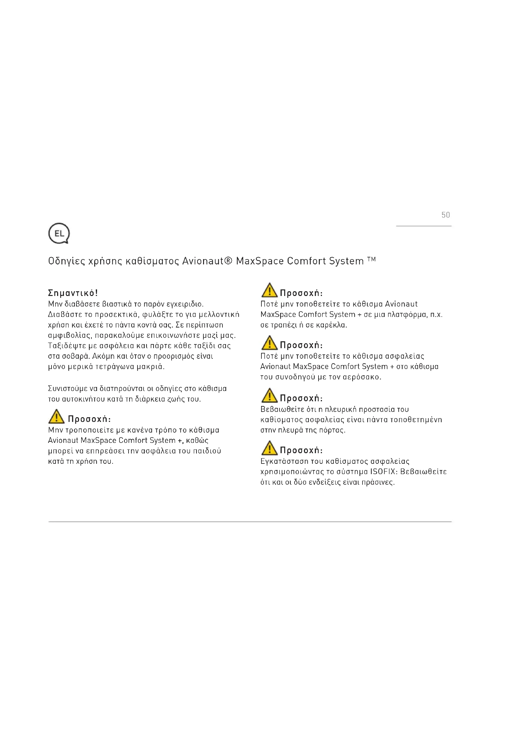 - Το κάθισμα ασφαλείας Avionaut MaxSpace Comfort System + δεν προορίζεται για οικιακή χρήση. Χρησιμοποιήστε το αποκλειστικά σε αυτοκίνητο,