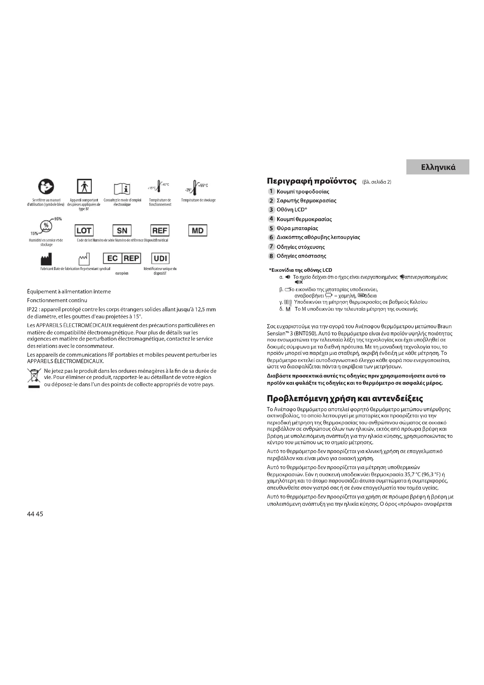 Οδηγίες απόστασης *Εικονίδια της οθόνης LCD Το ηχείο δείχνει ότι ο ήχος είναι ενεργοποιημένος ή απενεργοποιημένος β. Το εικονίδιο της μπαταρίας υποδεικνύει, αναβοσβήνει = χαμηλή, = άδεια Υποδεικνύει τη μέτρηση θερμοκρασίας σε βαθμούς Κελσίου Το M υποδεικνύει την τελευταία μέτρηση της συσκευής Σας ευχαριστούμε για την αγορά του Ανέπαφου θερμόμετρου μετώπου Braun Sensian™ 3 (BNT050). Αυτό το θερμόμετρο είναι ένα προϊόν υψηλής ποιότητας που ενσωματώνει την τελευταία λέξη της τεχνολογίας και έχει υποβληθεί σε δοκιμές σύμφωνα με τα διεθνή πρότυπα. Με τη μοναδική τεχνολογία του, το προϊόν μπορεί να παρέχει μια σταθερή, ακριβή ένδειξη με κάθε μέτρηση. Το θερμόμετρο εκτελεί αυτοδιαγνωστικό έλεγχο κάθε φορά που ενεργοποιείται, ώστε να διασφαλίζεται πάντα η ακρίβεια των μετρήσεων. Διαβάστε προσεκτικά αυτές τις οδηγίες πριν χρησιμοποιήσετε αυτό το προϊόν και φυλάξτε τις οδηγίες και το θερμόμετρο σε ασφαλές μέρος. Προβλεπόμενη χρήση και αντενδείξεις Το Ανέπαφο θερμόμετρο αποτελεί φορητό θερμόμετρο μετώπου υπέρυθρης ακτινοβολίας, το οποίο λειτουργεί με μπαταρίες και προορίζεται για την περιοδική μέτρηση της θερμοκρασίας του ανθρώπινου σώματος σε οικιακό περιβάλλον σε ανθρώπους όλων των ηλικιών, εκτός από πρόωρα βρέφη και βρέφη με υπολειπόμενη ανάπτυξη για την ηλικία κύησης, χρησιμοποιώντας το κέντρο του μετώπου ως το σημείο μέτρησης. Αυτό το θερμόμετρο δεν προορίζεται για κλινική χρήση σε επαγγελματικό περιβάλλον και είναι μόνο για οικιακή χρήση. Αυτό το θερμόμετρο δεν προορίζεται για μέτρηση υποθερμικών θερμοκρασιών. Εάν η συσκευή υποδεικνύει θερμοκρασία 35,7 °C (96,3 °F) ή χαμηλότερη και το άτομο παρουσιάζει άτυπα συμπτώματα ή συμπεριφορές, απευθυνθείτε στον γιατρό σας ή σε έναν επαγγελματία του τομέα υγείας. Αυτό το θερμόμετρο δεν προορίζεται για χρήση σε πρόωρα βρέφη ή βρέφη με υπολειπόμενη ανάπτυξη για την ηλικία κύησης. Ο όρος «πρόωρο» αναφέρεται46 47