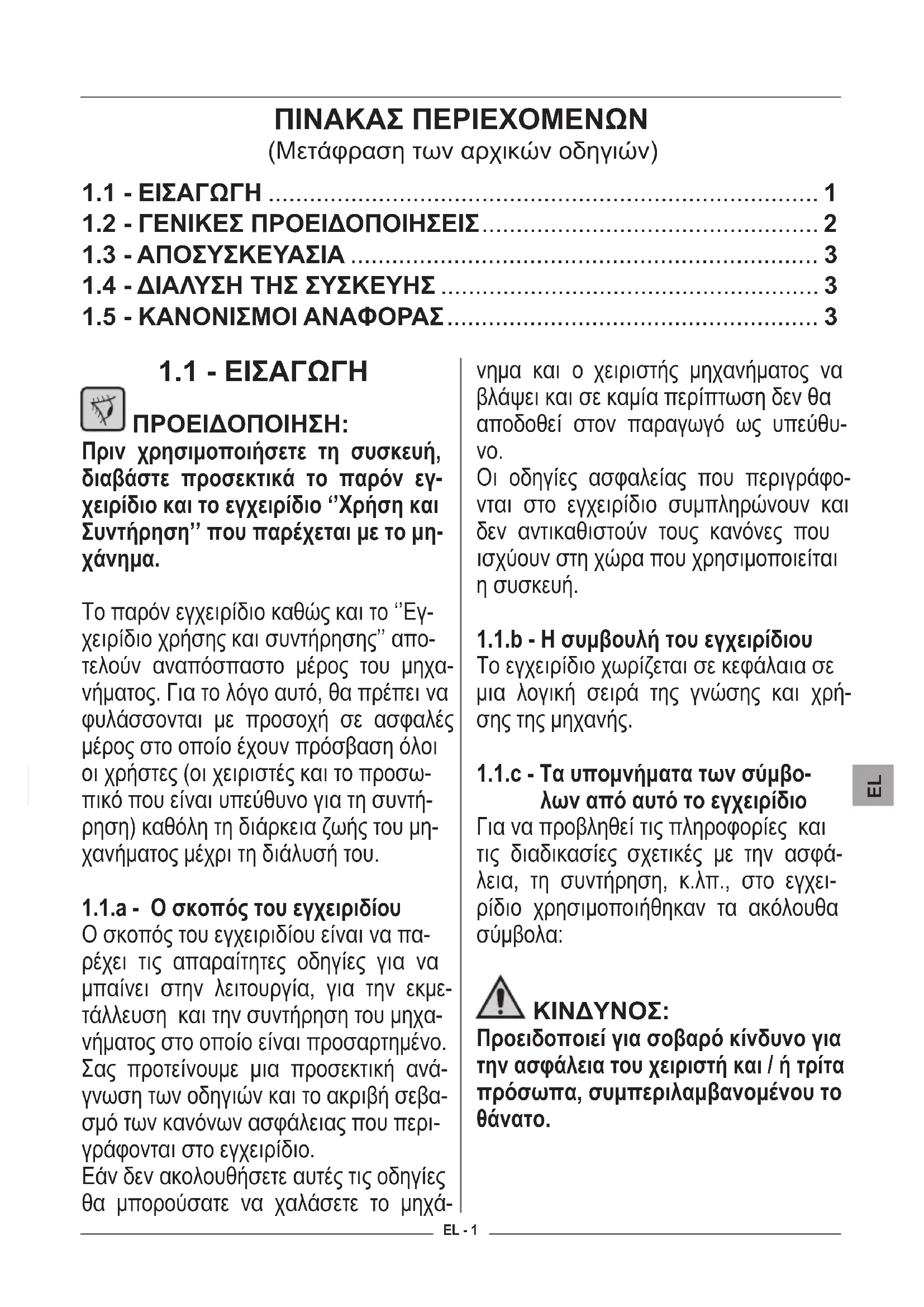 Ο σκοπός του εγχειριδίου είναι να πα- ρέχει τις απαραίτητες οδηγίες για να μπαίνει στην λειτουργία, για την εκμε- τάλλευση και την συντήρηση του μηχα- νήματος στο οποίο είναι προσαρτημένο. Σας προτείνουμε μια προσεκτική ανά- γνωση των οδηγιών και τo ακριβή σεβα- σμό των κανόνων ασφάλειας που περι- γράφονται στο εγχειρίδιο. Εάν δεν ακολουθήσετε αυτές τις οδηγίες θα μπορούσατε να χαλάσετε το μηχά- νημα και ο χειριστής μηχανήματος να βλάψει και σε καμία περίπτωση δεν θα αποδοθεί στον παραγωγό ως υπεύθυ-