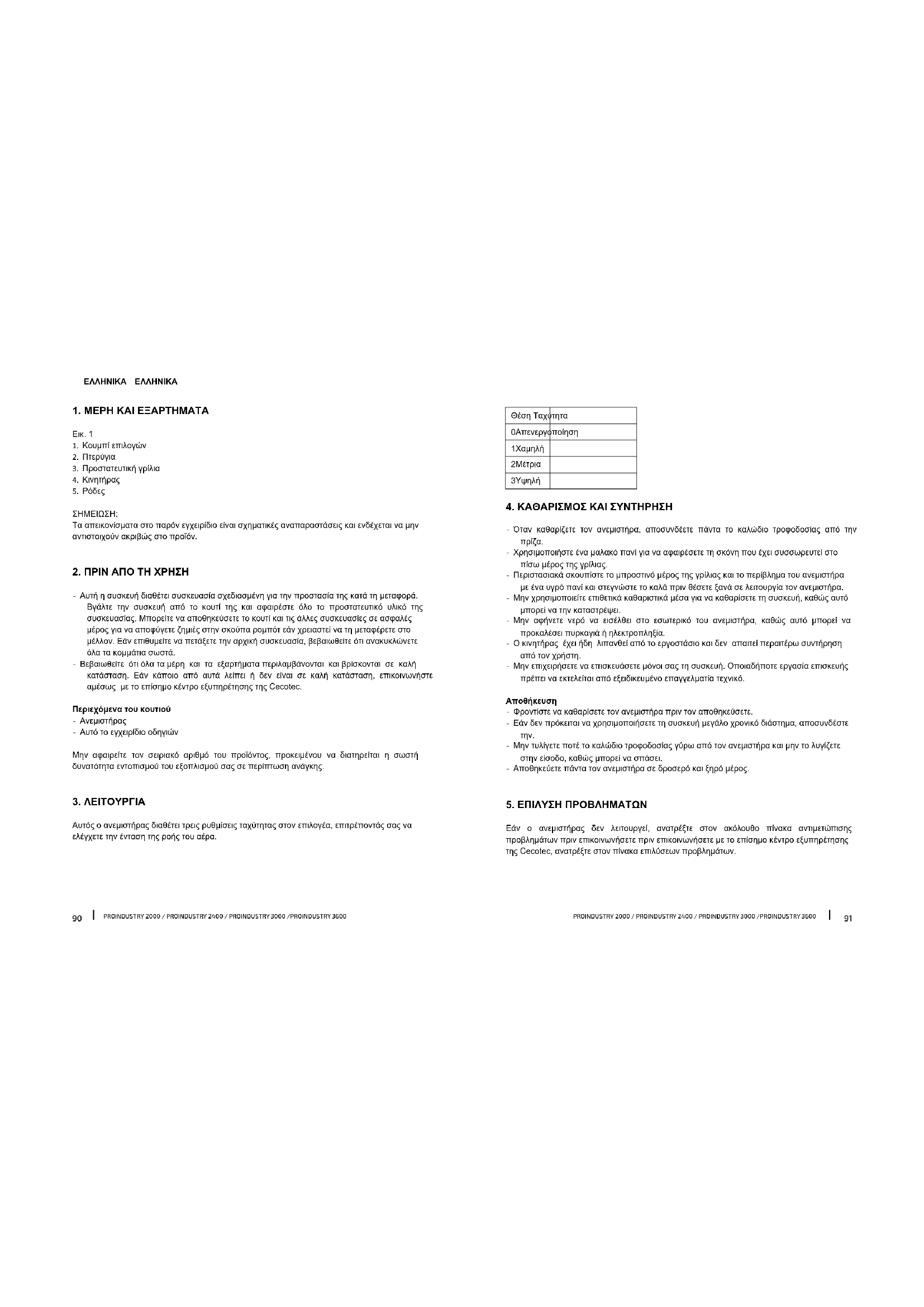 Εάν ο ανεμιστήρας δεν λειτουργεί, ανατρέξτε στον ακόλουθο πίνακα αντιμετώπισης προβλημάτων πριν επικοινωνήσετε πριν επικοινωνήσετε με το επίσημο κέντρο εξυπηρέτησης της Cecotec, ανατρέξτε στον πίνακα επιλύσεων προβλημάτων.PROINDUSTRY 2000 / PROINDUSTRY 2400 / PROINDUSTRY 3000 /PROINDUSTRY 3600PROINDUSTRY 2000 / PROINDUSTRY 2400 / PROINDUSTRY 3000 /PROINDUSTRY 3600