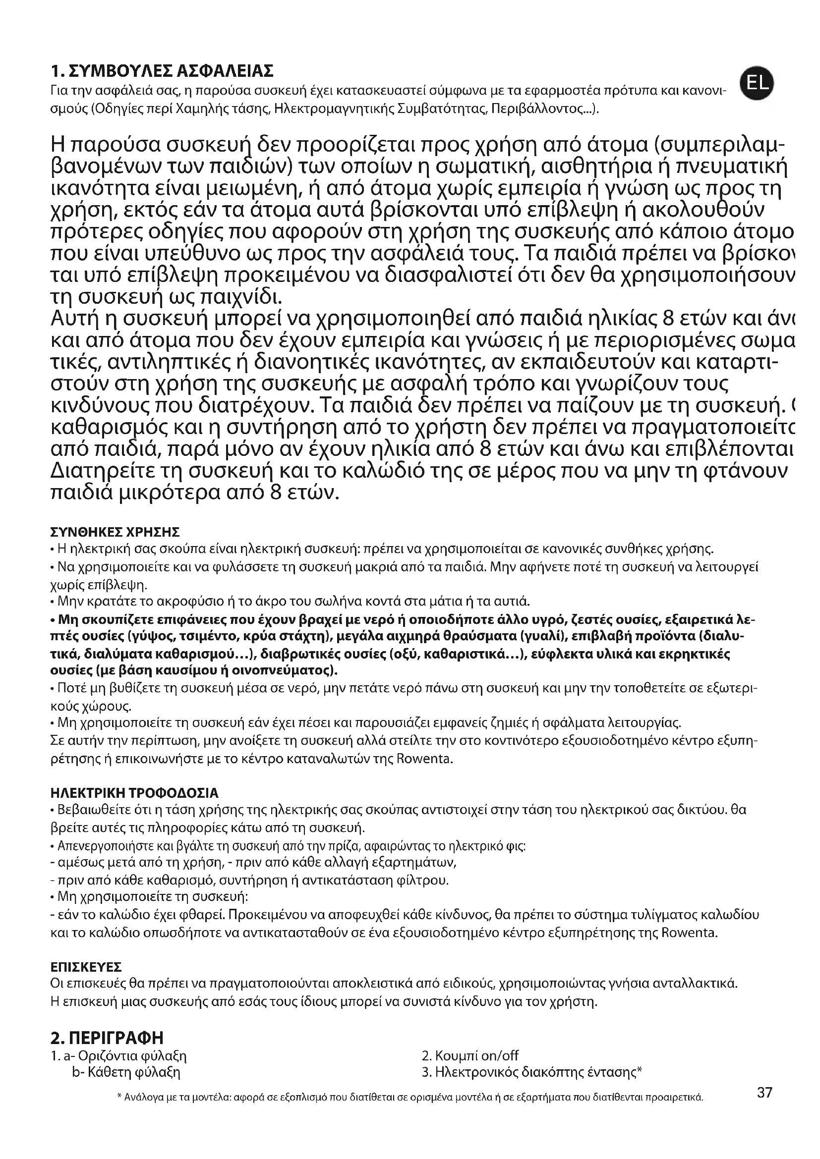 Για την ασφάλειά σας, η παρούσα συσκευή έχει κατασκευαστεί σύμφωνα με τα εφαρμοστέα πρότυπα και κανονι- σμούς (Οδηγίες περί Χαμηλής τάσης, Ηλεκτρομαγνητικής Συμβατότητας, Περιβάλλοντος...). Η παρούσα συσκευή δεν προορίζεται προς χρήση από άτομα (συμπεριλαμ- βανομένων των παιδιών) των οποίων η σωματική, αισθητήρια ή πνευματική ικανότητα είναι μειωμένη, ή από άτομα χωρίς εμπειρία ή γνώση ως προς τη χρήση, εκτός εάν τα άτομα αυτά βρίσκονται υπό επίβλεψη ή ακολουθούν πρότερες οδηγίες που αφορούν στη χρήση της συσκευής από κάποιο άτομο που είναι υπεύθυνο ως προς την ασφάλειά τους. Τα παιδιά πρέπει να βρίσκον- ται υπό επίβλεψη προκειμένου να διασφαλιστεί ότι δεν θα χρησιμοποιήσουν τη συσκευή ως παιχνίδι. Αυτή η συσκευή μπορεί να χρησιμοποιηθεί από παιδιά ηλικίας 8 ετών και άνω και από άτομα που δεν έχουν εμπειρία και γνώσεις ή με περιορισμένες σωμα- τικές, αντιληπτικές ή διανοητικές ικανότητες, αν εκπαιδευτούν και καταρτι- στούν στη χρήση της συσκευής με ασφαλή τρόπο και γνωρίζουν τους κινδύνους που διατρέχουν. Τα παιδιά δεν πρέπει να παίζουν με τη συσκευή. Ο καθαρισμός και η συντήρηση από το χρήστη δεν πρέπει να πραγματοποιείται από παιδιά, παρά μόνο αν έχουν ηλικία από 8 ετών και άνω και επιβλέπονται. Διατηρείτε τη συσκευή και το καλώδιό της σε μέρος που να μην τη φτάνουν παιδιά μικρότερα από 8 ετών. ΣΥΝΘΗΚΕΣ ΧΡΗΣΗΣ