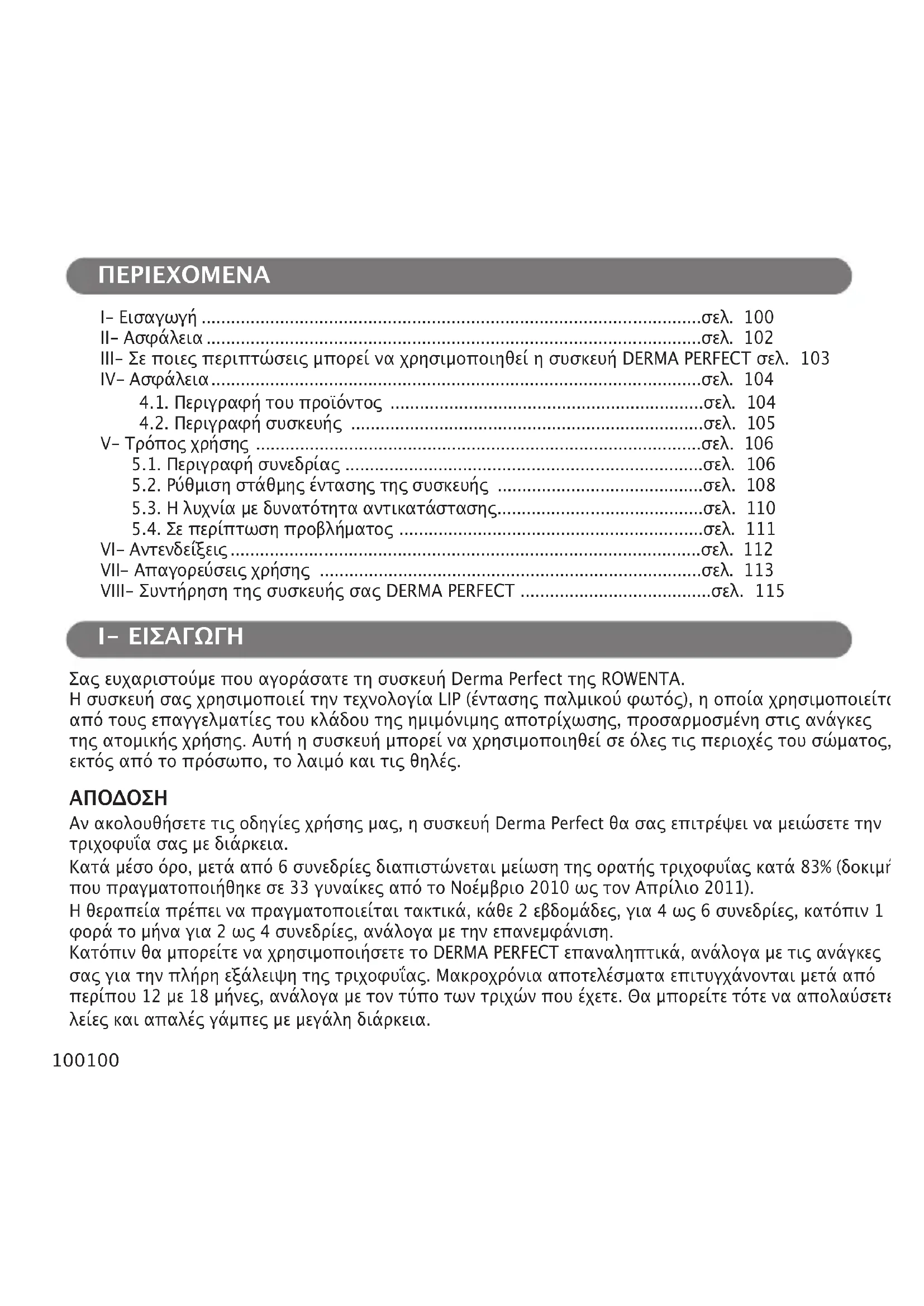 RO_EP9830_DERMA-PERFECT_1800122477_1800122477 03/02/12 15:53 Page99100100 I- Εισαγωγή ......................................................................................................σελ. 100 II- Ασφάλεια .....................................................................................................σελ. 102 III- Σε ποιες περιπτώσεις μπορεί να χρησιμοποιηθεί η συσκευή DERMA PERFECT σελ. 103 IV- Ασφάλεια....................................................................................................σελ. 104 4.1. Περιγραφή του προϊόντος ................................................................σελ. 104 4.2. Περιγραφή συσκευής ........................................................................σελ. 105 V- Τρόπος χρήσης ...........................................................................................σελ. 106 5.1. Περιγραφή συνεδρίας .........................................................................σελ. 106 5.2. Ρύθμιση στάθμης έντασης της συσκευής ..........................................σελ. 108 5.3. Η λυχνία με δυνατότητα αντικατάστασης..........................................σελ. 110 5.4. Σε περίπτωση προβλήματος ..............................................................σελ. 111 VI- Αντενδείξεις ................................................................................................σελ. 112 VII- Απαγορεύσεις χρήσης ..............................................................................σελ. 113 VIII- Συντήρηση της συσκευής σας DERMA PERFECT .......................................σελ. 115 Σας ευχαριστούμε που αγοράσατε τη συσκευή Derma Perfect της ROWENTA. Η συσκευή σας χρησιμοποιεί την τεχνολογία LIP (έντασης παλμικού φωτός), η οποία χρησιμοποιείται από τους επαγγελματίες του κλάδου της ημιμόνιμης αποτρίχωσης, προσαρμοσμένη στις ανάγκες της ατομικής χρήσης. Αυτή η συσκευή μπορεί να χρησιμοποιηθεί σε όλες τις περιοχές του σώματος, εκτός από το πρόσωπο, το λαιμό και τις θηλές.