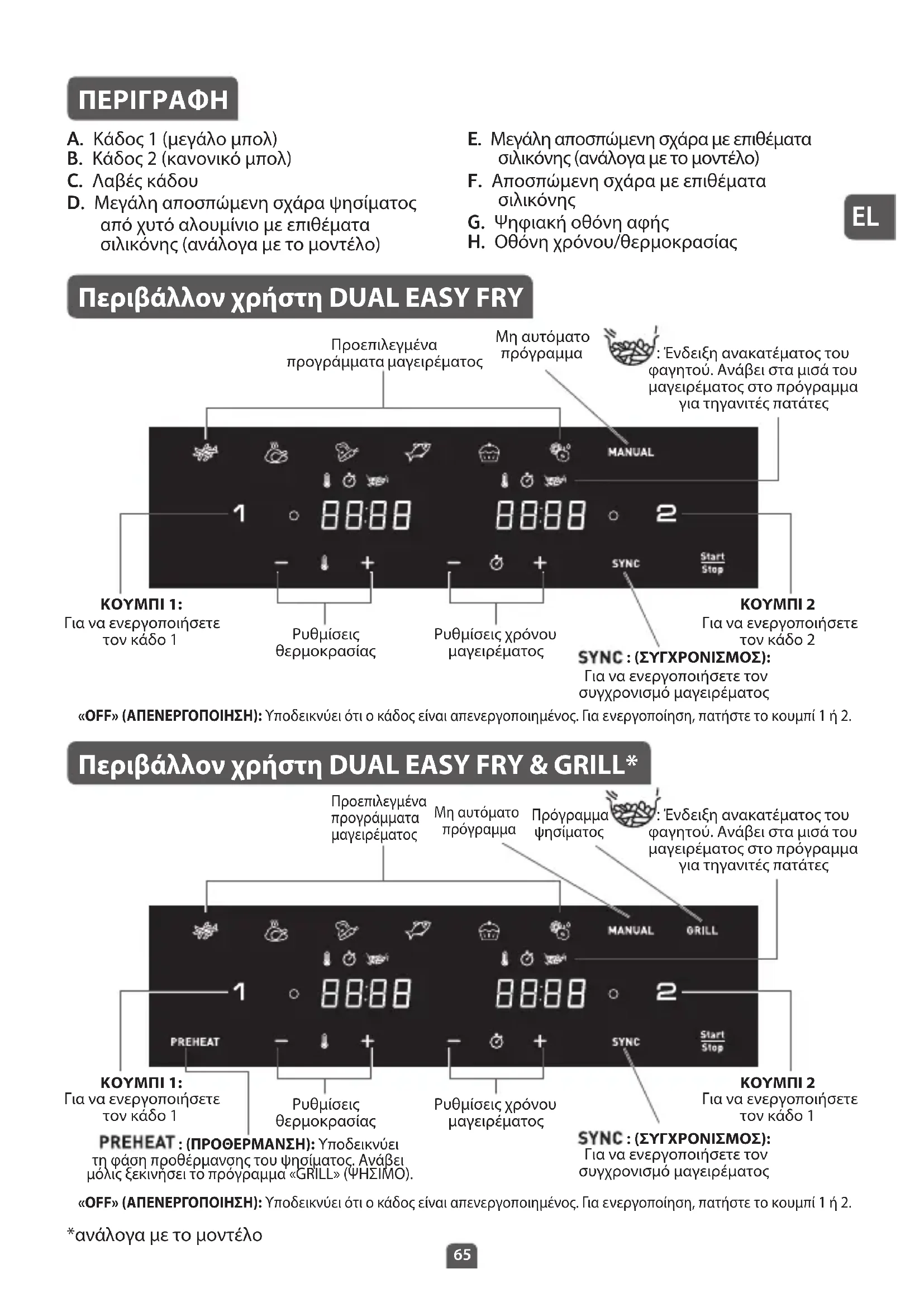 G. Ψηφιακή οθόνη αφής H. Οθόνη χρόνου/θερμοκρασίας Περιβάλλον χρήστη DUAL EASY FRY Περιβάλλον χρήστη DUAL EASY FRY & GRILL* «OFF» (ΑΠΕΝΕΡΓΟΠΟΙΗΣΗ): Υποδεικνύει ότι ο κάδος είναι απενεργοποιημένος. Για ενεργοποίηση, πατήστε το κουμπί 1 ή 2. «OFF» (ΑΠΕΝΕΡΓΟΠΟΙΗΣΗ): Υποδεικνύει ότι ο κάδος είναι απενεργοποιημένος. Για ενεργοποίηση, πατήστε το κουμπί 1 ή 2. : (ΠΡΟΘΕΡΜΑΝΣΗ): Υποδεικνύει τη φάση προθέρμανσης του ψησίματος. Ανάβει μόλις ξεκινήσει το πρόγραμμα «GRILL» (ΨΗΣΙΜΟ). *ανάλογα με το μοντέλο Προεπιλεγμένα προγράμματα μαγειρέματος : Ένδειξη ανακατέματος του φαγητού. Ανάβει στα μισά του μαγειρέματος στο πρόγραμμα για τηγανιτές πατάτες Μη αυτόματο