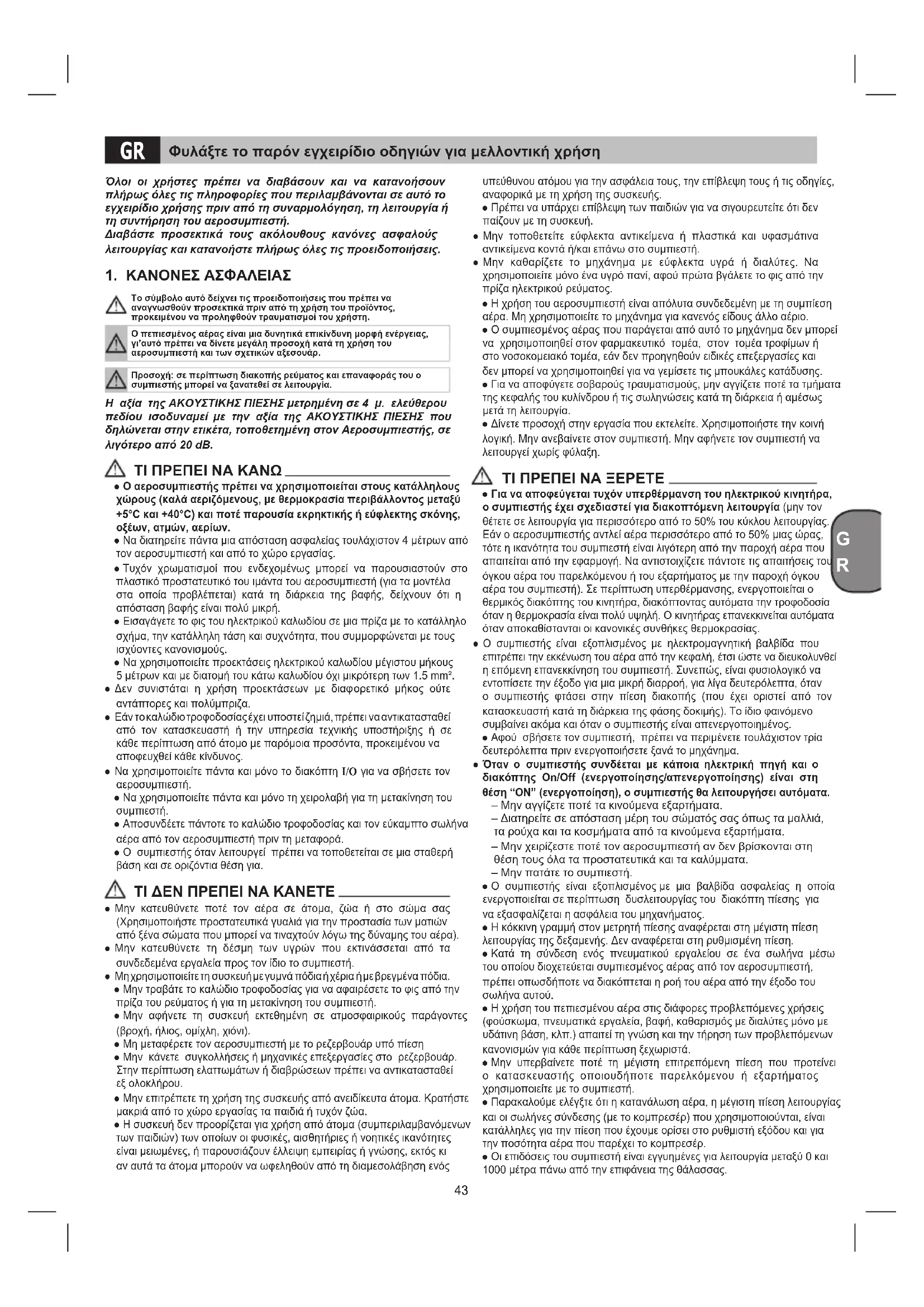 Το σύμβολο αυτό δείχνει τις προειδοποιήσεις που πρέπει να αναγνωσθούν προσεκτικά πριν από τη χρήση του προϊόντος, προκειμένου να προληφθούν τραυματισμοί του χρήστη.Ο πεπιεσμένος αέρας είναι μια δυνητικά επικίνδυνη μορφή ενέργειας, γι’αυτό πρέπει να δίνετε μεγάλη προσοχή κατά τη χρήση του αεροσυμπιεστή και των σχετικών αξεσουάρ.Προσοχή: σε περίπτωση διακοπής ρεύματος και επαναφοράς του ο συμπιεστής μπορεί να ξανατεθεί σε λειτουργία. Η αξία της ΑΚΟΥΣΤΙΚΗΣ ΠΙΕΣΗΣ μετρημένη σε 4 μ. ελεύθερου πεδίου ισοδυναμεί με την αξία της ΑΚΟΥΣΤΙΚΗΣ ΠΙΕΣΗΣ που δηλώνεται στην ετικέτα, τοποθετημένη στον Αεροσυμπιεστής, σε λιγότερο από 20 dB. ΤΙ ΠΡΕΠΕΙ ΝΑ ΚΑΝΩ ● Ο αεροσυμπιεστής πρέπει να χρησιμοποιείται στους κατάλληλους χώρους (καλά αεριζόμενους, με θερμοκρασία περιβάλλοντος μεταξύ +5°C και +40°C) και ποτέ παρουσία εκρηκτικής ή εύφλεκτης σκόνης, οξέων, ατμών, αερίων. ● Να διατηρείτε πάντα μια απόσταση ασφαλείας τουλάχιστον 4 μέτρων από τον αεροσυμπιεστή και από το χώρο εργασίας. ● Τυχόν χρωματισμοί που ενδεχομένως μπορεί να παρουσιαστούν στο πλαστικό προστατευτικό του ιμάντα του αεροσυμπιεστή (για τα μοντέλα στα οποία προβλέπεται) κατά τη διάρκεια της βαφής, δείχνουν ότι η απόσταση βαφής είναι πολύ μικρή. ● Εισαγάγετε το φις του ηλεκτρικού καλωδίου σε μια πρίζα με το κατάλληλο σχήμα, την κατάλληλη τάση και συχνότητα, που συμμορφώνεται με τους ισχύοντες κανονισμούς. ● Να χρησιμοποιείτε προεκτάσεις ηλεκτρικού καλωδίου μέγιστου μήκους 5 μέτρων και με διατομή του κάτω καλωδίου όχι μικρότερη των 1.5 mm². ● Δεν συνιστάται η χρήση προεκτάσεων με διαφορετικό μήκος ούτε αντάπτορες και πολύμπριζα. ● Εάν το καλώδιο τροφοδοσίας έχει υποστεί ζημιά, πρέπει να αντικατασταθεί από τον κατασκευαστή ή την υπηρεσία τεχνικής υποστήριξης ή σε κάθε περίπτωση από άτομο με παρόμοια προσόντα, προκειμένου να αποφευχθεί κάθε κίνδυνος. ● Να χρησιμοποιείτε πάντα και μόνο το διακόπτη I/O για να σβήσετε τον αεροσυμπιεστή. ● Να χρησιμοποιείτε πάντα και μόνο τη χειρολαβή για τη μετακίνηση του