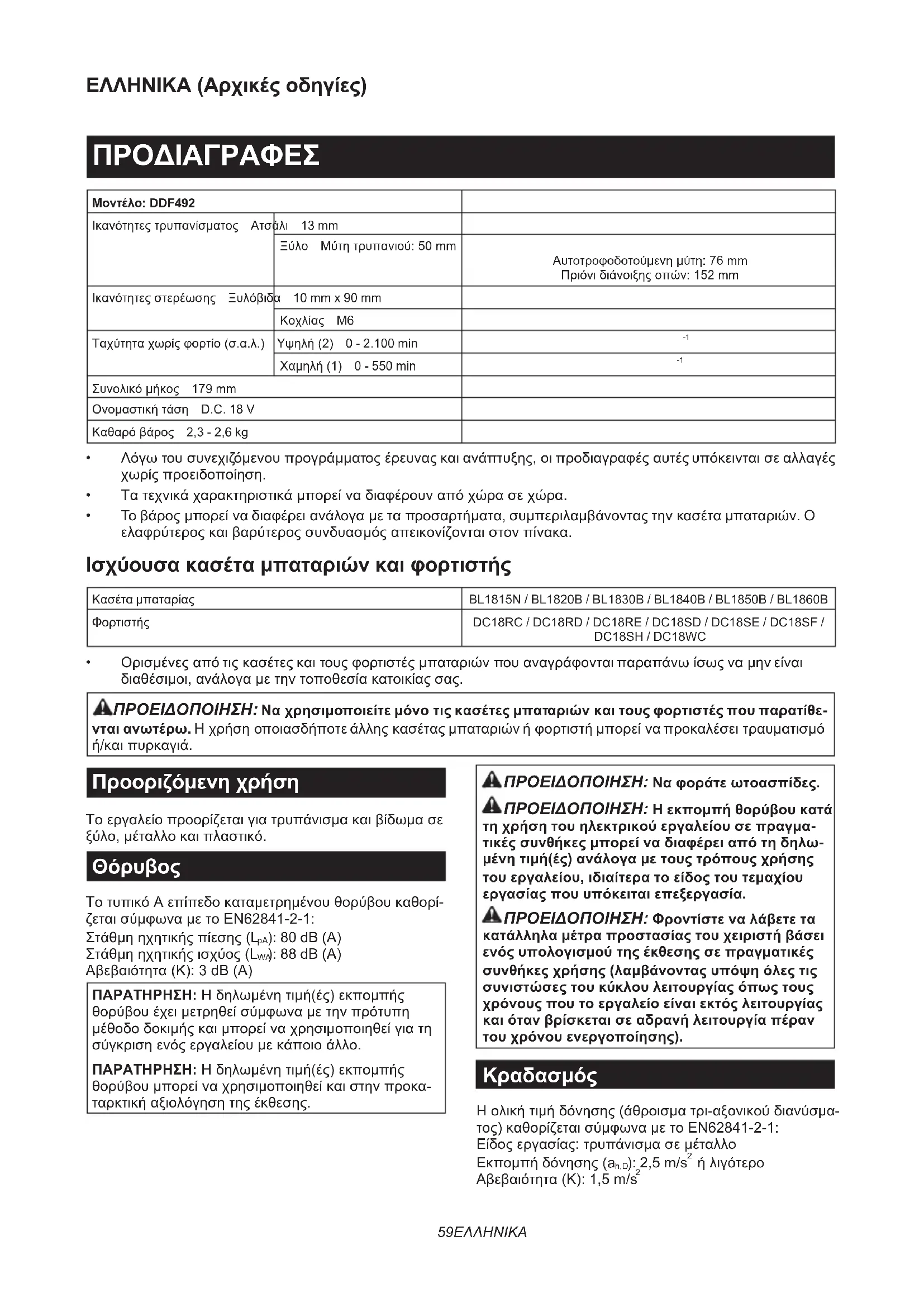 - Almofada de polir de espuma NOTA: Alguns itens da lista podem estar incluídos na embalagem da ferramenta como acessórios padrão. Eles podem variar de país para país.59 ΕΛΛΗΝΙΚΑ ΕΛΛΗΝΙΚΑ (Αρχικές οδηγίες) ΠΡΟΔΙΑΓΡΑΦΕΣ Μοντέλο: DDF492 Ικανότητεςτρυπανίσματος Ατσάλι 13 mm Ξύλο Μύτητρυπανιού:50mm Αυτοτροφοδοτούμενημύτη:76mm Πριόνιδιάνοιξηςοπών:152mm Ικανότητεςστερέωσης Ξυλόβιδα 10 mm x 90 mm Κοχλίας M6 Ταχύτηταχωρίςφορτίο(σ.α.λ.) Υψηλή(2) 0 - 2.100 min