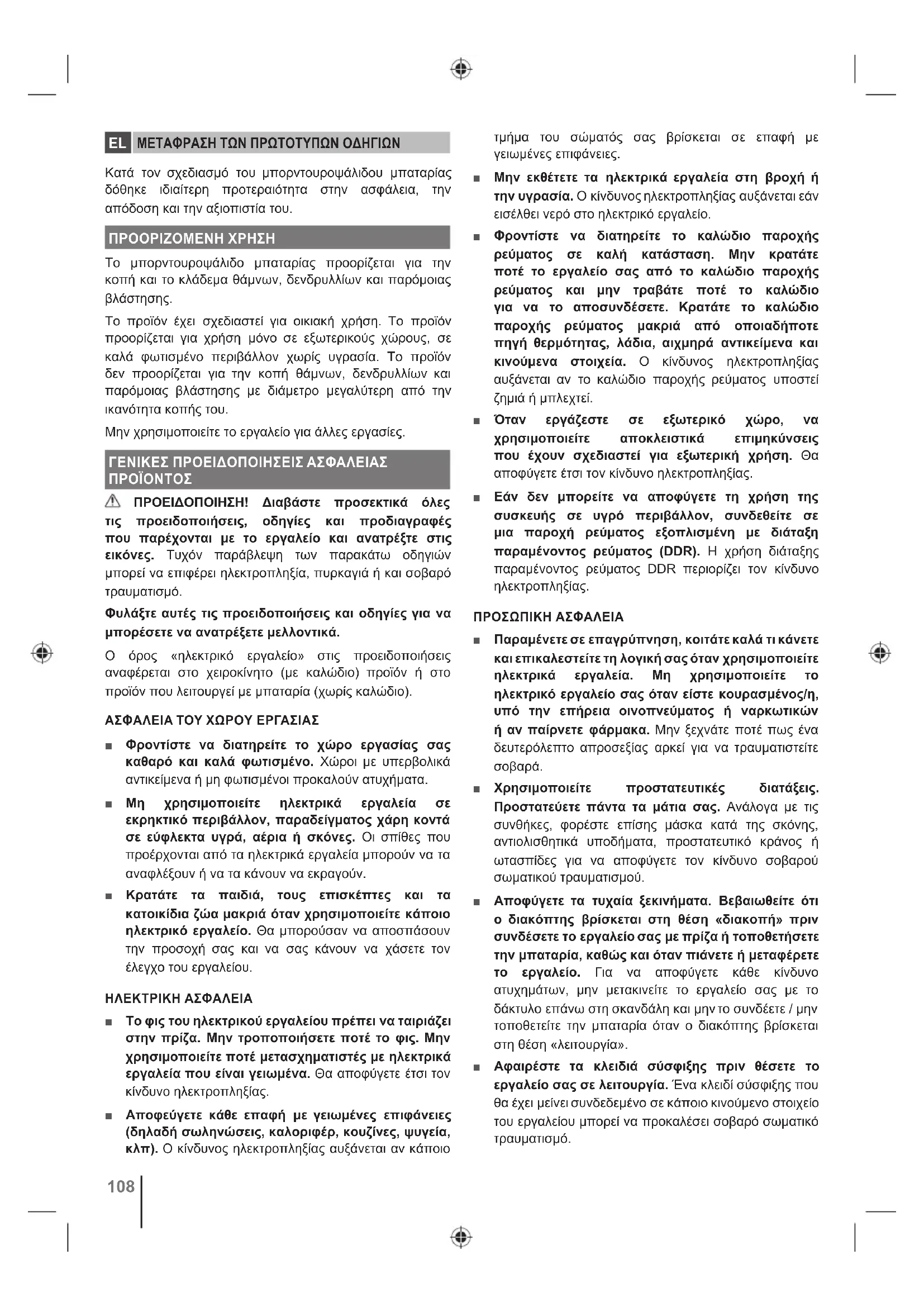 ΠΡΟΕΙΔΟΠΟΙΗΣΗ! Διαβάστε προσεκτικά όλες τις προειδοποιήσεις, οδηγίες και προδιαγραφές που παρέχονται με το εργαλείο και ανατρέξτε στις εικόνες. Τυχόν παράβλεψη των παρακάτω οδηγιών μπορεί να επιφέρει ηλεκτροπληξία, πυρκαγιά ή και σοβαρό τραυματισμό. Φυλάξτε αυτές τις προειδοποιήσεις και οδηγίες για να μπορέσετε να ανατρέξετε μελλοντικά. Ο όρος «ηλεκτρικό εργαλείο» στις προειδοποιήσεις αναφέρεται στο χειροκίνητο (με καλώδιο) προϊόν ή στο προϊόν που λειτουργεί με μπαταρία (χωρίς καλώδιο). ΑΣΦΑΛΕΙΑ ΤΟΥ ΧΩΡΟΥ ΕΡΓΑΣΙΑΣ ■ Φροντίστε να διατηρείτε το χώρο εργασίας σας καθαρό και καλά φωτισμένο. Χώροι με υπερβολικά αντικείμενα ή μη φωτισμένοι προκαλούν ατυχήματα. ■ Μη χρησιμοποιείτε ηλεκτρικά εργαλεία σε εκρηκτικό περιβάλλον, παραδείγματος χάρη κοντά σε εύφλεκτα υγρά, αέρια ή σκόνες. Οι σπίθες που προέρχονται από τα ηλεκτρικά εργαλεία μπορούν να τα αναφλέξουν ή να τα κάνουν να εκραγούν. ■ Κρατάτε τα παιδιά, τους επισκέπτες και τα κατοικίδια ζώα μακριά όταν χρησιμοποιείτε κάποιο ηλεκτρικό εργαλείο. Θα μπορούσαν να αποσπάσουν την προσοχή σας και να σας κάνουν να χάσετε τον έλεγχο του εργαλείου. ΗΛΕΚΤΡΙΚΗ ΑΣΦΑΛΕΙΑ ■ Το φις του ηλεκτρικού εργαλείου πρέπει να ταιριάζει στην πρίζα. Μην τροποποιήσετε ποτέ το φις. Μην χρησιμοποιείτε ποτέ μετασχηματιστές με ηλεκτρικά εργαλεία που είναι γειωμένα. Θα αποφύγετε έτσι τον κίνδυνο ηλεκτροπληξίας. ■ Αποφεύγετε κάθε επαφή με γειωμένες επιφάνειες (δηλαδή σωληνώσεις, καλοριφέρ, κουζίνες, ψυγεία, κλπ). Ο κίνδυνος ηλεκτροπληξίας αυξάνεται αν κάποιο τμήμα του σώματός σας βρίσκεται σε επαφή με γειωμένες επιφάνειες. ■ Μην εκθέτετε τα ηλεκτρικά εργαλεία στη βροχή ή την υγρασία. Ο κίνδυνος ηλεκτροπληξίας αυξάνεται εάν εισέλθει νερό στο ηλεκτρικό εργαλείο. ■ Φροντίστε να διατηρείτε το καλώδιο παροχής ρεύματος σε καλή κατάσταση. Μην κρατάτε ποτέ το εργαλείο σας από το καλώδιο παροχής ρεύματος και μην τραβάτε ποτέ το καλώδιο για να το αποσυνδέσετε. Κρατάτε το καλώδιο παροχής ρεύματος μακριά από οποιαδήποτε πηγή θερμότητας, λάδια, αιχμηρά αντικείμενα και κινούμενα στοιχεία. Ο κίνδυνος ηλεκτροπληξίας αυξάνεται αν το καλώδιο παροχής ρεύματος υποστεί ζημιά ή μπλεχτεί. ■ Όταν εργάζεστε σε εξωτερικό χώρο, να χρησιμοποιείτε αποκλειστικά επιμηκύνσεις που έχουν σχεδιαστεί για εξωτερική χρήση. Θα αποφύγετε έτσι τον κίνδυνο ηλεκτροπληξίας. ■ Εάν δεν μπορείτε να αποφύγετε τη χρήση της συσκευής σε υγρό περιβάλλον, συνδεθείτε σε μια παροχή ρεύματος εξοπλισμένη με διάταξη παραμένοντος ρεύματος (DDR). Η χρήση διάταξης παραμένοντος ρεύματος DDR περιορίζει τον κίνδυνο ηλεκτροπληξίας. ΠΡΟΣΩΠΙΚΗ ΑΣΦΑΛΕΙΑ ■ Παραμένετε σε επαγρύπνηση, κοιτάτε καλά τι κάνετε και επικαλεστείτε τη λογική σας όταν χρησιμοποιείτε ηλεκτρικά εργαλεία. Μη χρησιμοποιείτε το ηλεκτρικό εργαλείο σας όταν είστε κουρασμένος/η, υπό την επήρεια οινοπνεύματος ή ναρκωτικών ή αν παίρνετε φάρμακα. Μην ξεχνάτε ποτέ πως ένα δευτερόλεπτο απροσεξίας αρκεί για να τραυματιστείτε