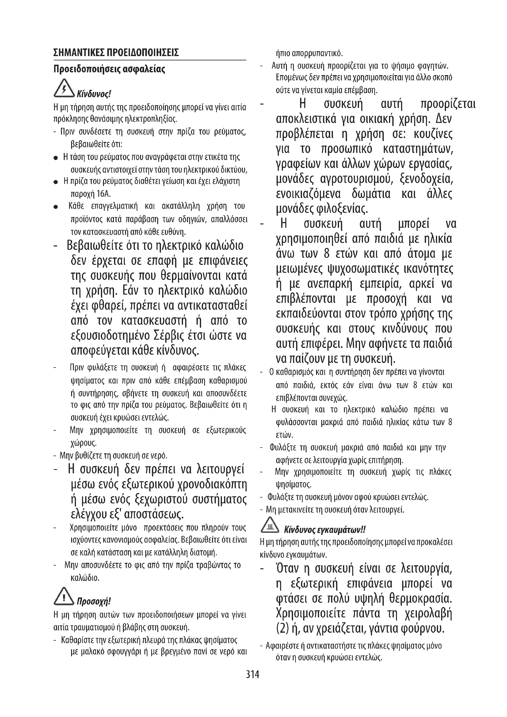 Η μη τήρηση αυτών των προειδοποιήσεων μπορεί να γίνει αιτία τραυματισμού ή βλάβης στη συσκευή. - Καθαρίστε την εξωτερική πλευρά της πλάκας ψησίματος με μαλακό σφουγγάρι ή με βρεγμένο πανί σε νερό και ήπιο απορρυπαντικό. - Αυτή η συσκευή προορίζεται για το ψήσιμο φαγητών. Επομένως δεν πρέπει να χρησιμοποιείται για άλλο σκοπό ούτε να γίνεται καμία επέμβαση. - Η συσκευή αυτή προορίζεται αποκλειστικά για οικιακή χρήση. Δεν προβλέπεται η χρήση σε: κουζίνες για το προσωπικό καταστημάτων, γραφείων και άλλων χώρων εργασίας, μονάδες αγροτουρισμού, ξενοδοχεία, ενοικιαζόμενα δωμάτια και άλλες μονάδες φιλοξενίας. - Η συσκευή αυτή μπορεί να χρησιμοποιηθεί από παιδιά με ηλικία άνω των 8 ετών και από άτομα με μειωμένες ψυχοσωματικές ικανότητες ή με ανεπαρκή εμπειρία, αρκεί να επιβλέπονται με προσοχή και να εκπαιδεύονται στον τρόπο χρήσης της συσκευής και στους κινδύνους που αυτή επιφέρει. Μην αφήνετε τα παιδιά να παίζουν με τη συσκευή. - Ο καθαρισμός και η συντήρηση δεν πρέπει να γίνονται από παιδιά, εκτός εάν είναι άνω των 8 ετών και επιβλέπονται συνεχώς. Η συσκευή και το ηλεκτρικό καλώδιο πρέπει να φυλάσσονται μακριά από παιδιά ηλικίας κάτω των 8