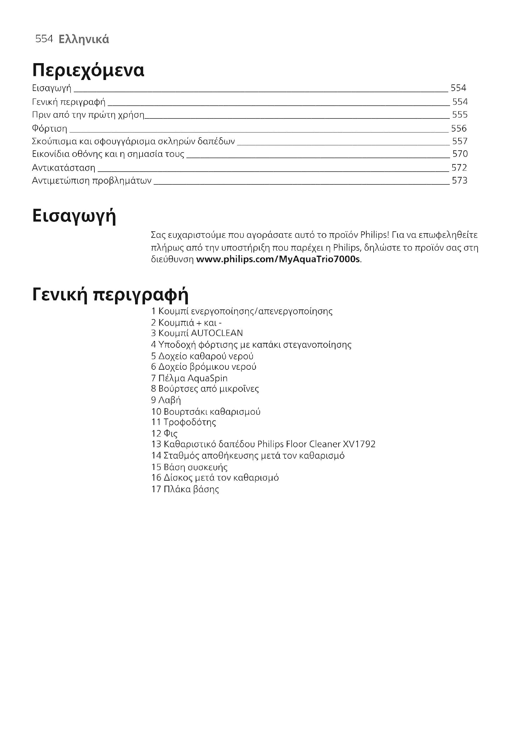 Σας ευχαριστούμε που αγοράσατε αυτό το προϊόν Philips! Για να επωφεληθείτε πλήρως από την υποστήριξη που παρέχει η Philips, δηλώστε το προϊόν σας στη διεύθυνση www.philips.com/MyAquaTrio7000s. Γενική περιγραφή 1 Κουμπί ενεργοποίησης/απενεργοποίησης 2 Κουμπιά + και - 3 Κουμπί AUTOCLEAN 4 Υποδοχή φόρτισης με καπάκι στεγανοποίησης 5 Δοχείο καθαρού νερού 6 Δοχείο βρόμικου νερού 7 Πέλμα AquaSpin 8 Βούρτσες από μικροΐνες 9 Λαβή 10 Βουρτσάκι καθαρισμού 11 Τροφοδότης 12 Φις 13 Καθαριστικό δαπέδου Philips Floor Cleaner XV1792 14 Σταθμός αποθήκευσης μετά τον καθαρισμό 15 Βάση συσκευής 16 Δίσκος μετά τον καθαρισμό 17 Πλάκα βάσης555