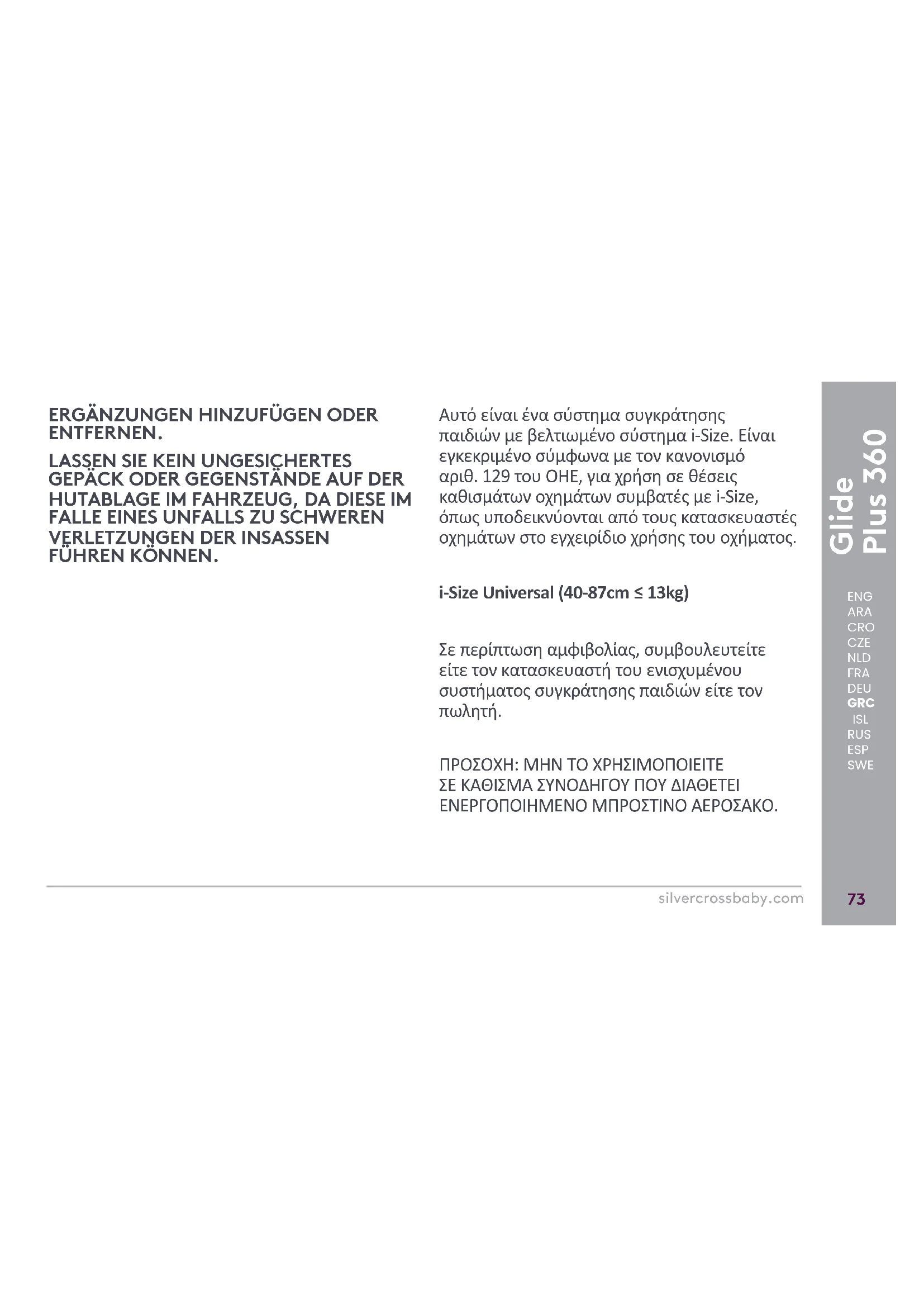 ΣΗΜΕΙΩΣΗ! Το Glide Plus 360 μπορεί να τοποθετηθεί με τη ζώνη ασφαλείας του οχήματος χρησιμοποιώντας οποιαδήποτε από τις τρεις θέσεις ανάκλισης. ΣΗΜΕΙΩΣΗ! Το Glide Plus 360 μπορεί να εγκατασταθεί μόνο με φορά προς τα πίσω. Δεν πρέπει ποτέ να τοποθετείται στραμμένο προς το μπροστινό μέρος του οχήματος. ENG ARA CRO CZE NLD FRA DEU GRC ISL RUS ESP SWEGlide Plus 360 silvercrossbaby.com