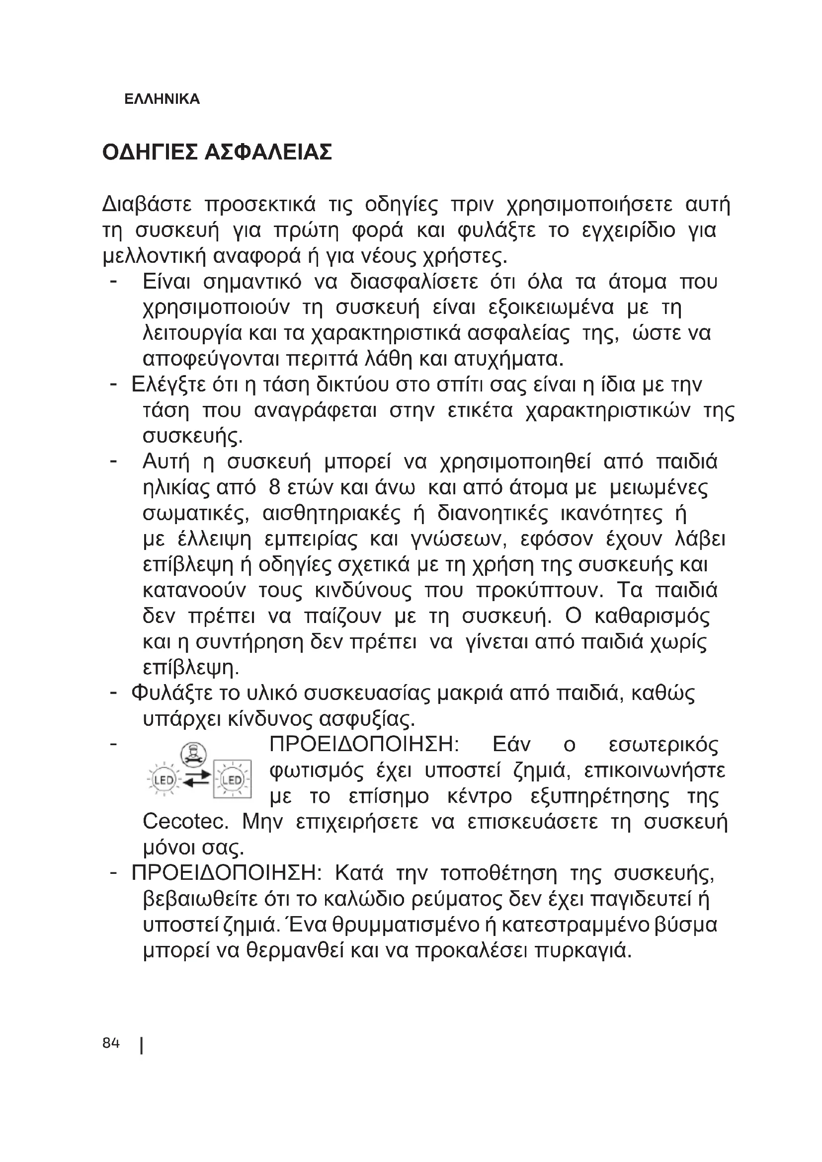 ΟΔΗΓΊΕΣ ΑΣΦΑΛΕΊΑΣ Διαβάστε προσεκτικά τις οδηγίες πριν χρησιμοποιήσετε αυτή τη συσκευή για πρώτη φορά και φυλάξτε το εγχειρίδιο για μελλοντική αναφορά ή για νέους χρήστες. - Είναι σημαντικό να διασφαλίσετε ότι όλα τα άτομα που χρησιμοποιούν τη συσκευή είναι εξοικειωμένα με τη λειτουργία και τα χαρακτηριστικά ασφαλείας της, ώστε να αποφεύγονται περιττά λάθη και ατυχήματα. - Ελέγξτε ότι η τάση δικτύου στο σπίτι σας είναι η ίδια με την τάση που αναγράφεται στην ετικέτα χαρακτηριστικών της